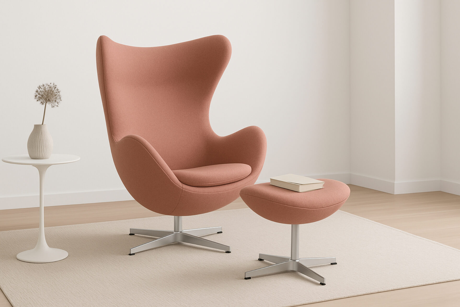 The Egg chair is a revered icon inspired by 1950s aesthetics, perched on a sturdy, swiveling metal base. Its contoured frame and seat exude luxury and comfort, blending form and function seamlessly. As a timeless symbol of sophistication, it offers convenience and flexibility. The modern wing chair, known for its iconic design, is a symbol of prestige with unmatched ergonomic shape. A testament to style and comfort, it transcends passing trends in distinguished homes and offices. Celebrated globally for its comfort and striking design, it stands as a design history classic with its elegant wings and airy base. Crafted with premium materials and hand-stitched finishes, the Jacobsen Chair in Vintage Pink Wool offers unparalleled luxury. Each meticulously created chair embodies the highest standards of quality and precision, ensuring enduring elegance for generations to come.
