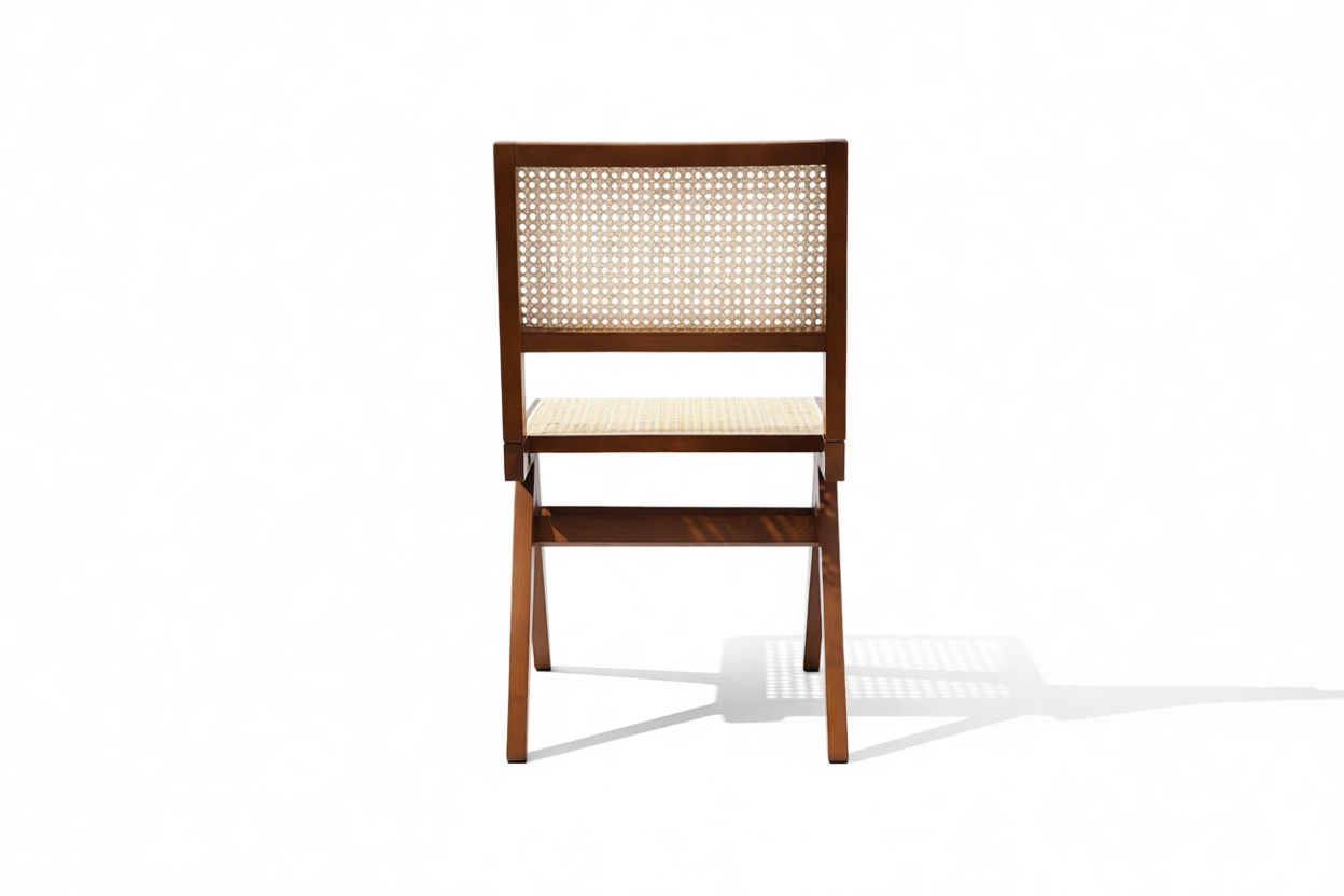 Inspired by the design trends of the 1950s, the Pierre Jeanneret Dining Chair perfectly captures the essence of mid-century modern style. Handcrafted with a walnut wooden frame and accented with rattan details, this chic chair seamlessly combines comfort and durability. Experience upscale dining with this stylish and long-lasting piece, ideal for gatherings and everyday use.