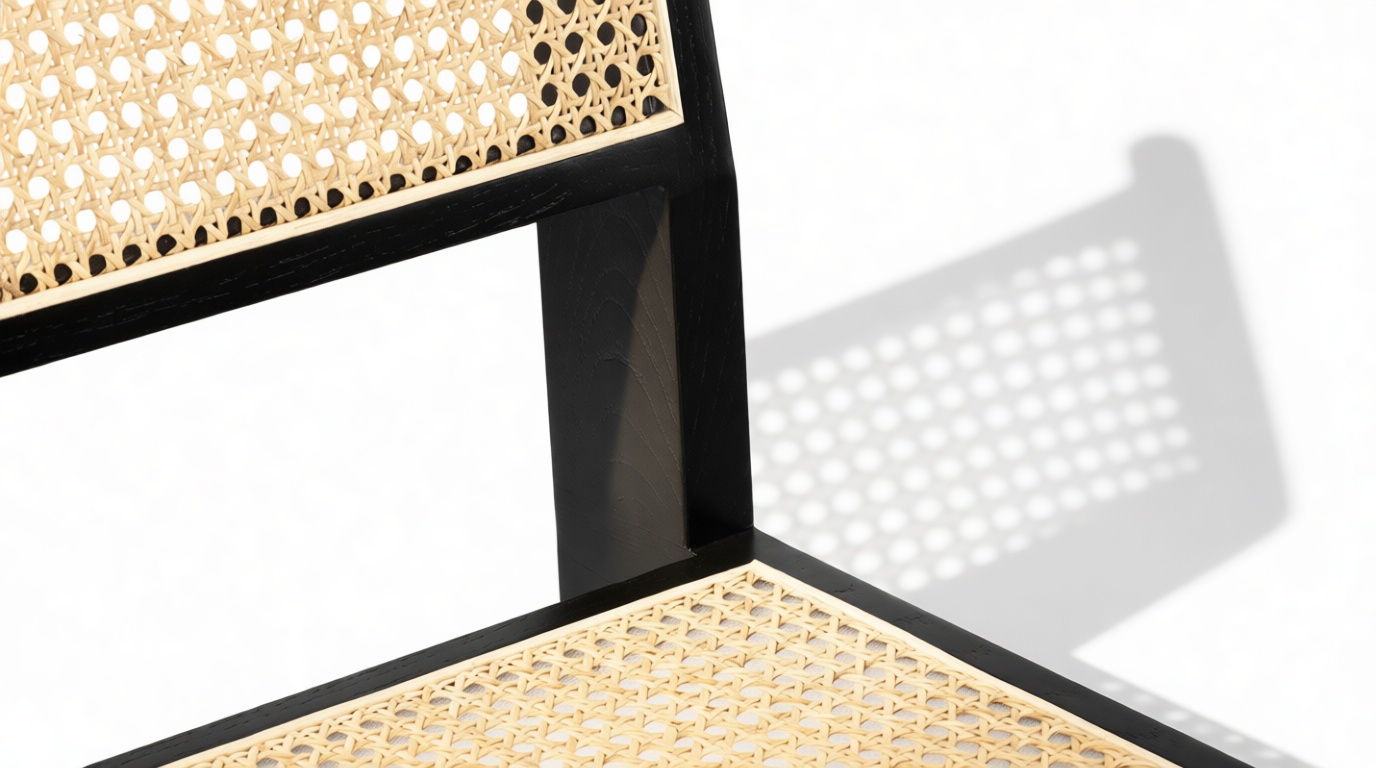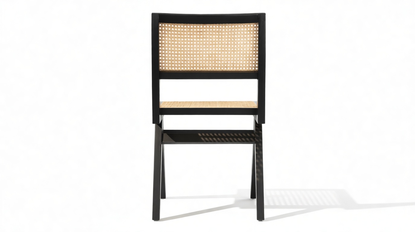 Experience the timeless elegance of the Pierre Jeanneret Dining Chair, inspired by 1950s design trends. The campaign-style chair beautifully blends natural wood and rattan in its mid-century modern structure. Suitable for family gatherings or casual brunches, the black rattan details add sophistication to this chic and durable piece, featuring a sturdy frame for lasting comfort and support.