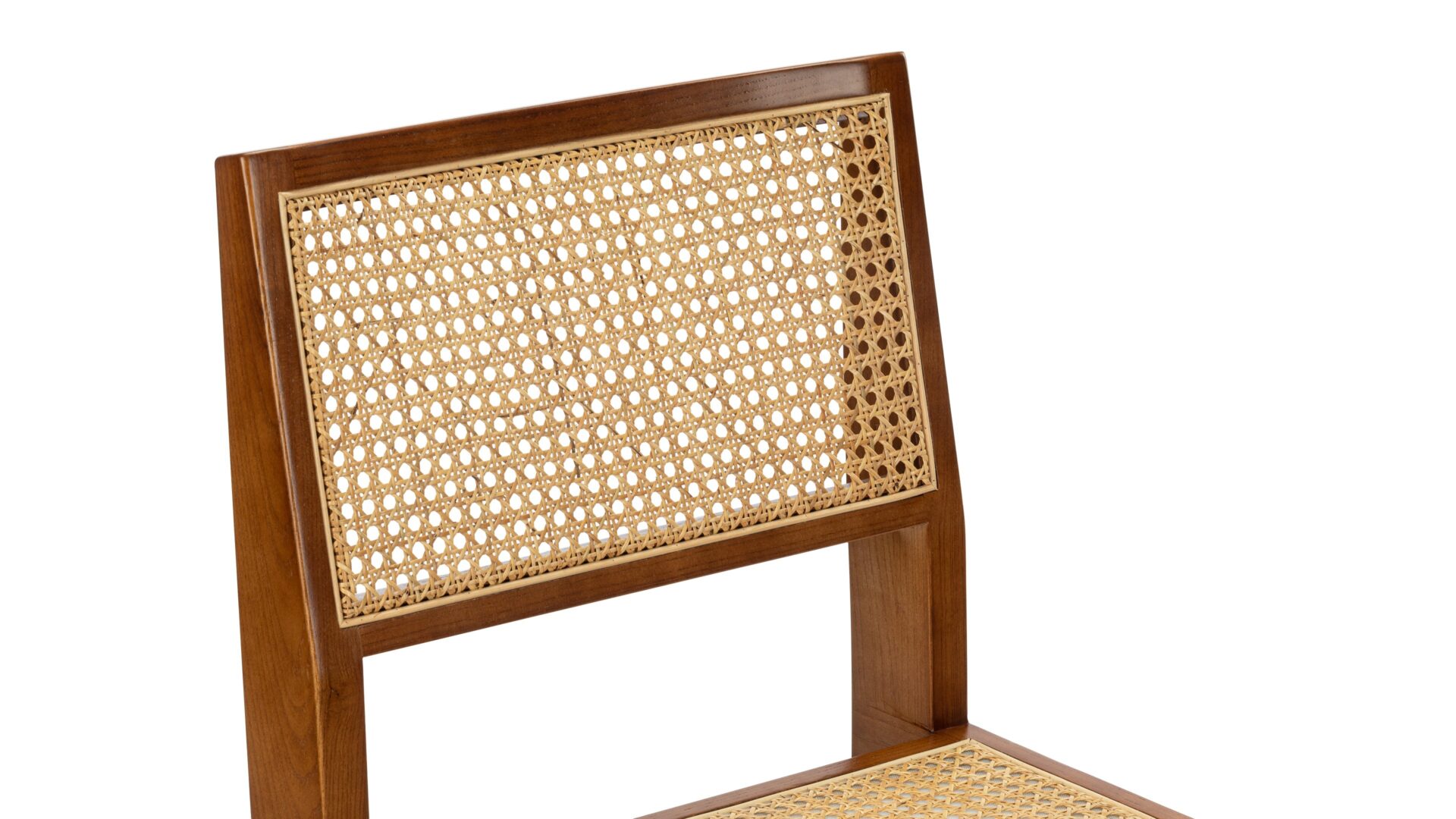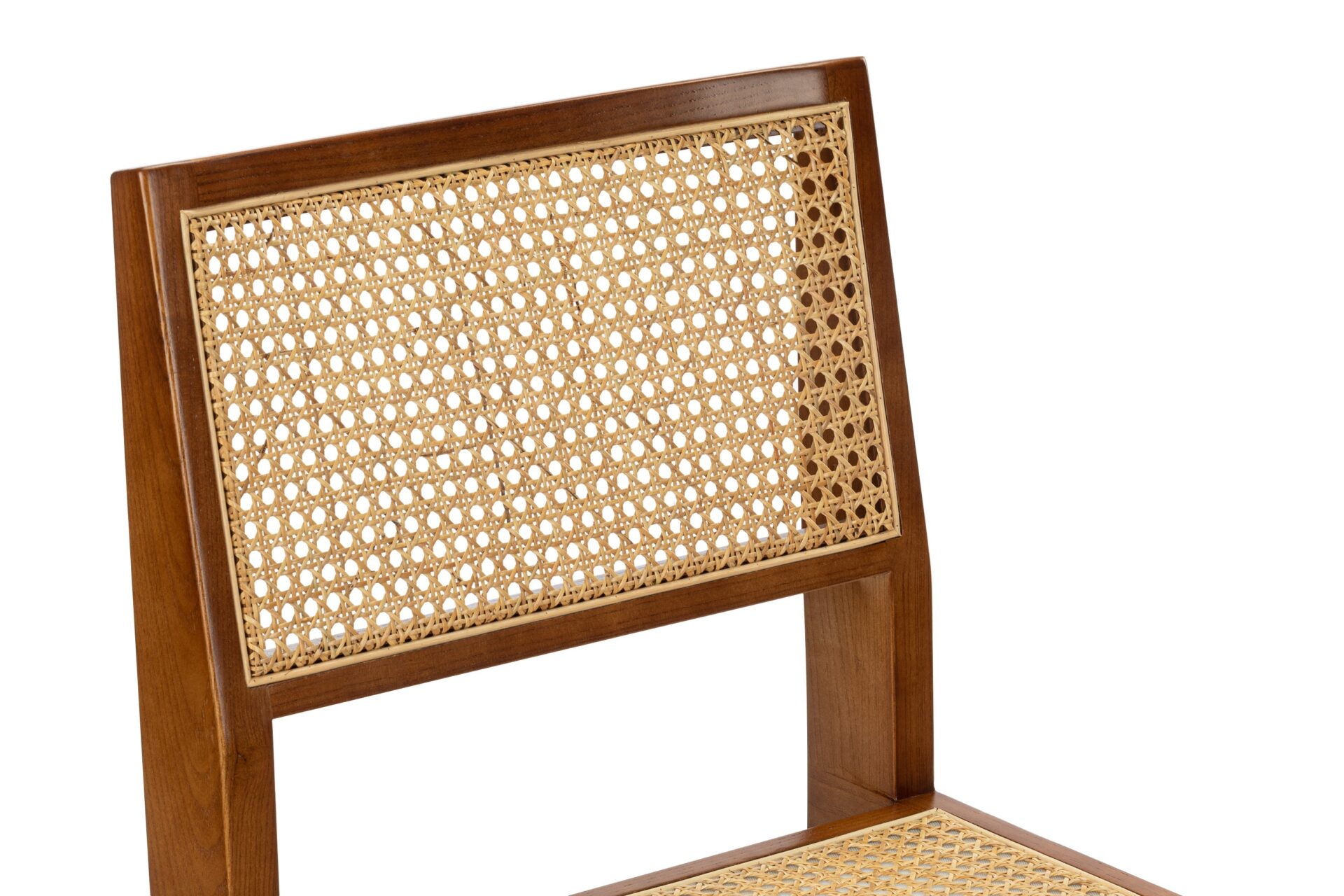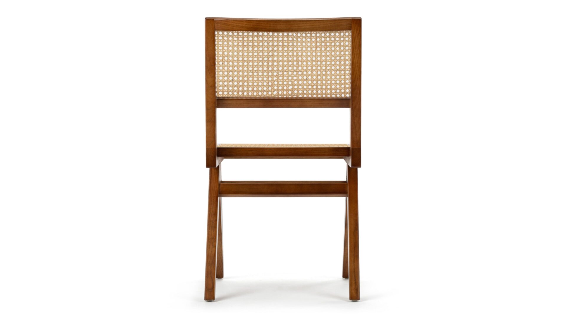 Inspired by the design trends of the 1950s, the Pierre Jeanneret Dining Chair perfectly captures the essence of mid-century modern style. Handcrafted with a walnut wooden frame and accented with rattan details, this chic chair seamlessly combines comfort and durability. Experience upscale dining with this stylish and long-lasting piece, ideal for gatherings and everyday use.