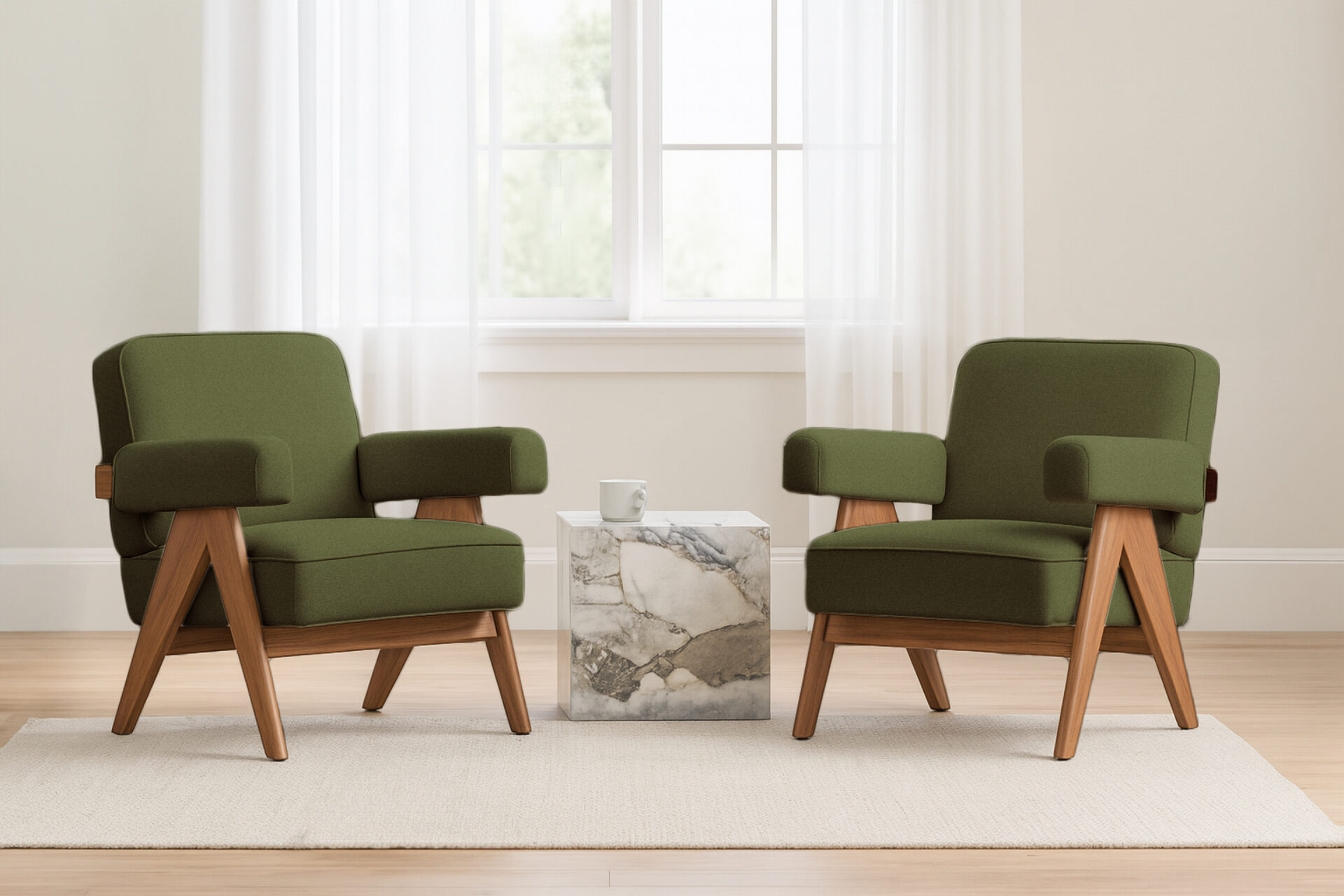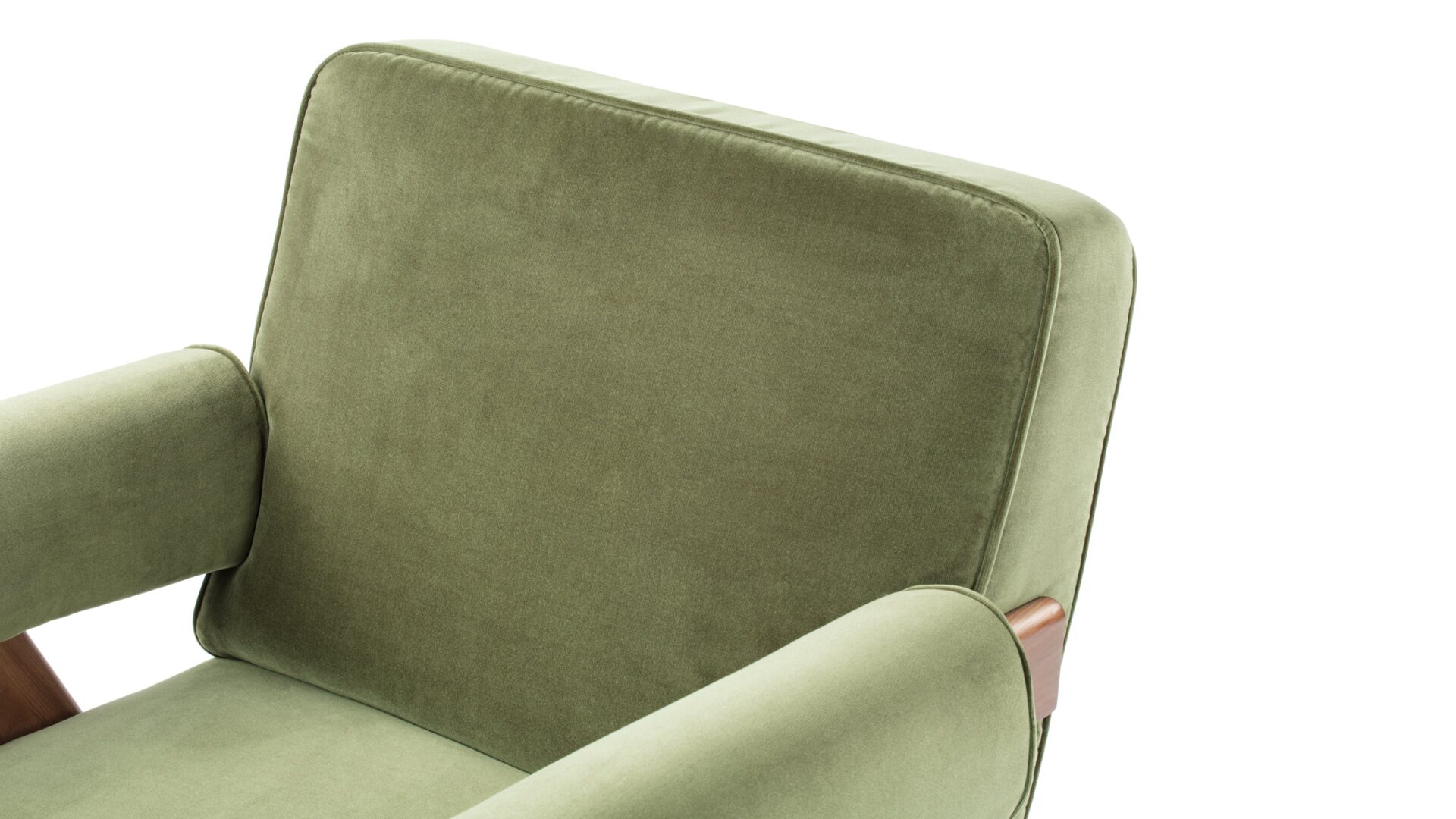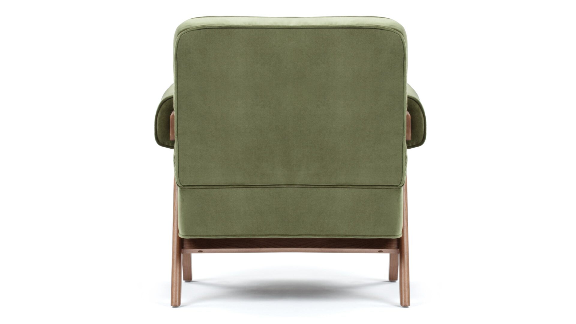 Immerse yourself in the timeless allure of the Pierre Jeanneret Armchair, a tribute to mid-century modern design. Featuring sleek lines and ergonomic construction, it seamlessly merges style and comfort. Bring a touch of sophistication to any space with its versatile olive green velvet material option, enhancing the ambiance with its enduring appeal and adaptability. Crafted with meticulous attention to detail, the Armando Armchair offers unparalleled durability and organic beauty with its natural grain and warm tone wood frame. Experience elevated relaxation and support with its ergonomically designed seat and backrest.