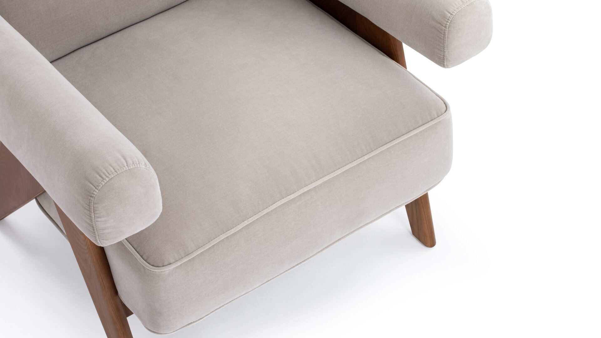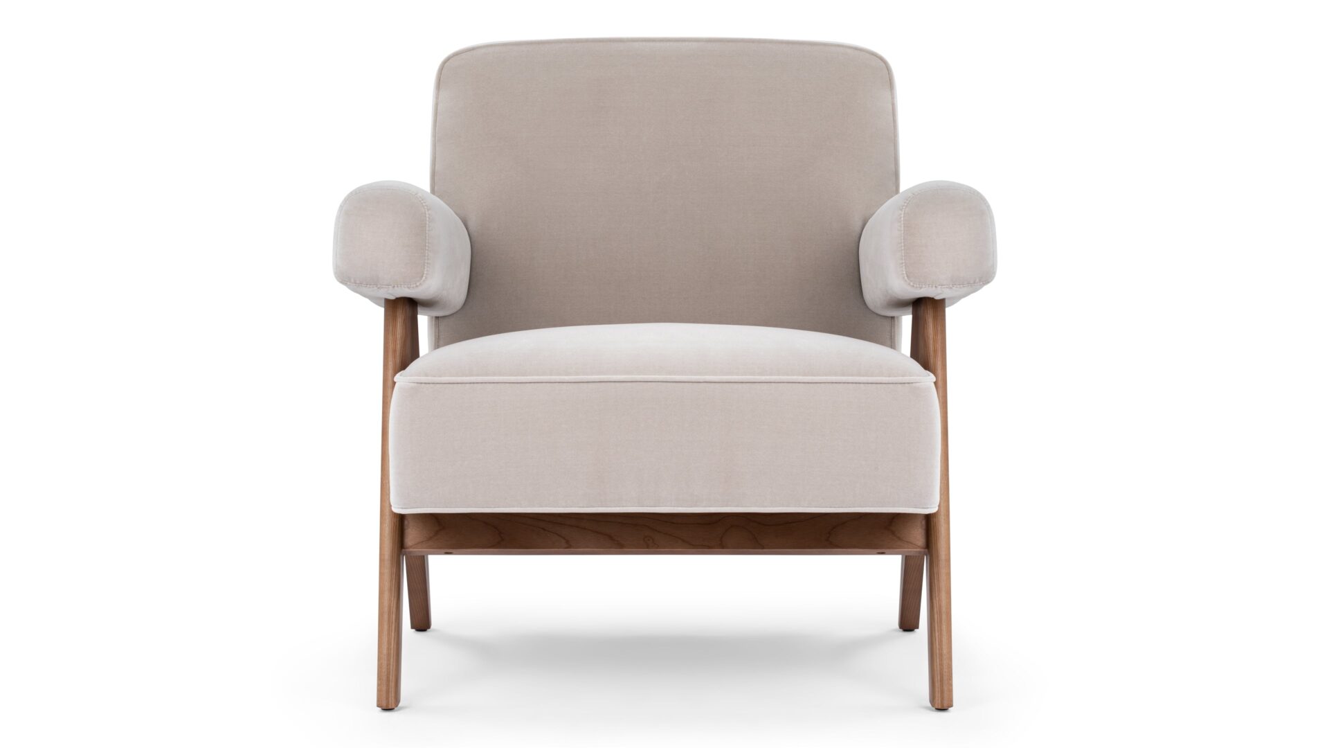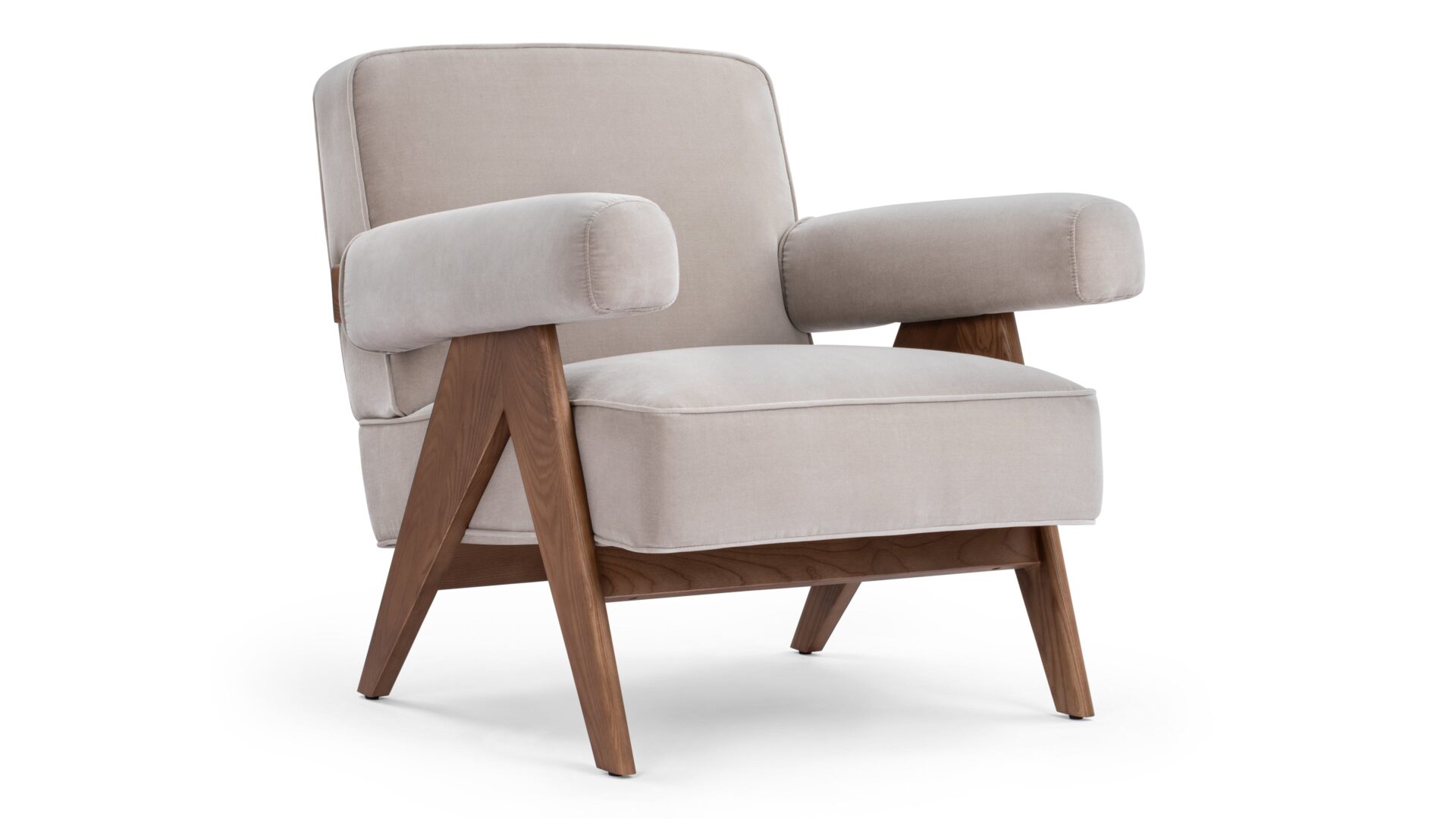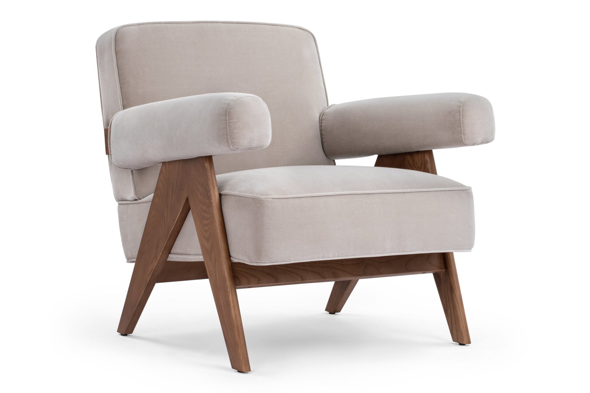 Discover the iconic Pierre Jeanneret Armchair, a versatile piece combining style and comfort. With its sleek lines and practical elegance, this mid-century modern chair is a perfect fit for contemporary, minimalist, or eclectic spaces. The Armando Armchair features a solid wood frame in a warm Oyster Luxe velvet finish, exuding timeless beauty and durability.