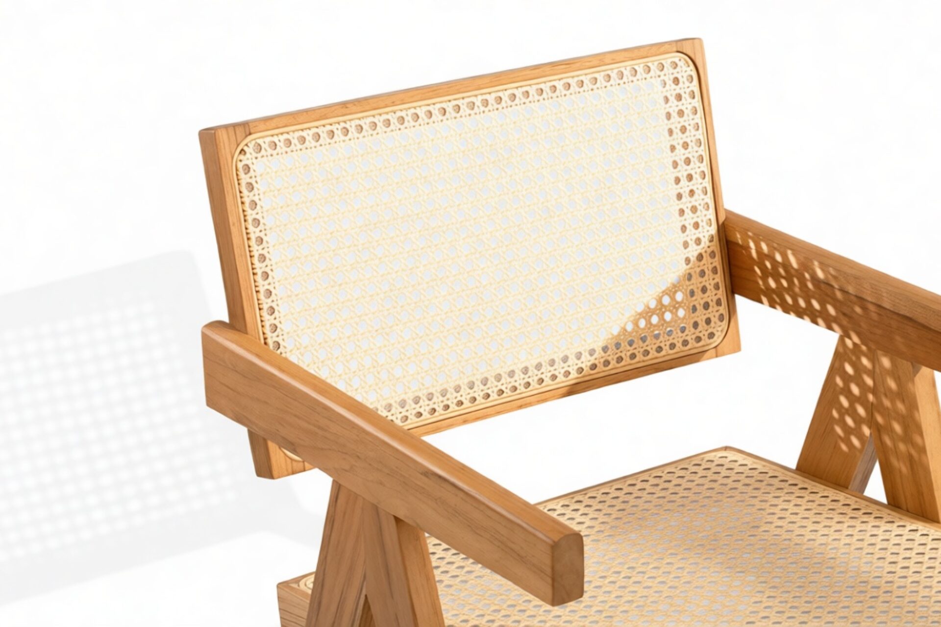 Capturing the elegant lines and utilitarian charm of the 1950s, this outdoor chair embodies the Pierre Jeanneret Outdoor Armchair's nod to campaign-style furnishings, harmoniously merging the allure of authentic teak and resilient rattan. Crafted for lasting resilience and relaxation, this chair makes a striking statement in patios, gardens, or outdoor dining areas.