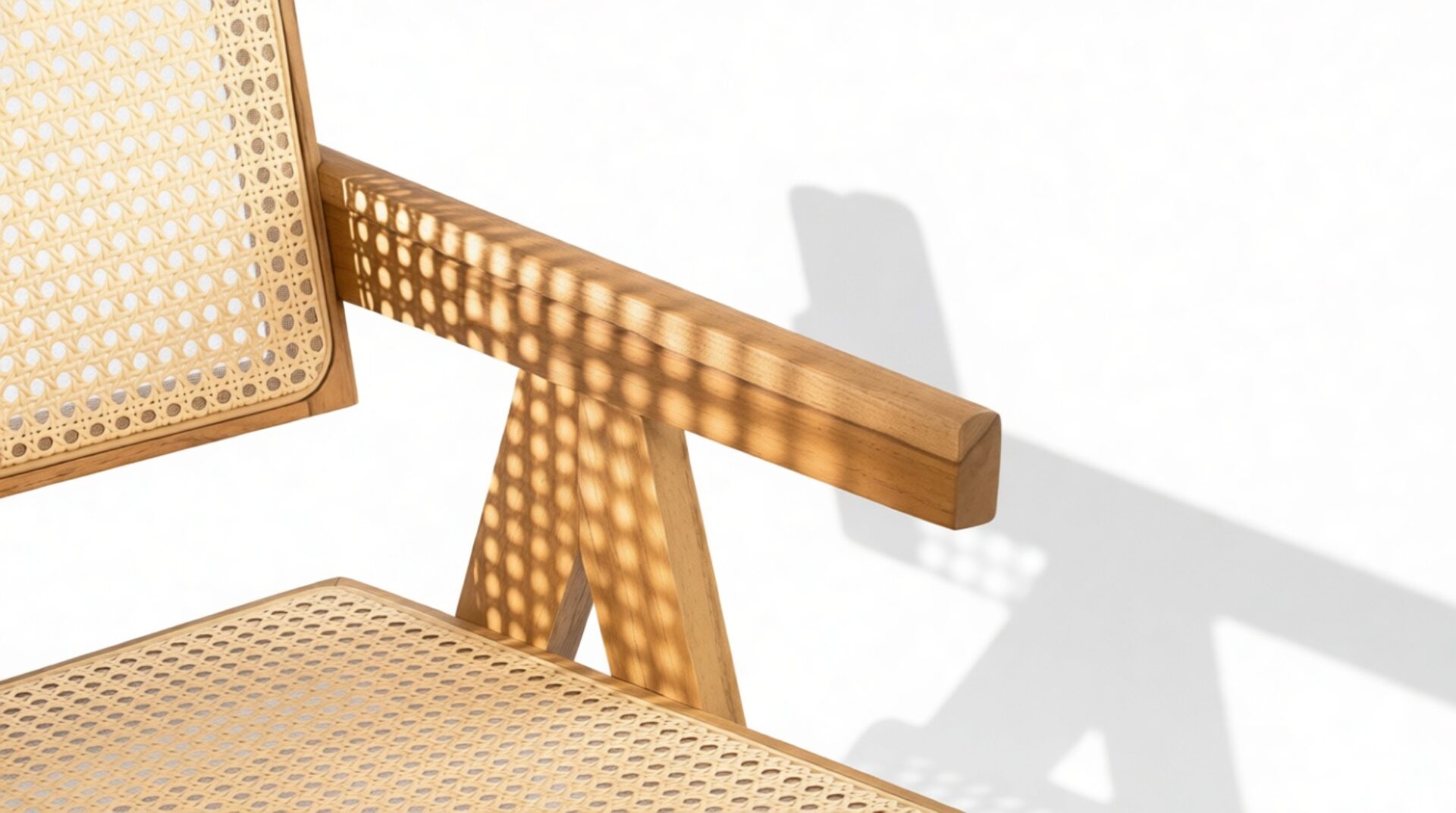 Crafted from a sturdy teak frame with angled legs and tapered armrests, this gem of modern design ensures both stability and comfort. The weather-resistant rattan seat and back offer breathable support, making it ideal for open-air relaxation.
