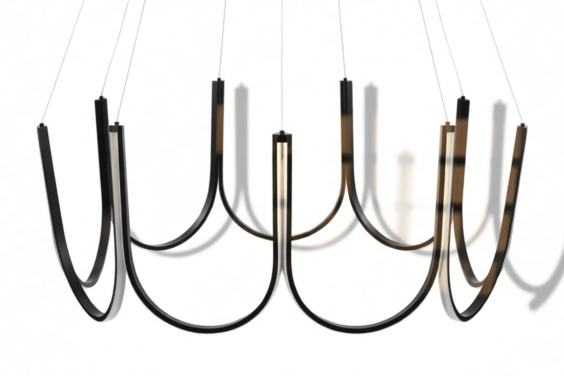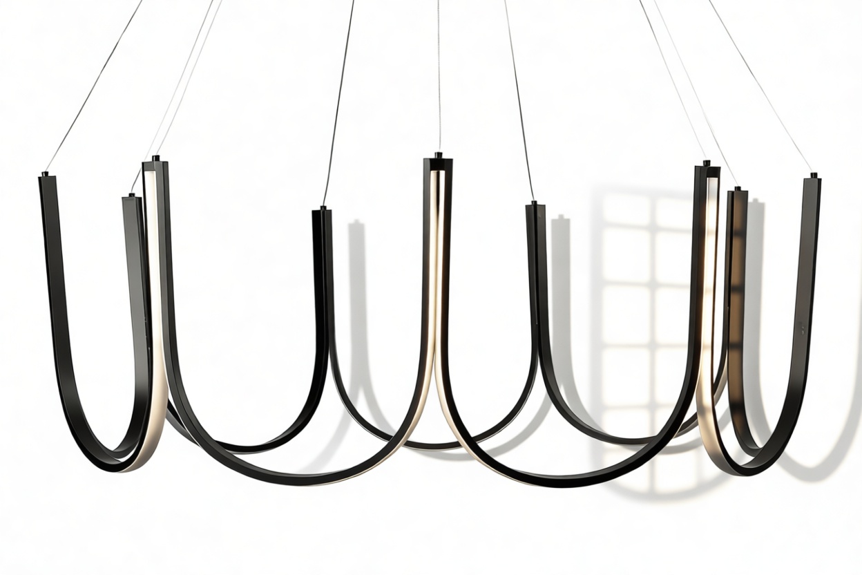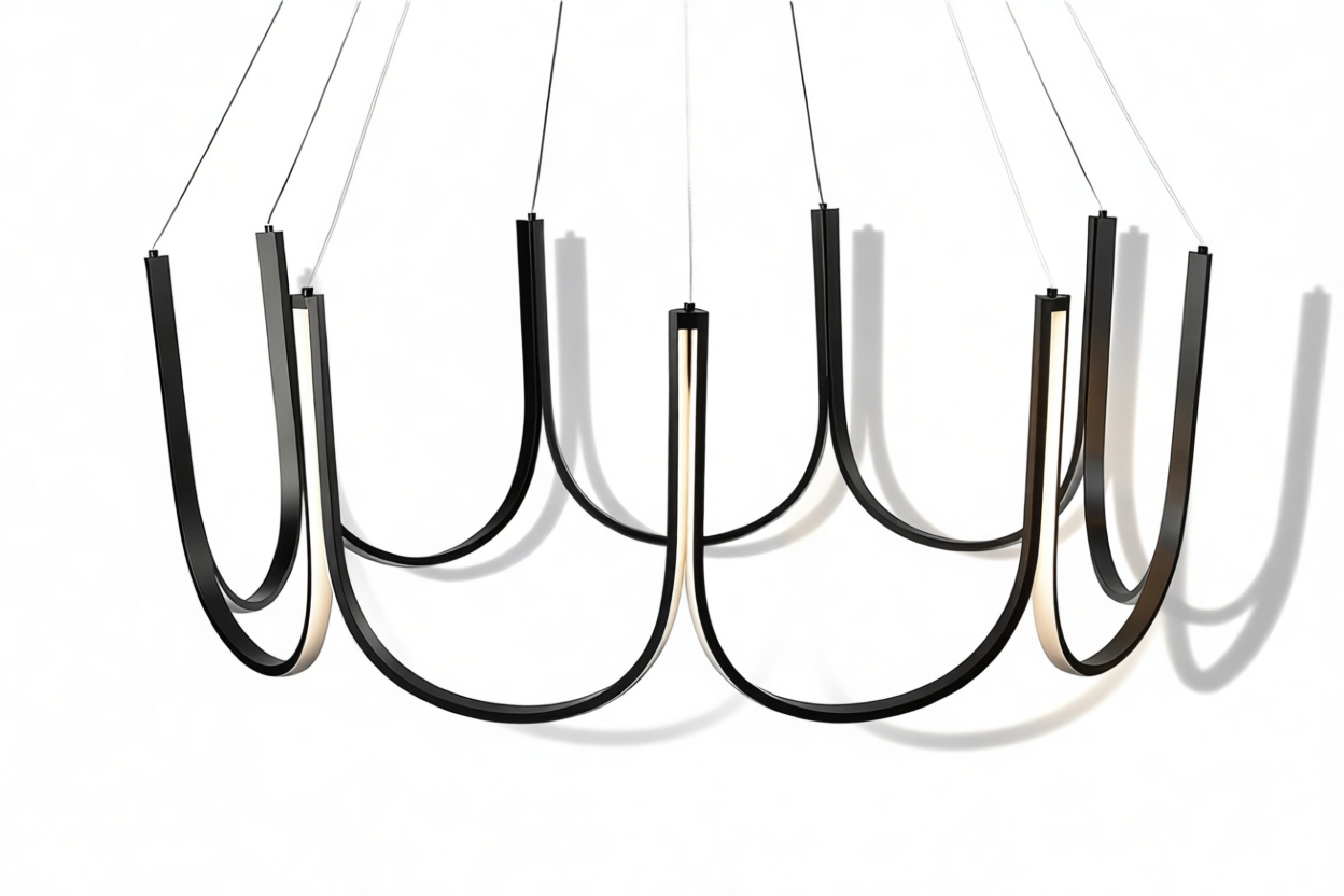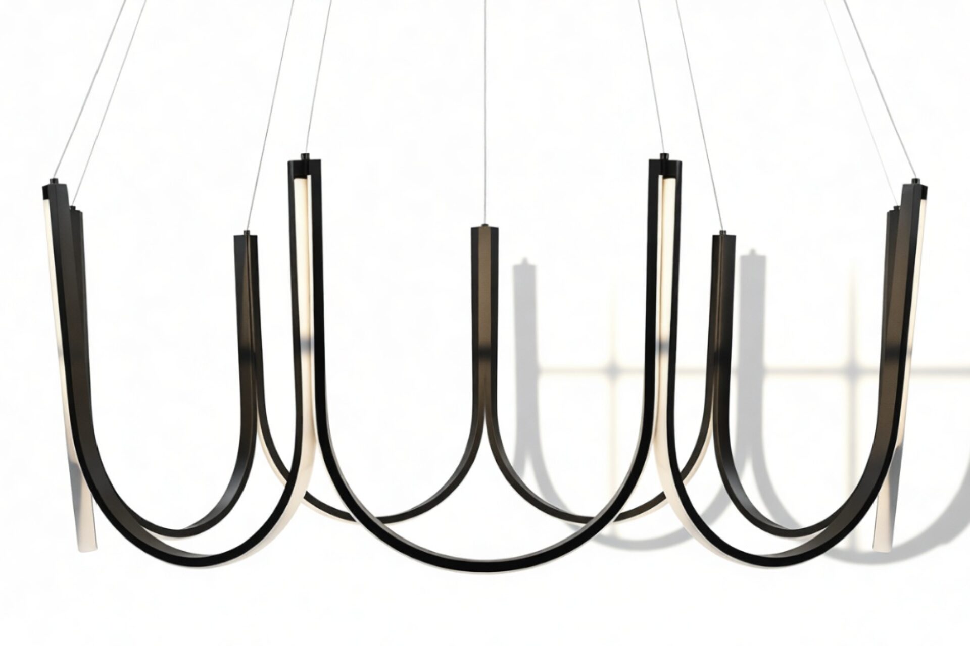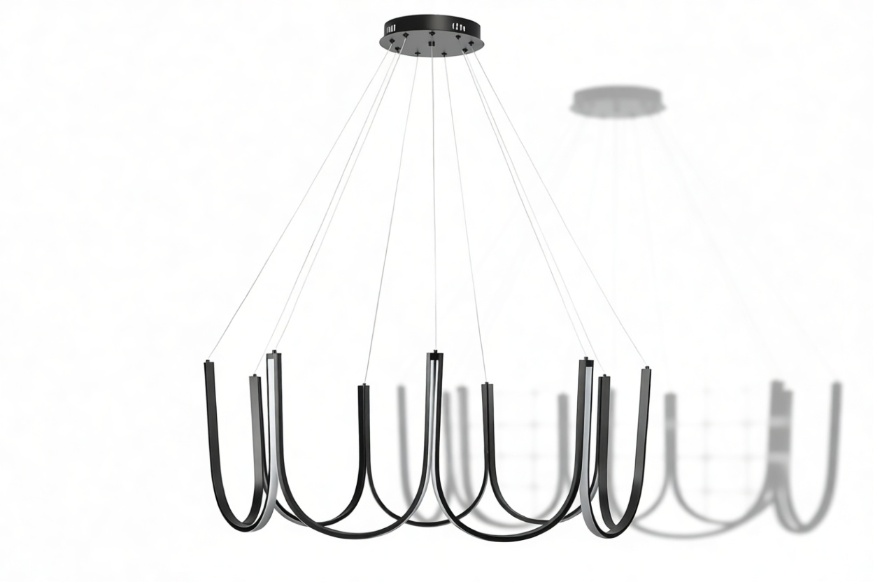 Crafted from premium silicone and high-quality aluminum, this exquisite chandelier showcases gracefully curved arms in a scalloped pattern with an integrated LED strip that elegantly follows the contours of the frame. Suspended by discreet wires, this luminary exudes a sense of weightlessness and sophistication.