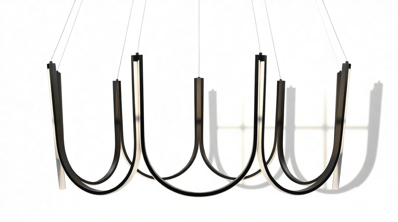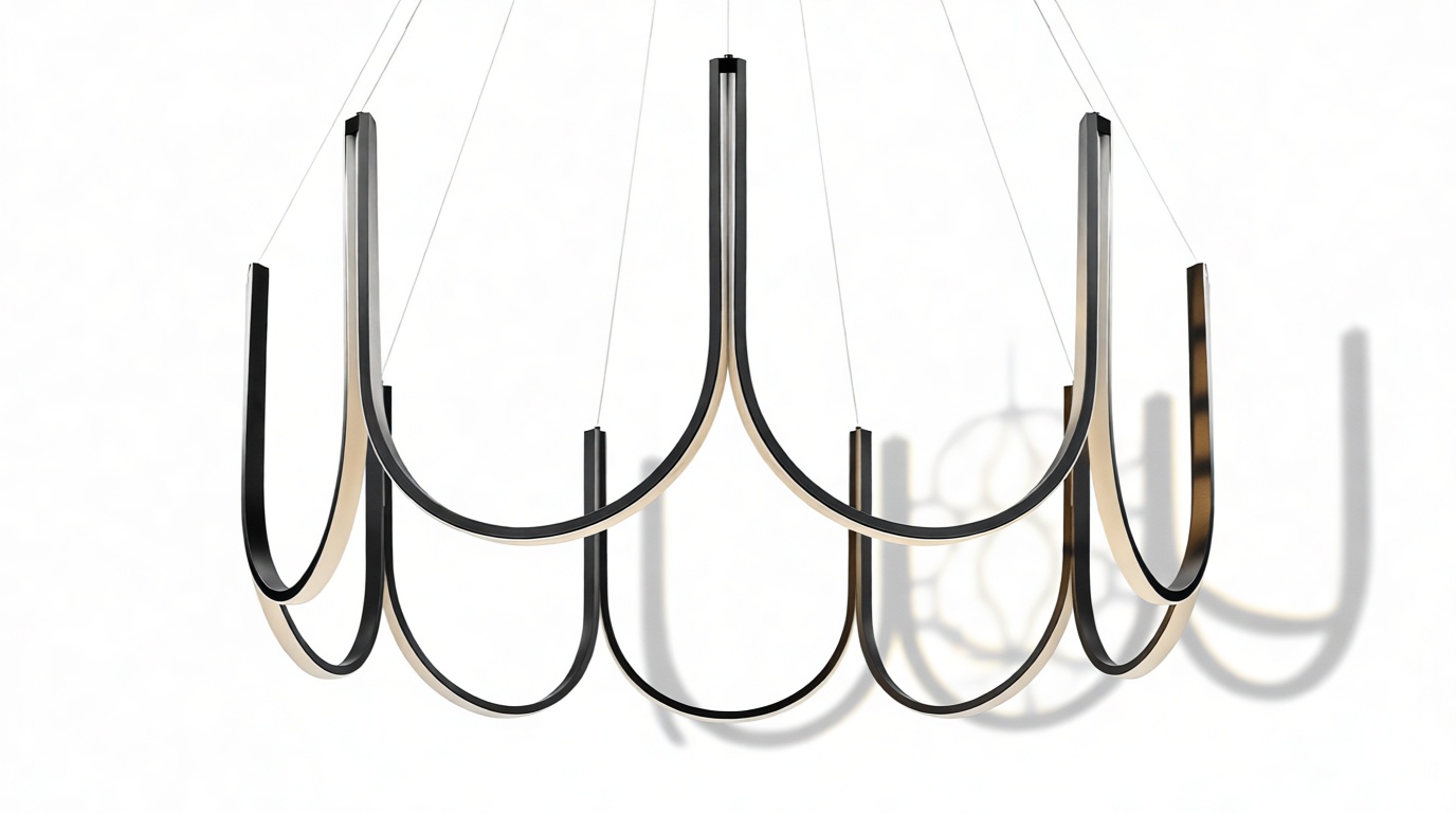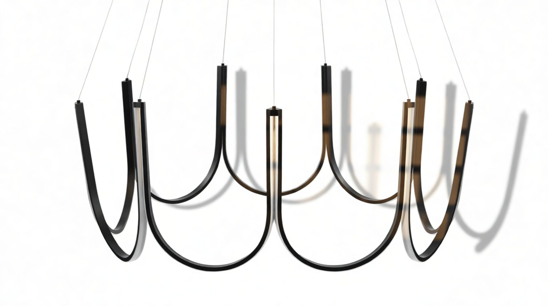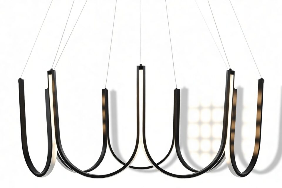 Crafted from premium silicone and high-quality aluminum, this exquisite chandelier showcases gracefully curved arms in a scalloped pattern with an integrated LED strip that elegantly follows the contours of the frame. Suspended by discreet wires, this luminary exudes a sense of weightlessness and sophistication.