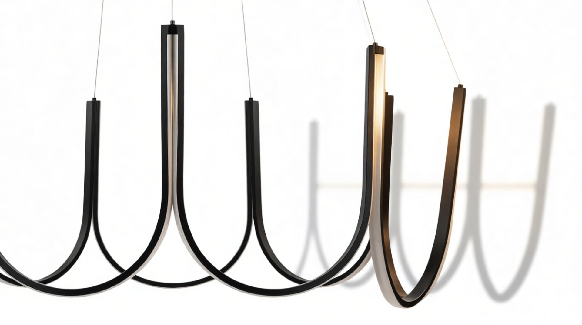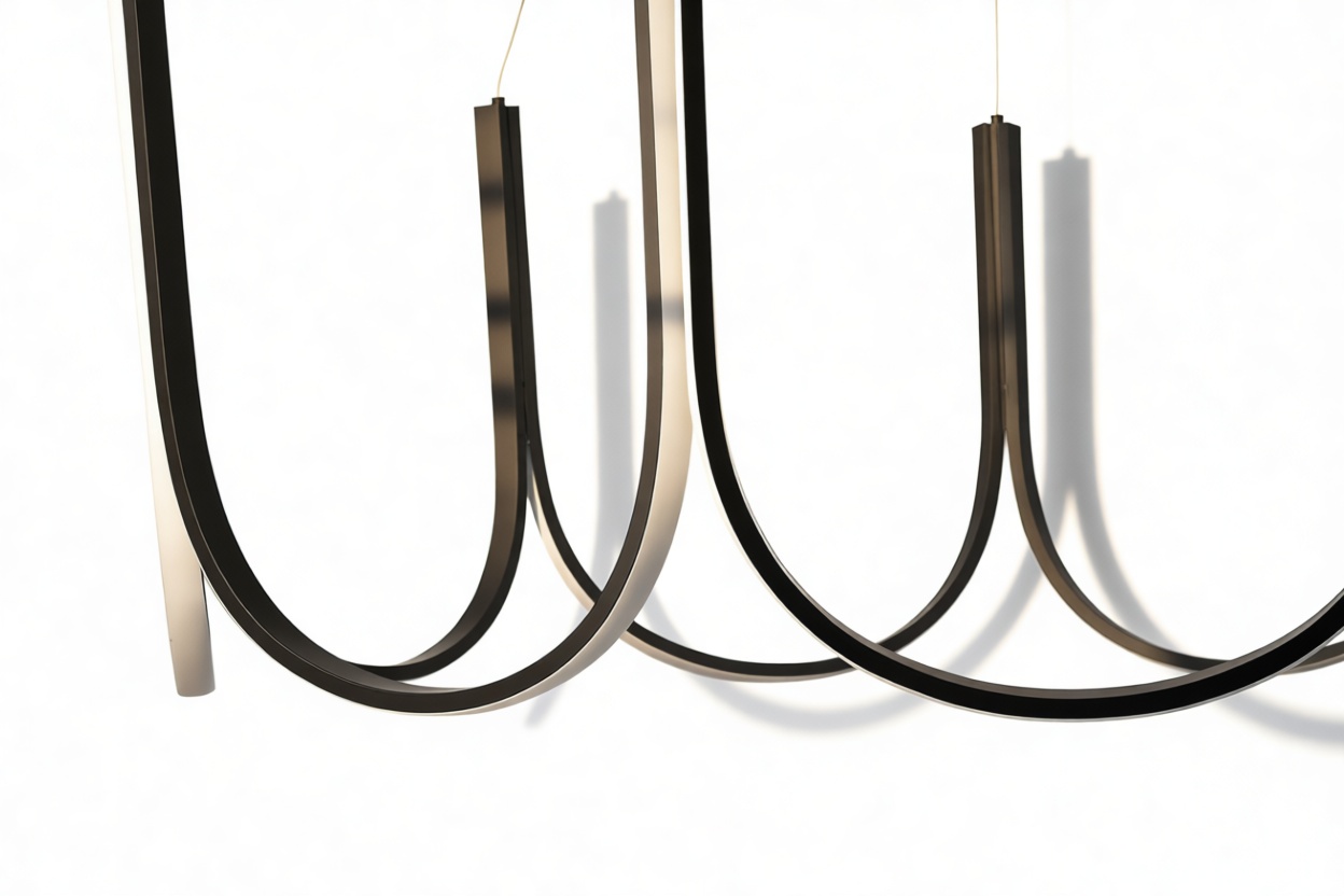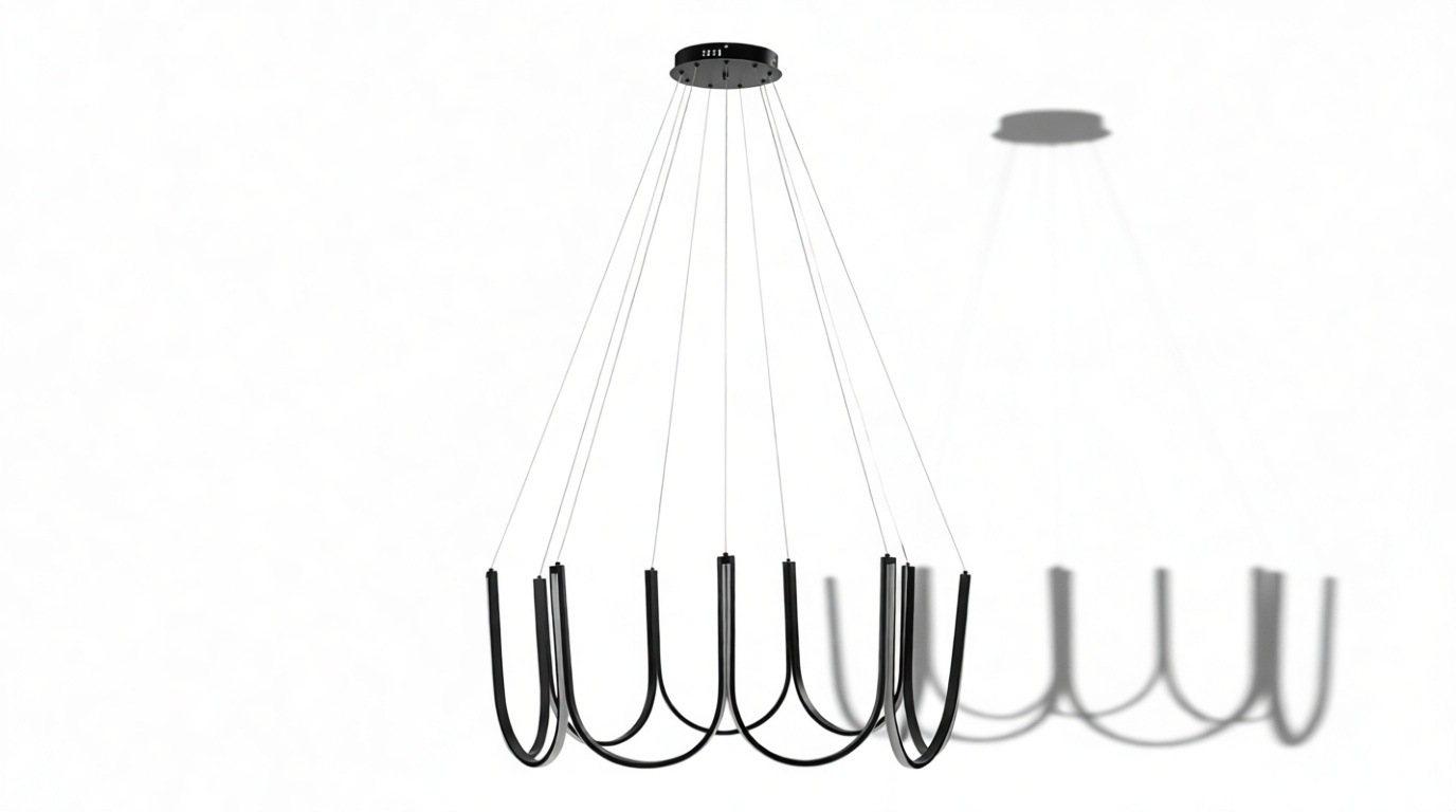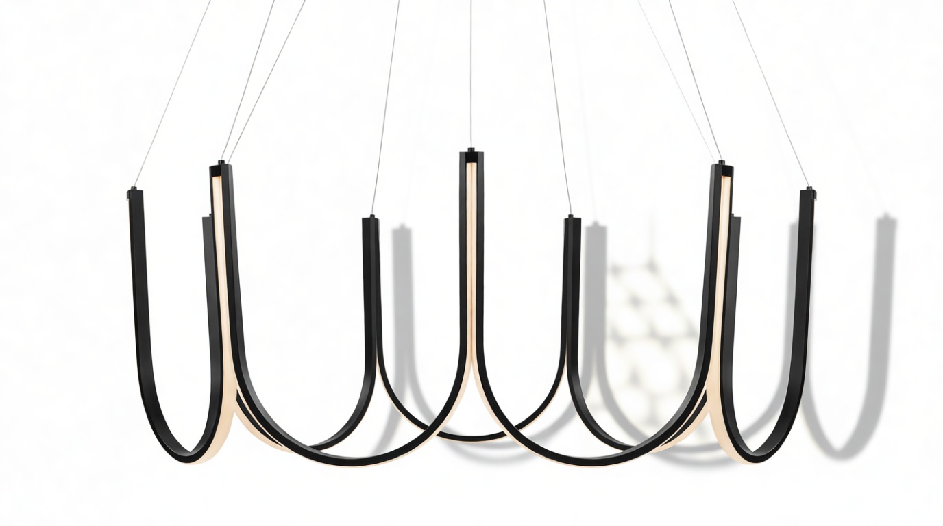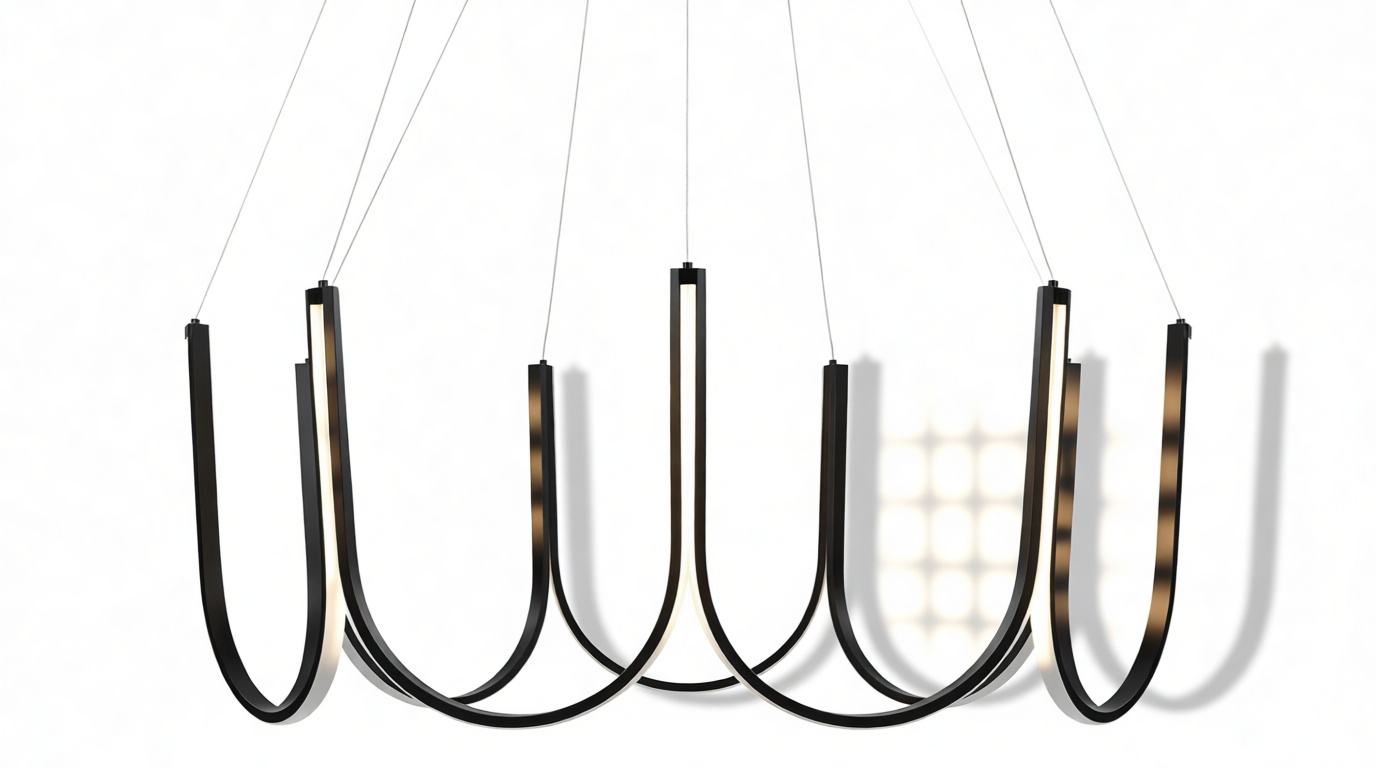 Crafted from premium silicone and high-quality aluminum, this exquisite chandelier showcases gracefully curved arms in a scalloped pattern with an integrated LED strip that elegantly follows the contours of the frame. Suspended by discreet wires, this luminary exudes a sense of weightlessness and sophistication.
