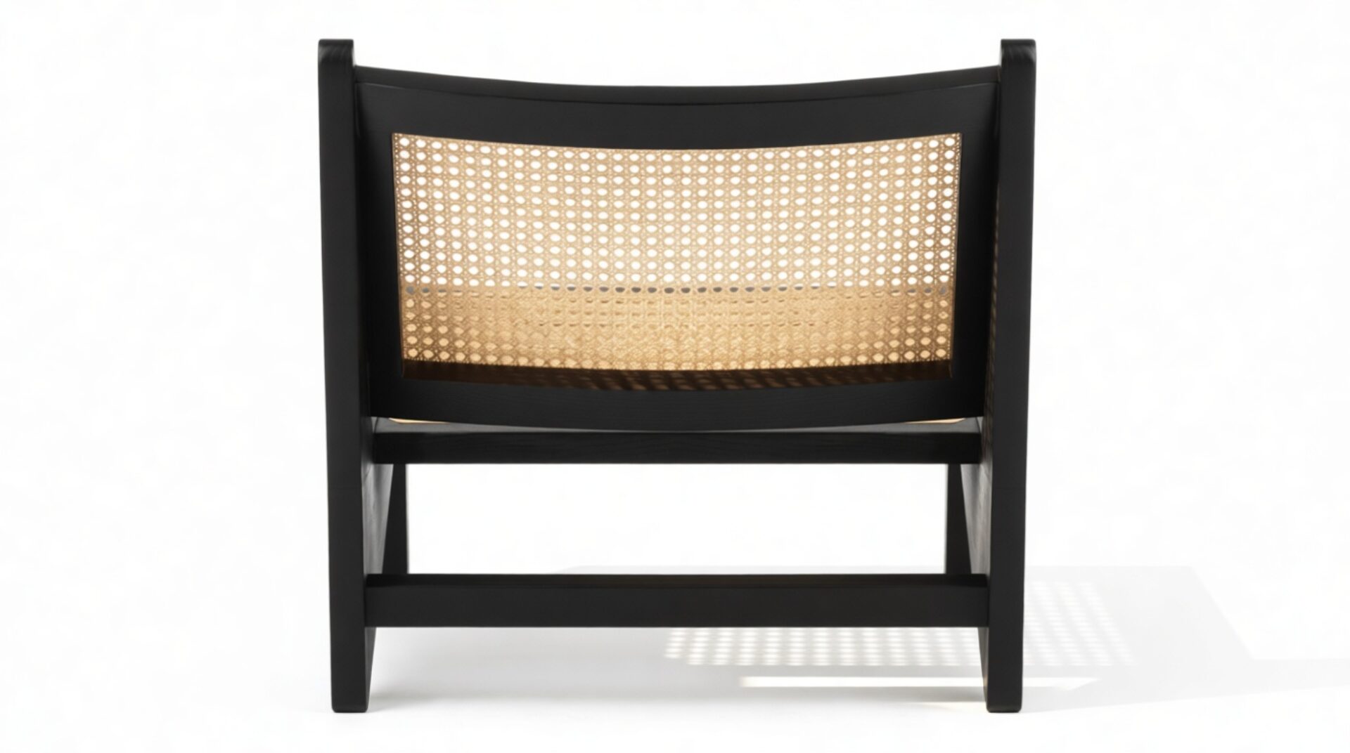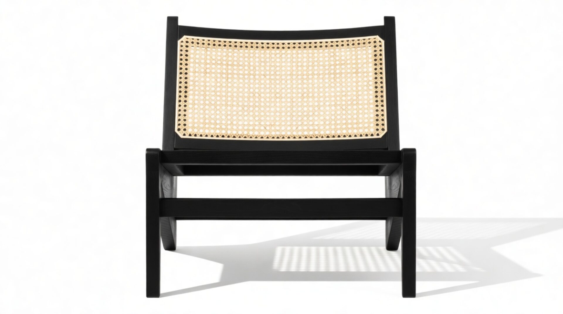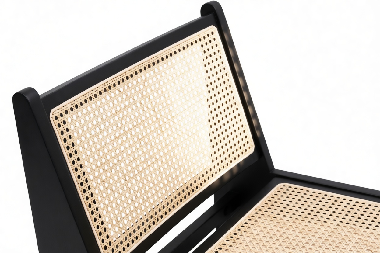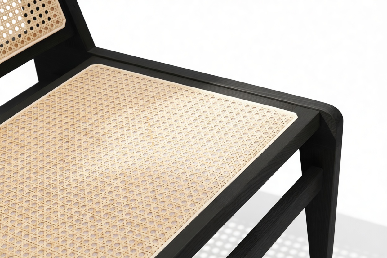 - Material: Solid ash with black painted finish, natural rattan seat and backrest