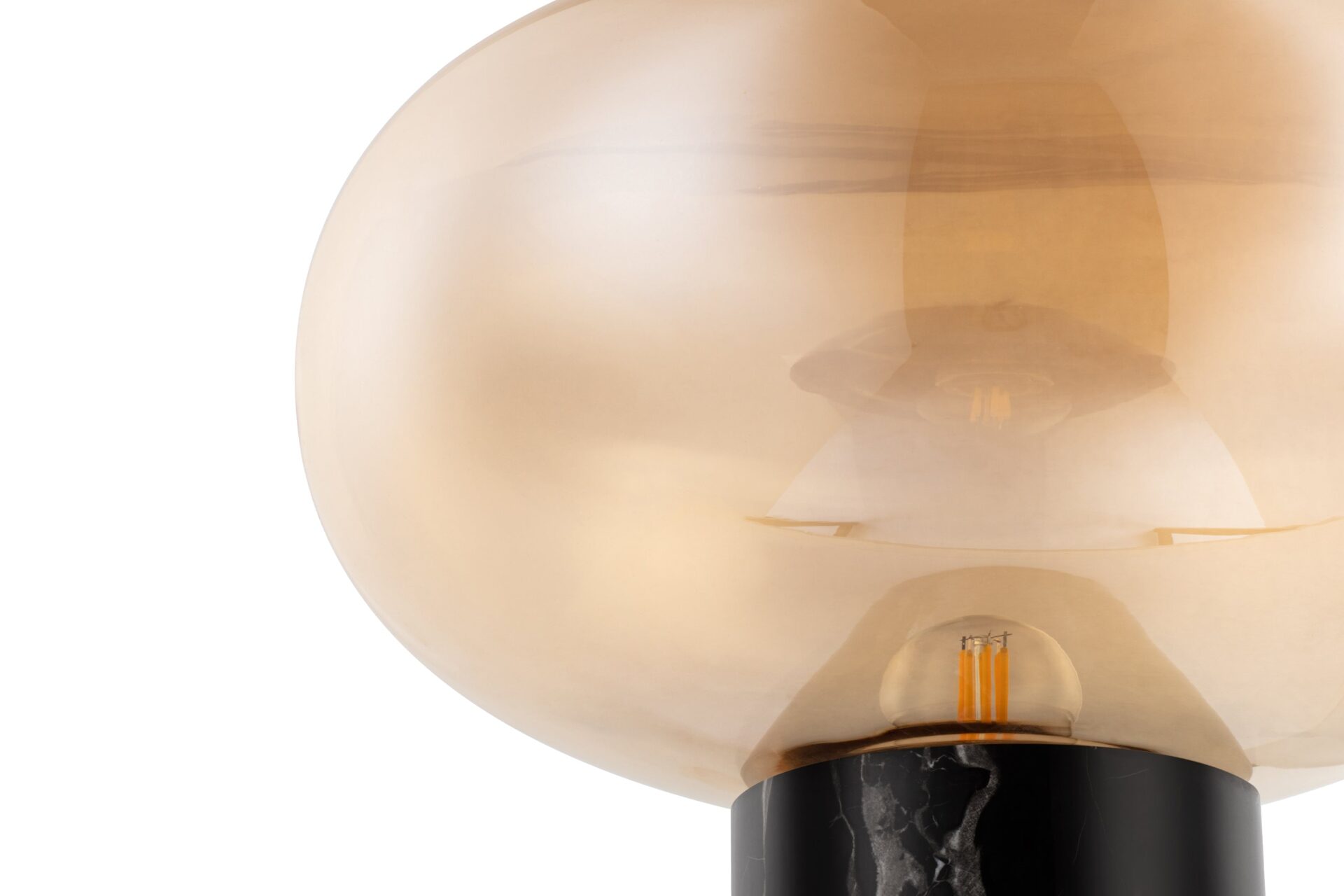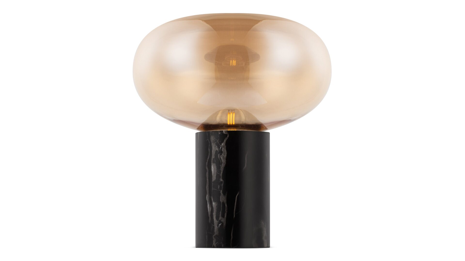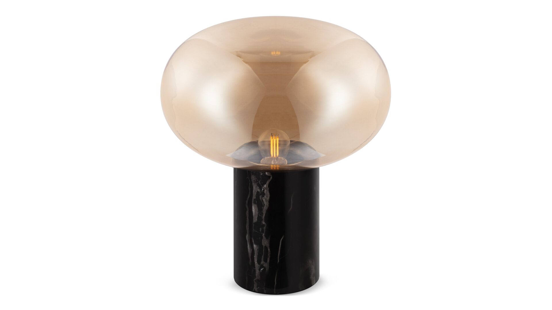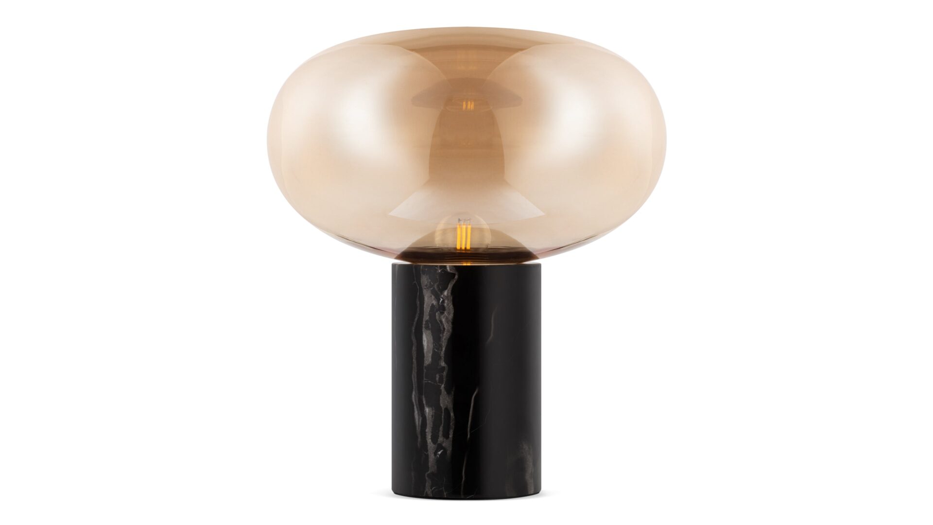 Expertly crafted with meticulous attention to detail, the lamp's glass curves elegantly manipulate ambient light, showcasing a captivating interplay of shadows and illumination. Complementing this, the durable Black Marquina marble base introduces a touch of refinement, anchoring the lamp in a discreet yet significant manner.