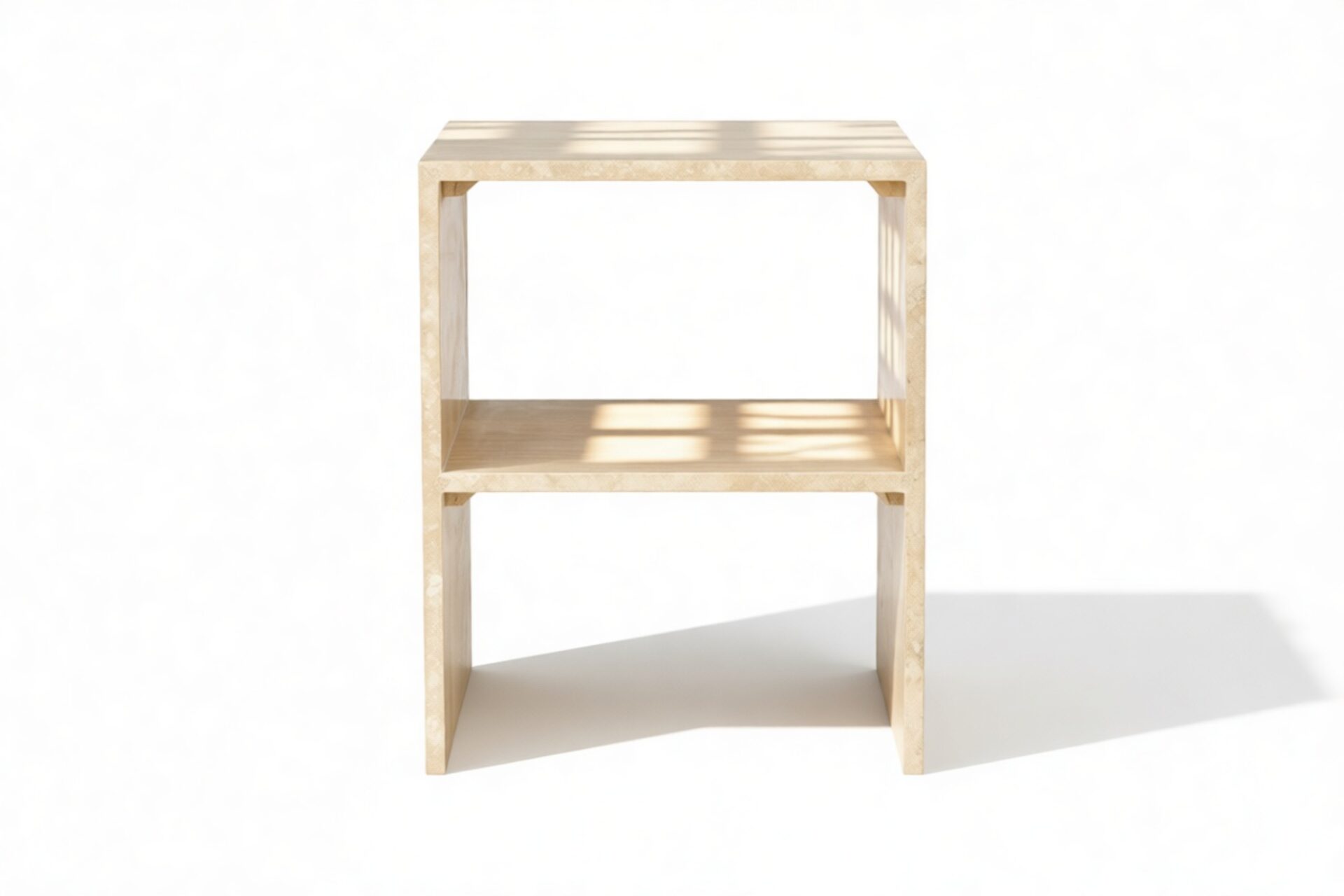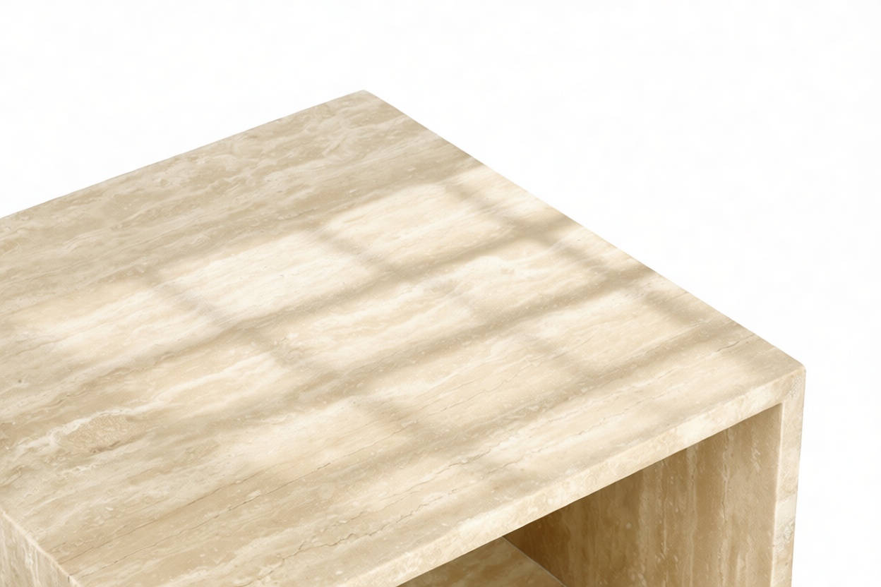 Experience the timeless elegance and modern functionality of the Köln Side Table. Crafted from solid travertine with a honed finish, this piece in warm cream effortlessly complements any interior style. Its sleek design includes a mid-level shelf for convenient storage, combining durability and aesthetics. Elevate your living space with this bold and versatile statement piece.