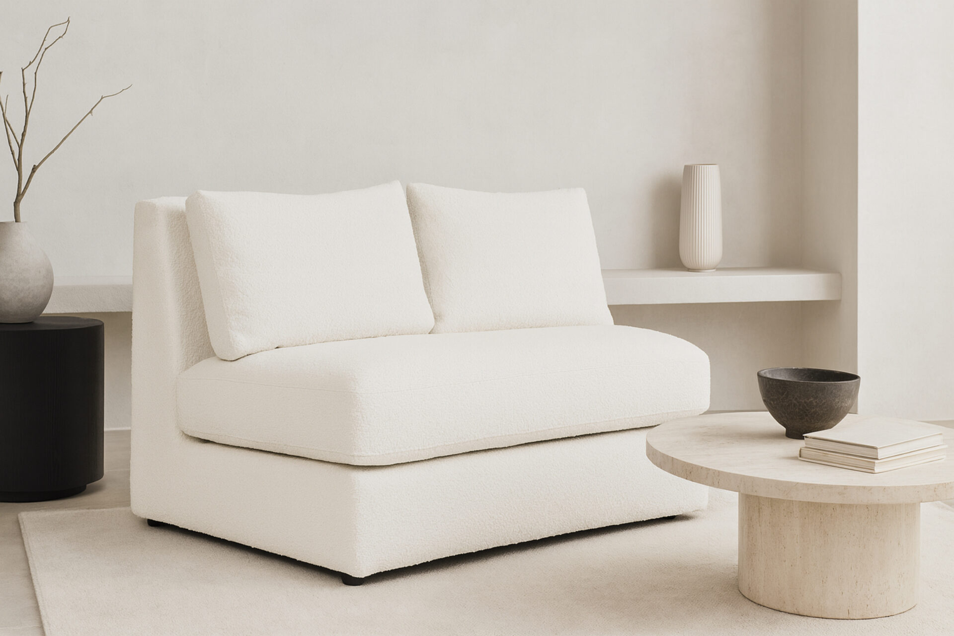 Experience the luxurious texture of soft boucle fabric with our XYZ Sectional. Its sleek European-inspired silhouette is complemented by the tactile richness of the fabric. The warm white hue of the fabric enhances both comfort and contemporary visual appeal.