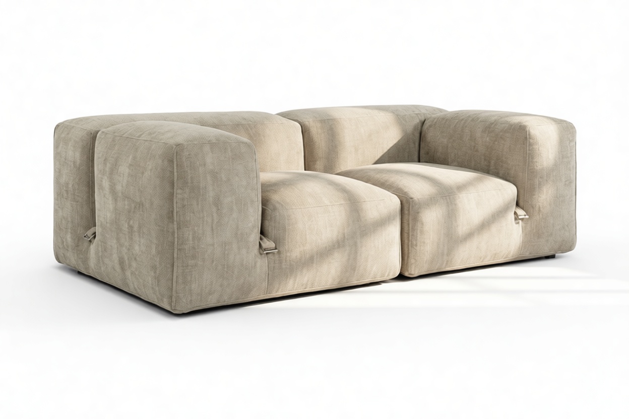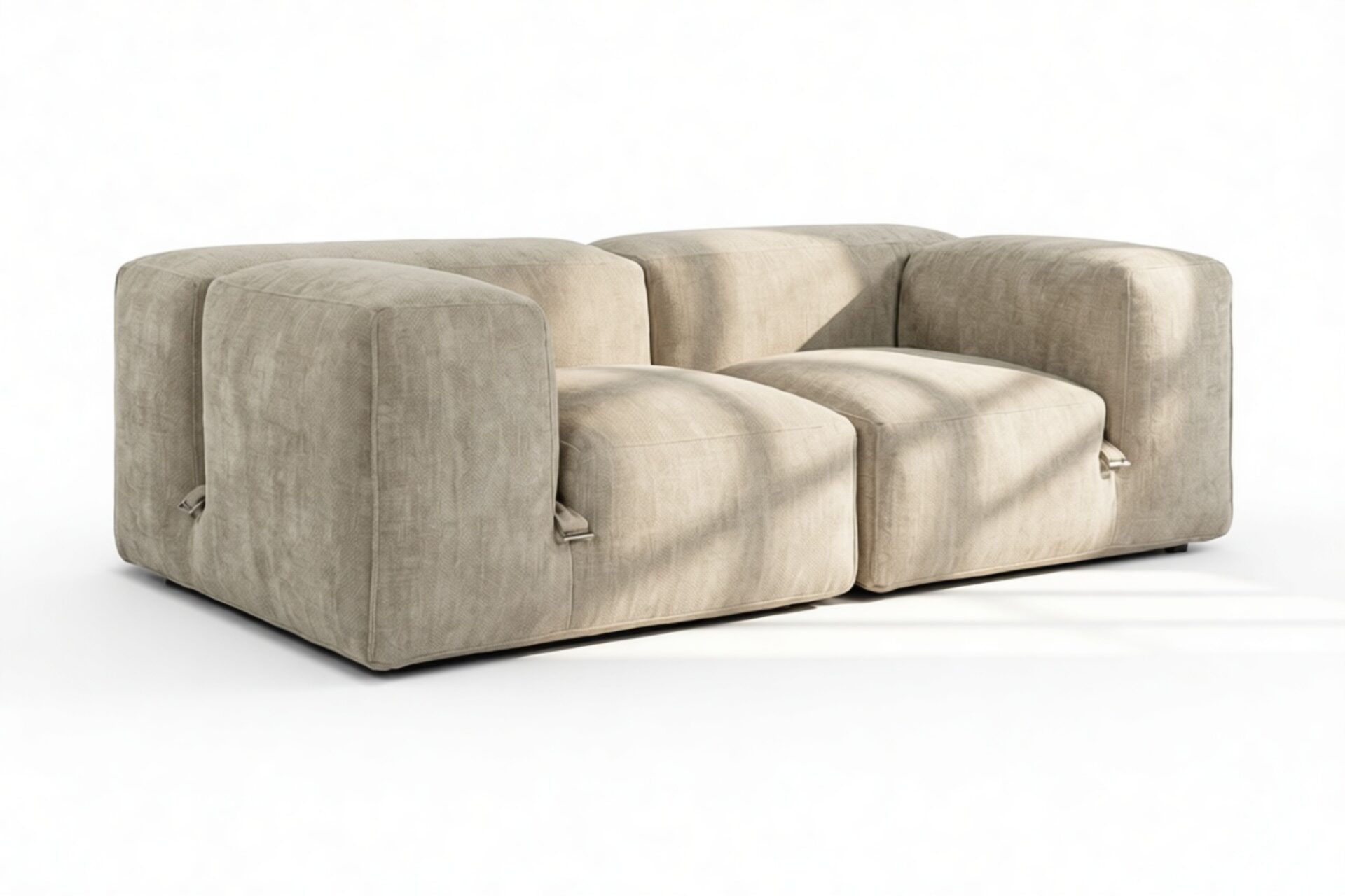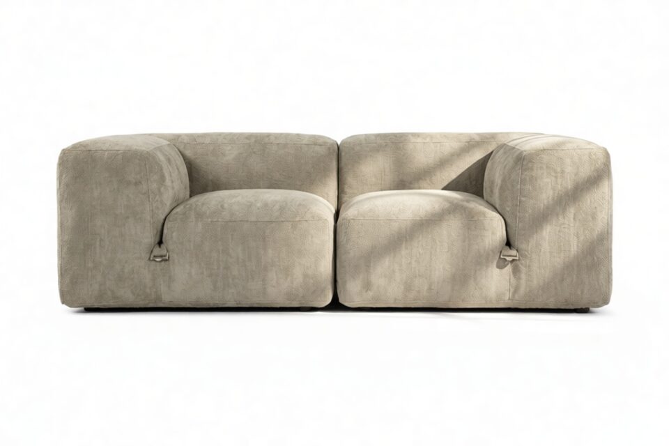 Discover our collection, available in both neutral-toned fabric and leather or vegan suede. Experience the deep comfort provided by the foam interior, complemented by understated wooden legs and sleek metal buckles for easy configuration.