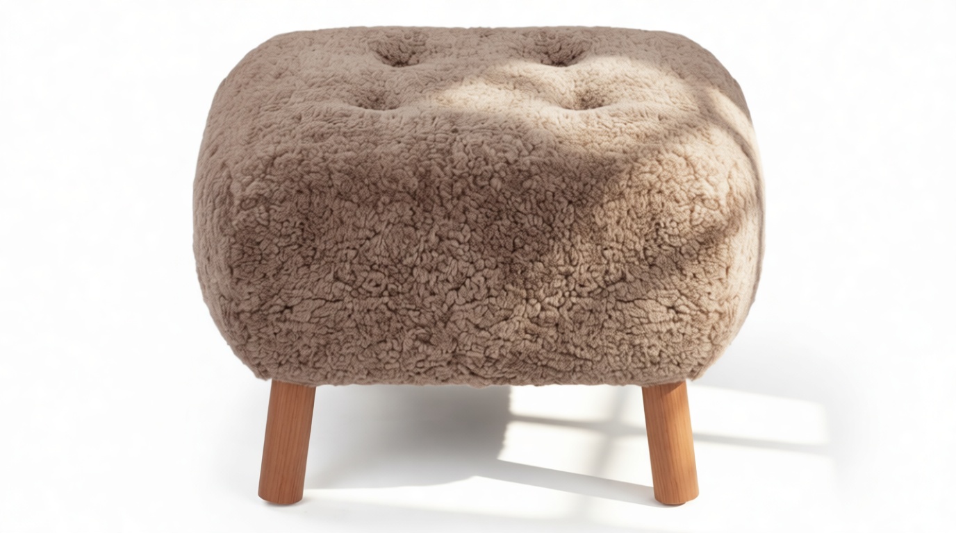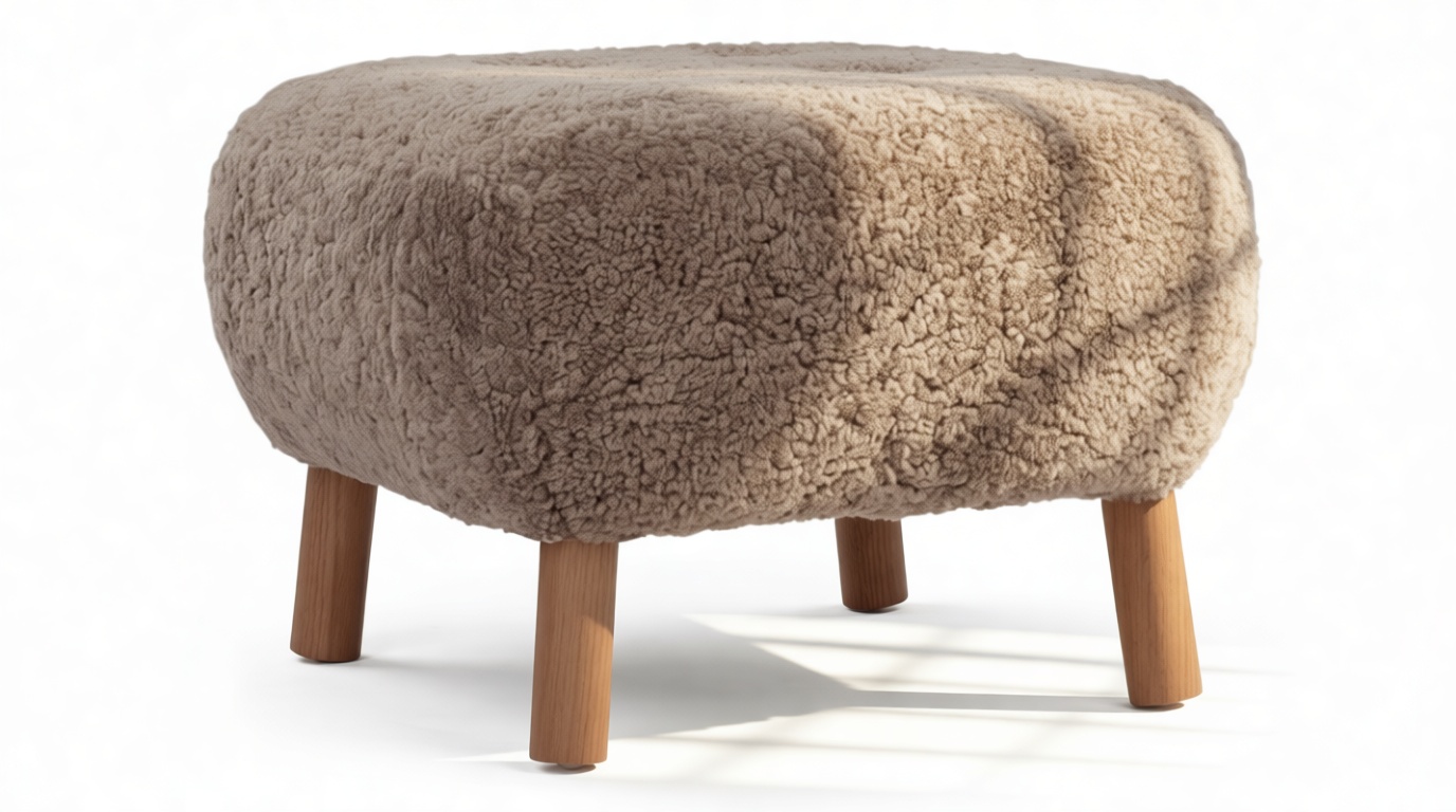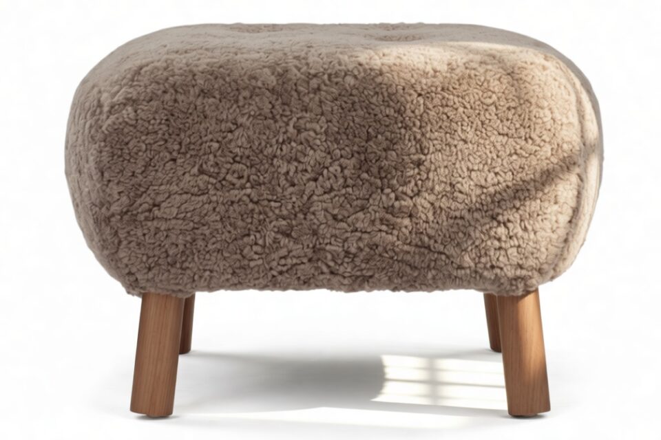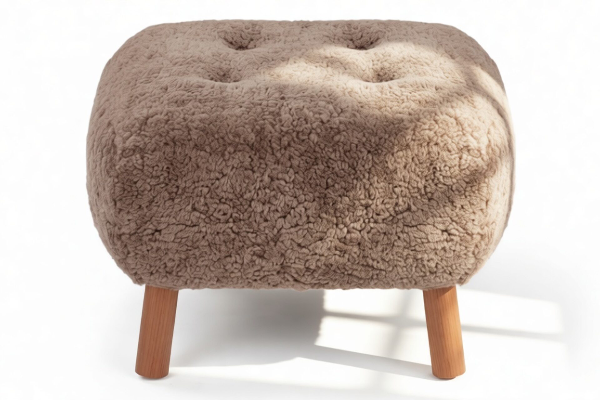 Crafted with a sturdy beech and plywood frame, the Little Petra Ottoman is enveloped in HR foam and polyester wadding, then luxuriously wrapped in Luxe Sheepskin. It serves as the perfect snug companion to the Lounge Chair or stands elegantly as a chic stool by itself.