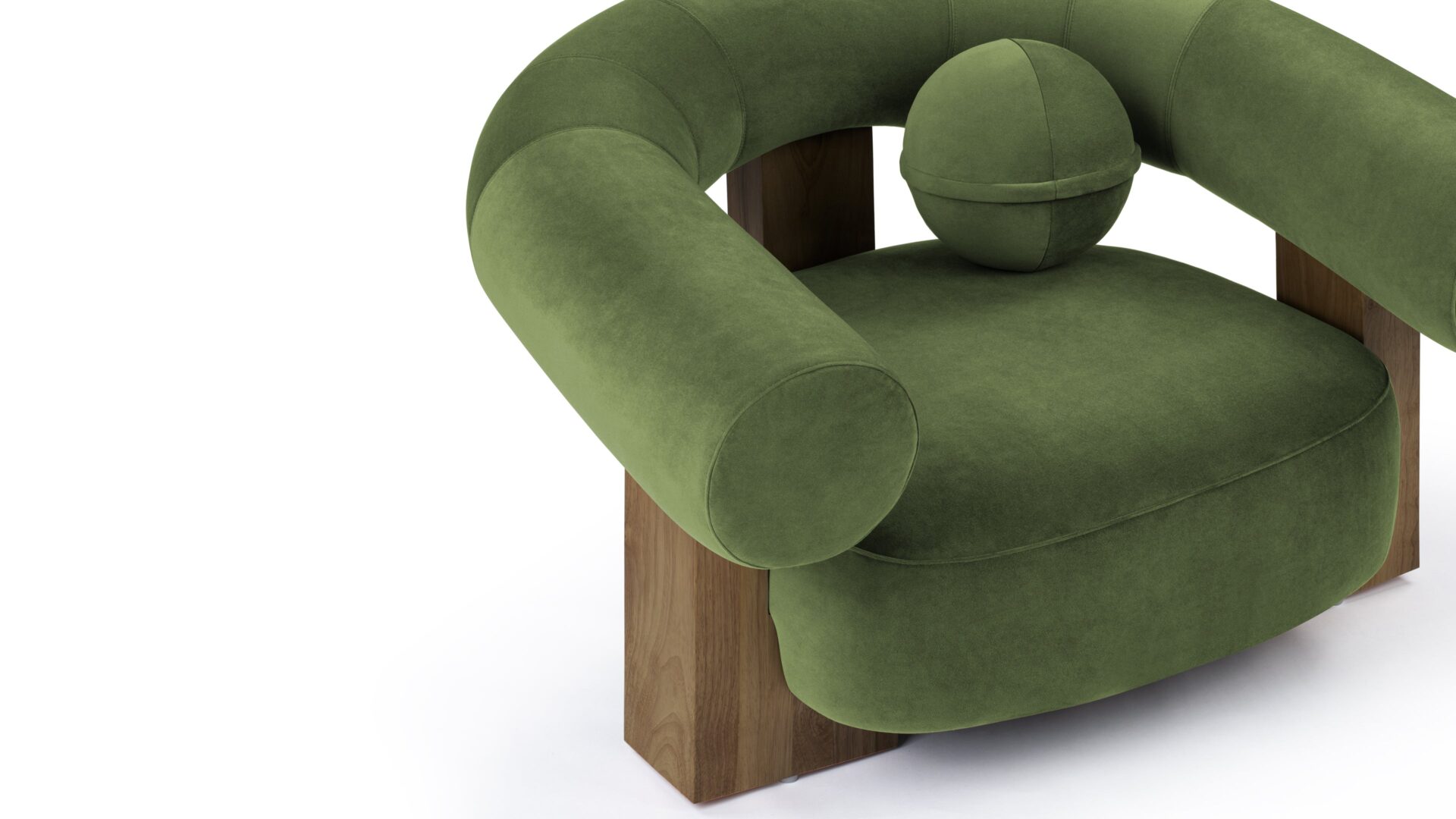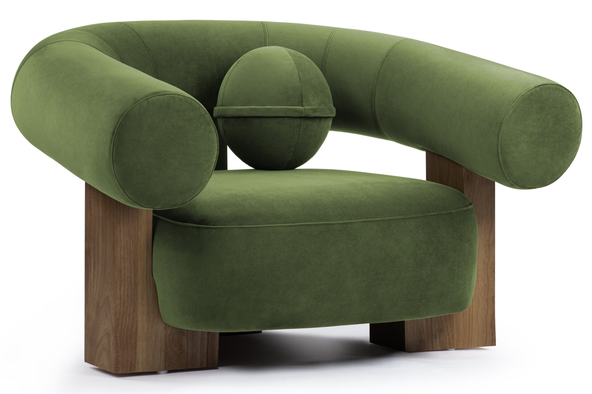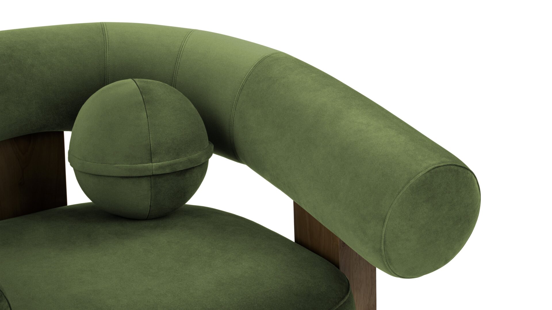 Introducing the captivating Liv Lounge Chair, an artistic statement piece that boldly marries strength and style. Featuring wide, curved arms and a charming ball-shaped cushion, this chair's striking silhouette is enhanced by lush Lichen Plush Velvet upholstery. Crafted with robust walnut pieces, it offers luxurious comfort and a refined focal point in any living space. Elevate your decor with the distinctive aesthetic of the Liv Lounge Chair.