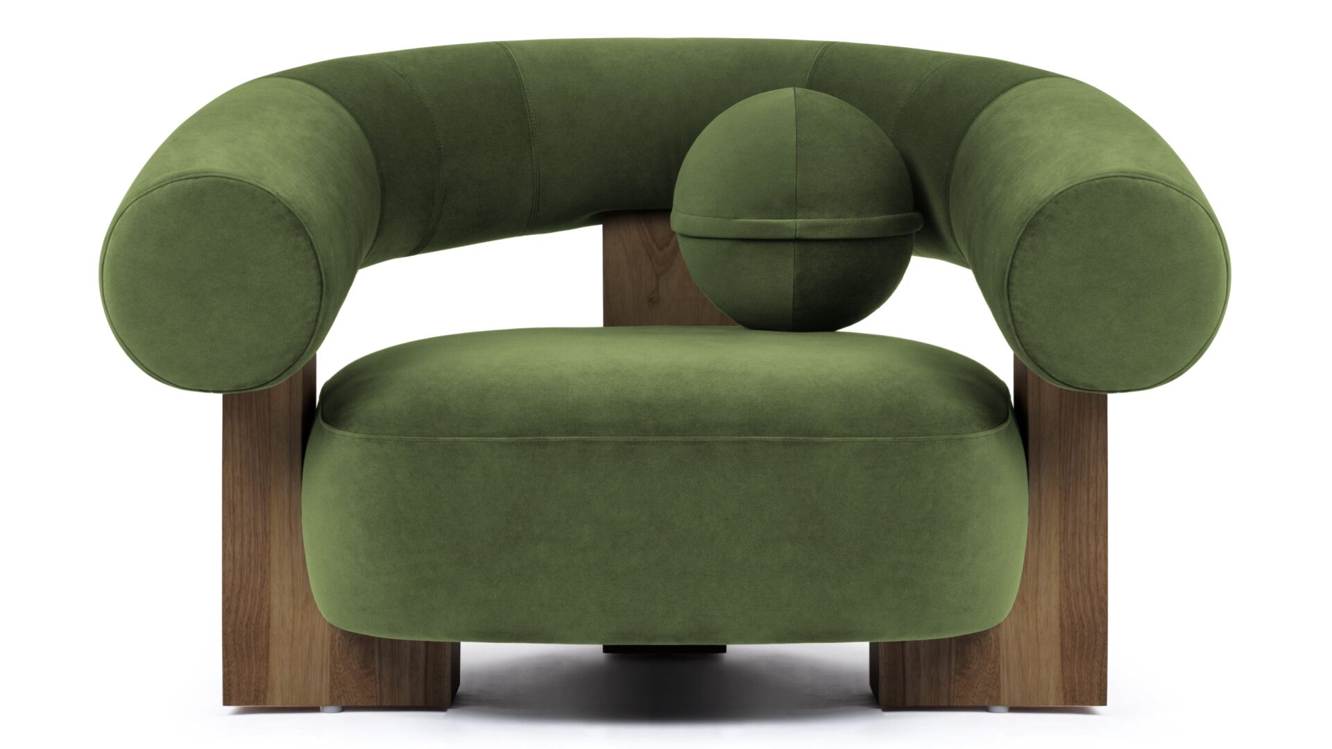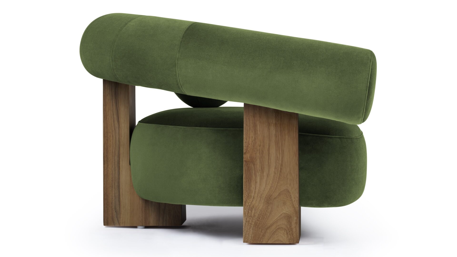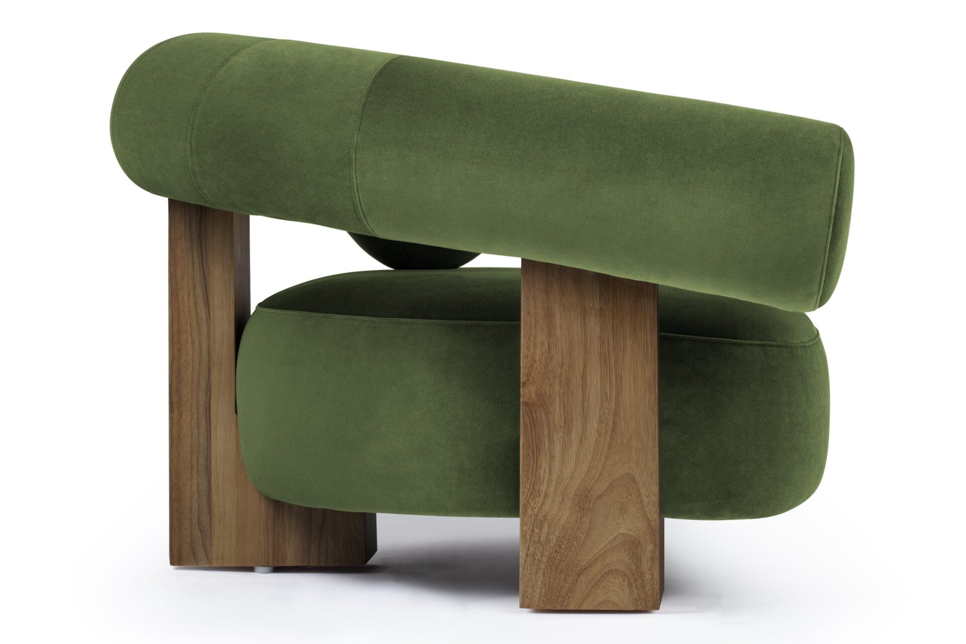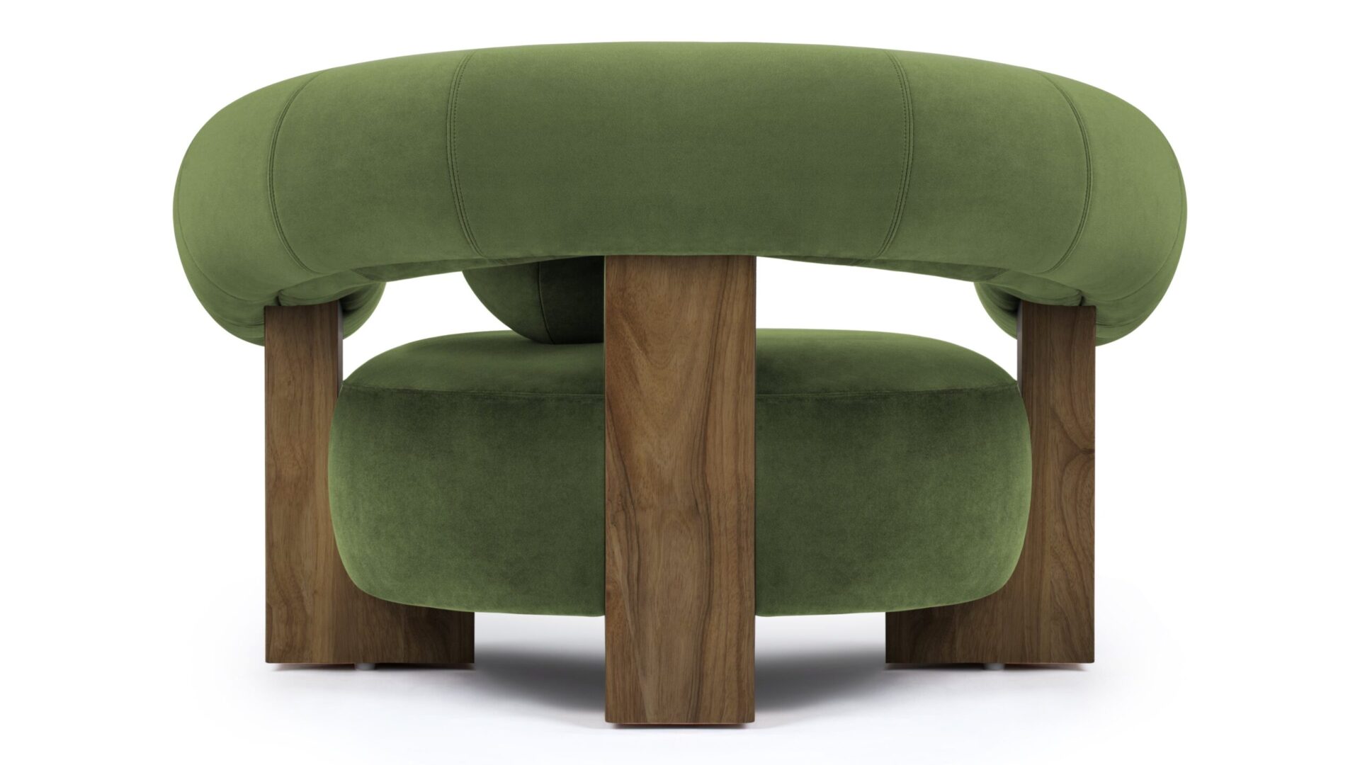 Introducing the captivating Liv Lounge Chair, an artistic statement piece that boldly marries strength and style. Featuring wide, curved arms and a charming ball-shaped cushion, this chair's striking silhouette is enhanced by lush Lichen Plush Velvet upholstery. Crafted with robust walnut pieces, it offers luxurious comfort and a refined focal point in any living space. Elevate your decor with the distinctive aesthetic of the Liv Lounge Chair.