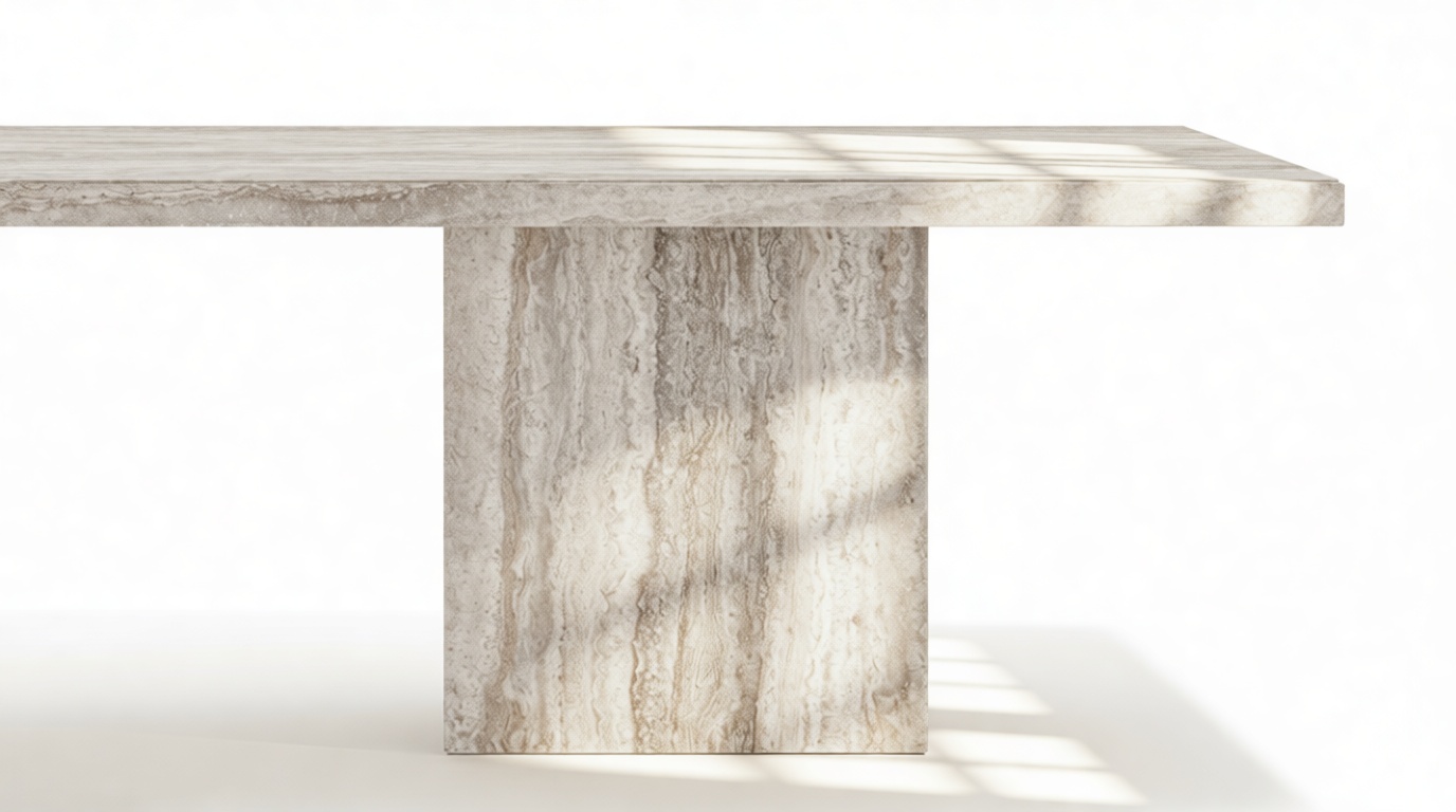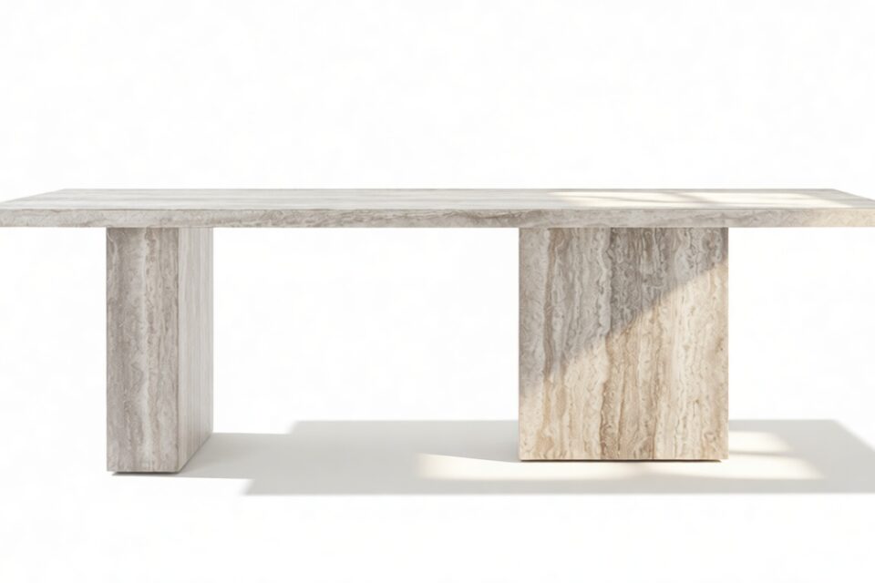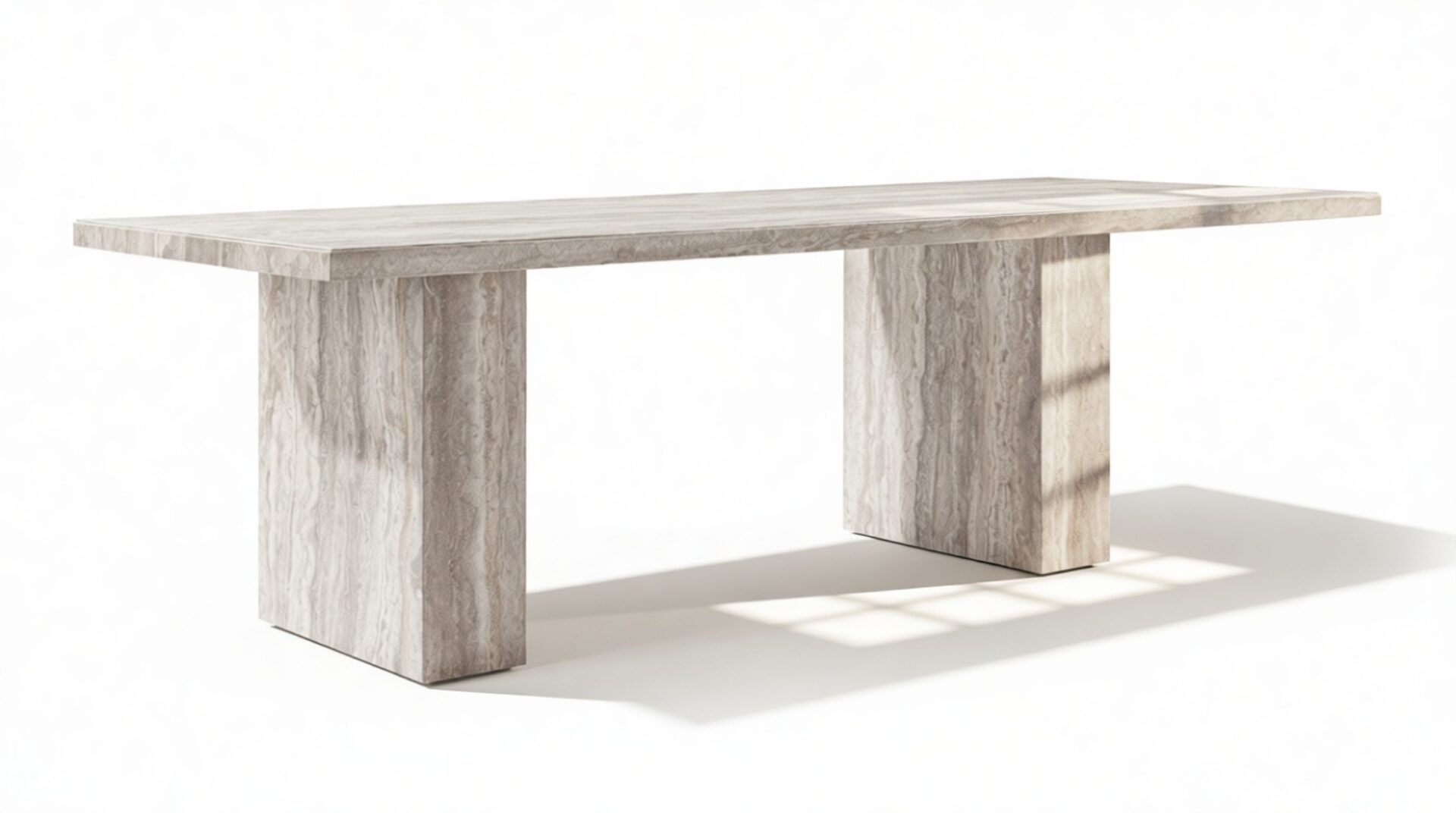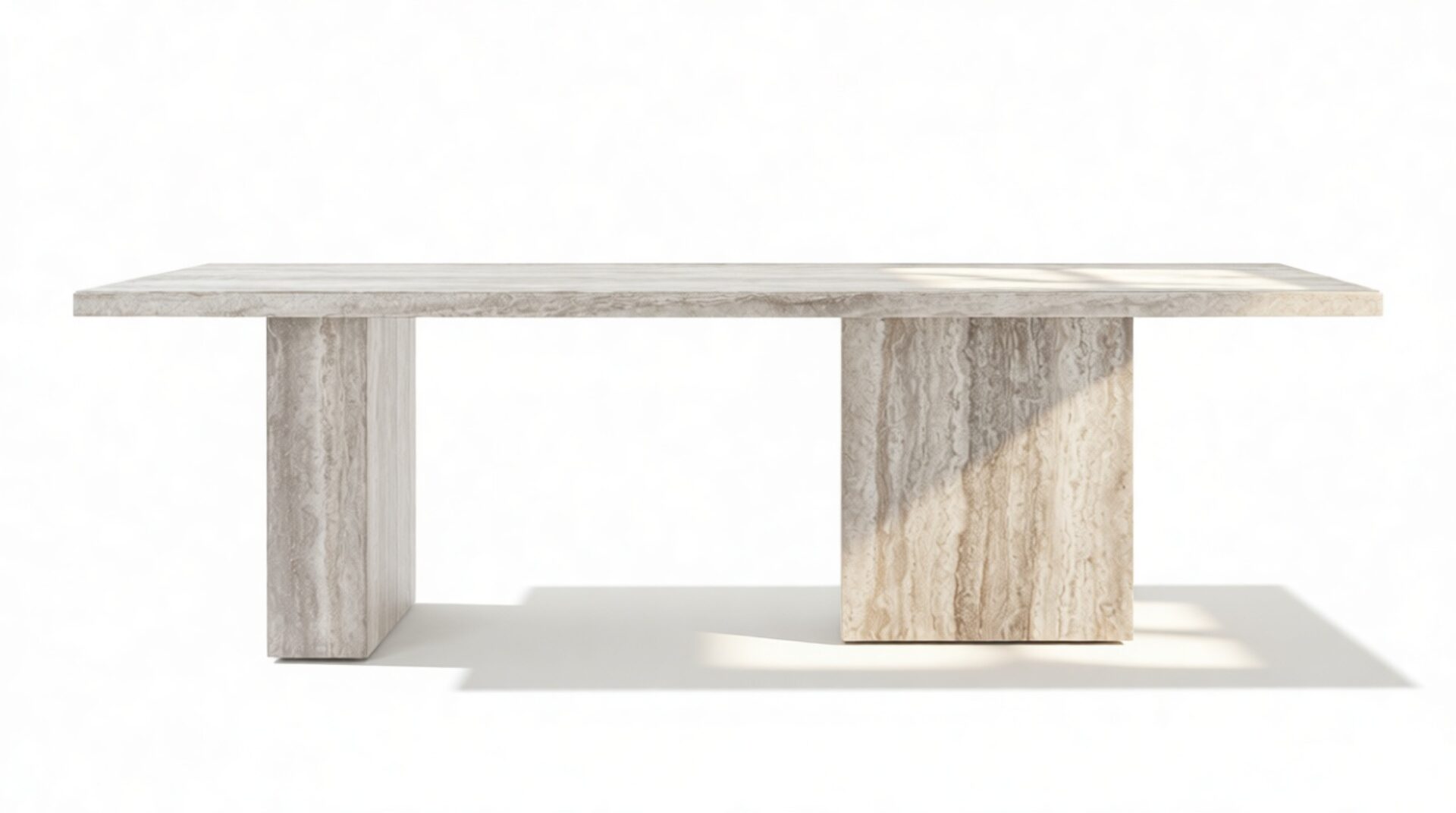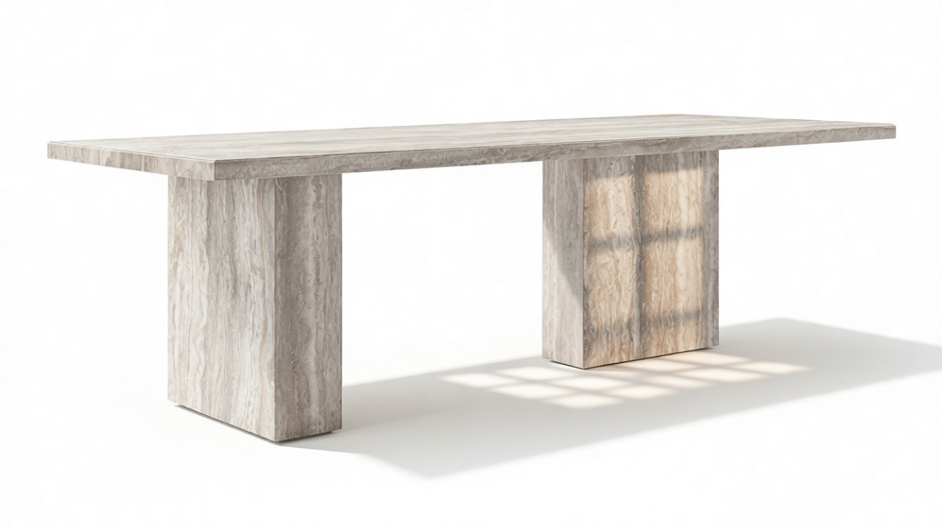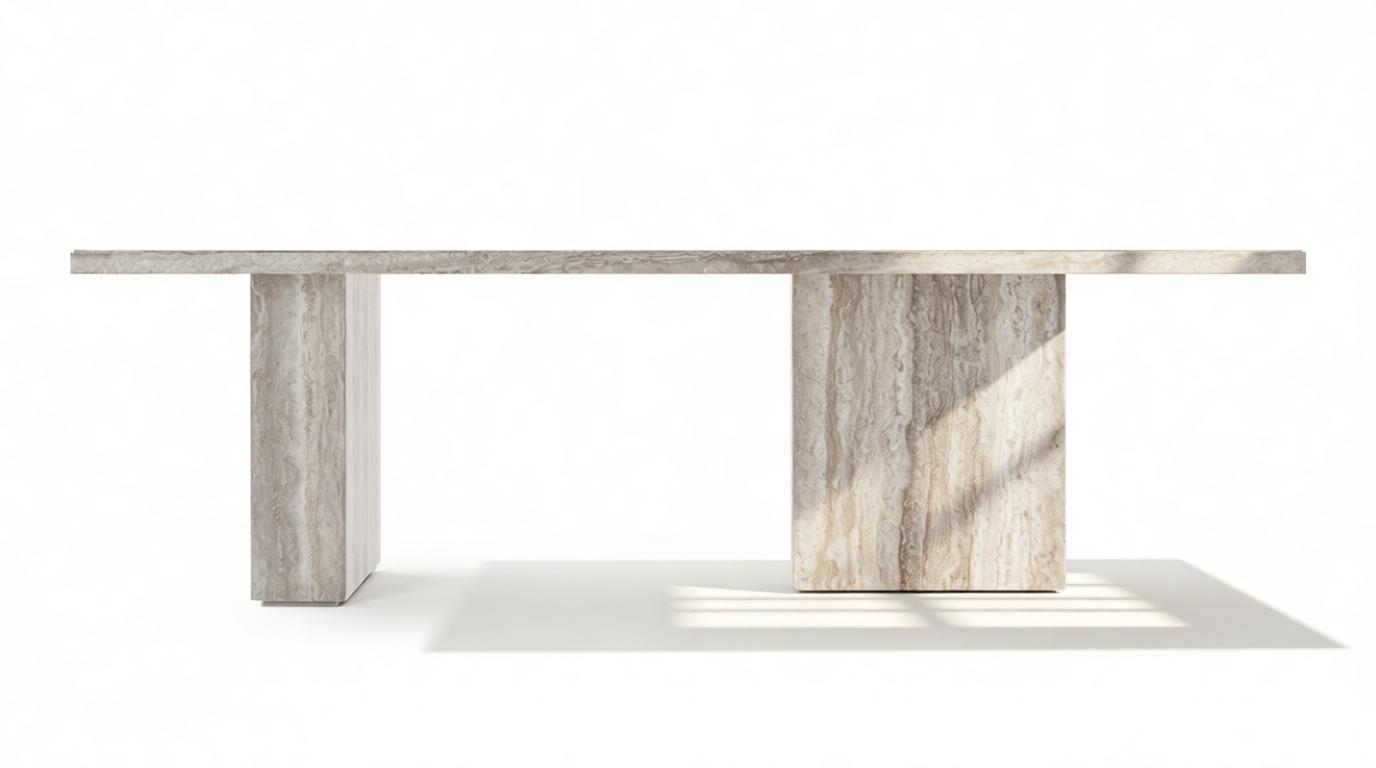 Elevate your dining experience with the Lorenzo Dining Table crafted from exquisite Silver Travertine. Its vast 98-inch tabletop hosts up to eight guests, ensuring memorable gatherings. The table's dual base system seamlessly transitions between symmetrical elegance and asymmetrical intrigue with a simple touch, making it a sculptural masterpiece. Explore the Lorenzo Dining Table's meticulous geometric precision and the rustic refinement of natural stone details for a sophisticated dining space transformation.