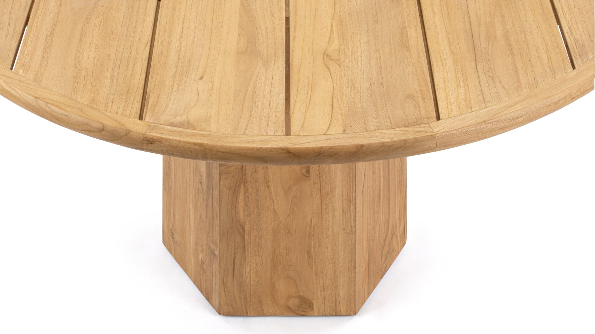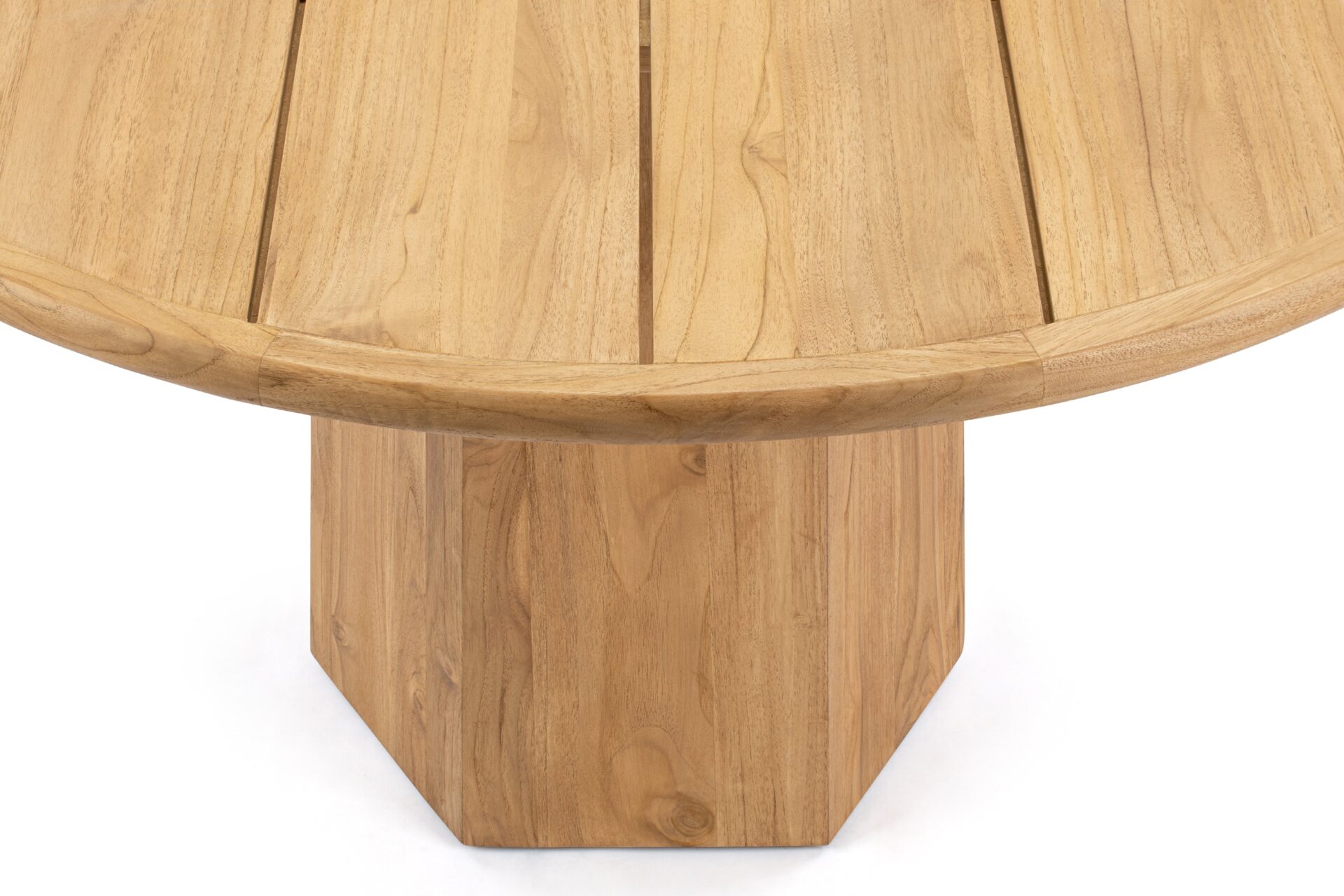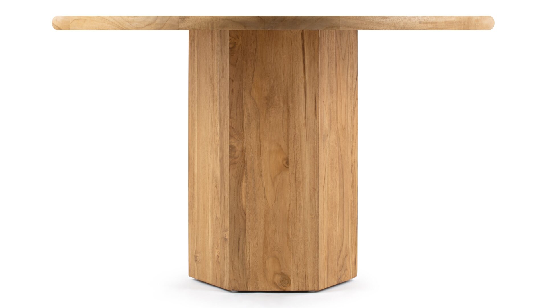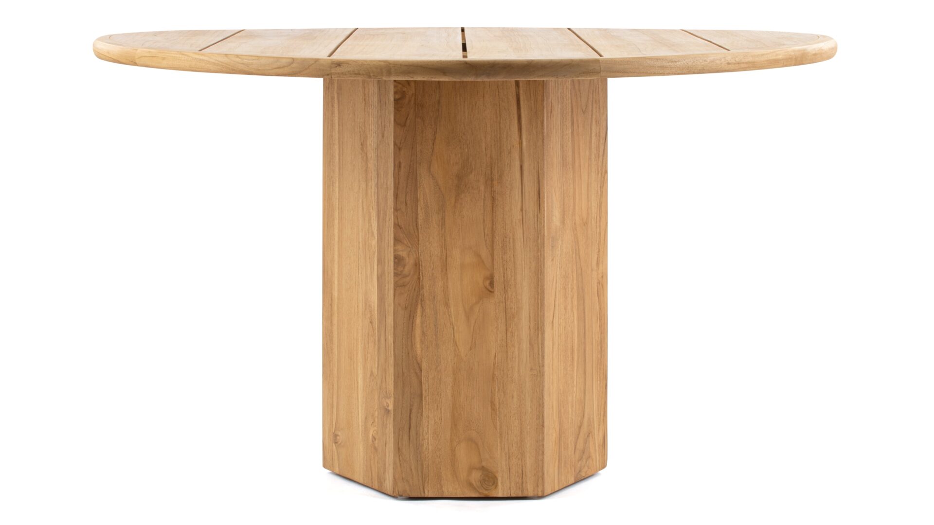 Enhance your outdoor dining experience with the Lotus Dining Table, a premium quality solid teak wood creation. Crafted for enduring beauty and longevity, this table showcases a plank-style grain, rounded shape, and robust pedestal base that seamlessly blend stability with visual appeal.