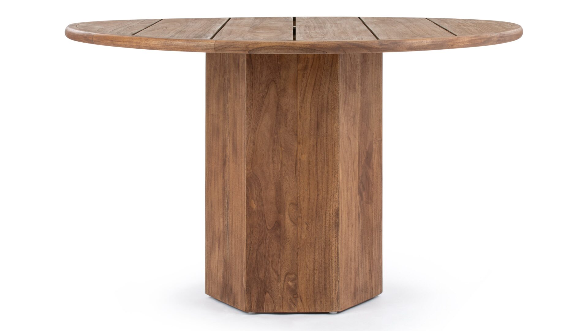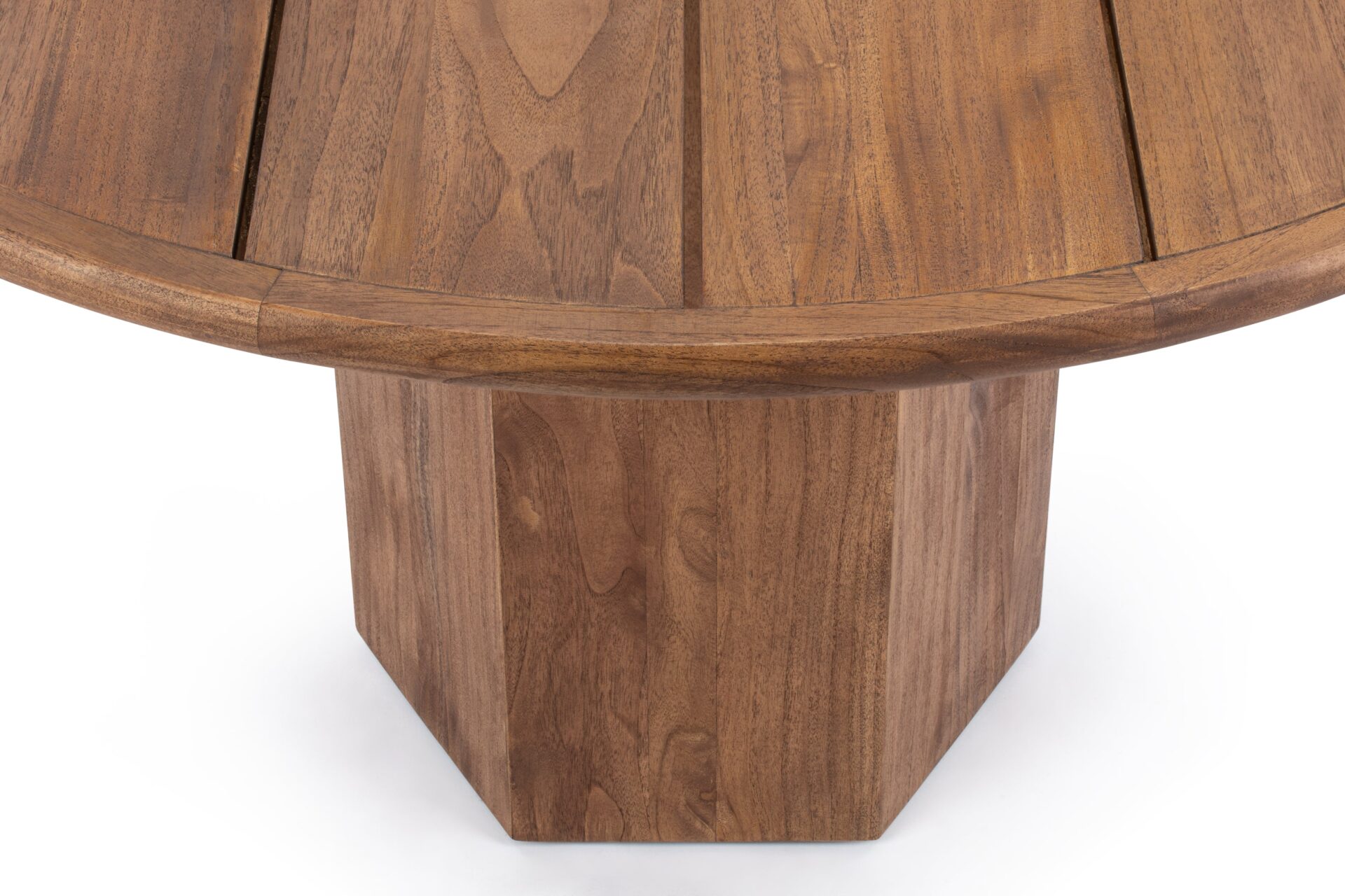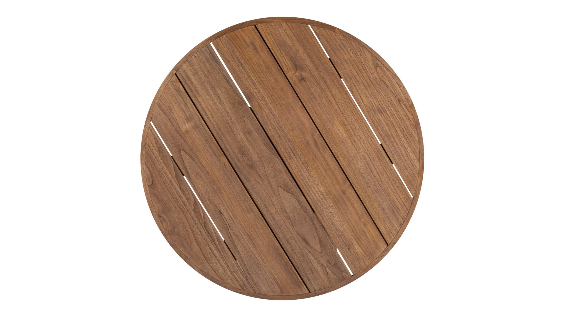 Featuring the rich allure of authentic teak wood, the "table" presents a circular, plank-style tabletop complemented by a robust pedestal base for a harmonious, understated aesthetic. Offered in both natural and walnut-stained variations, it introduces a touch of rustic sophistication to any room.