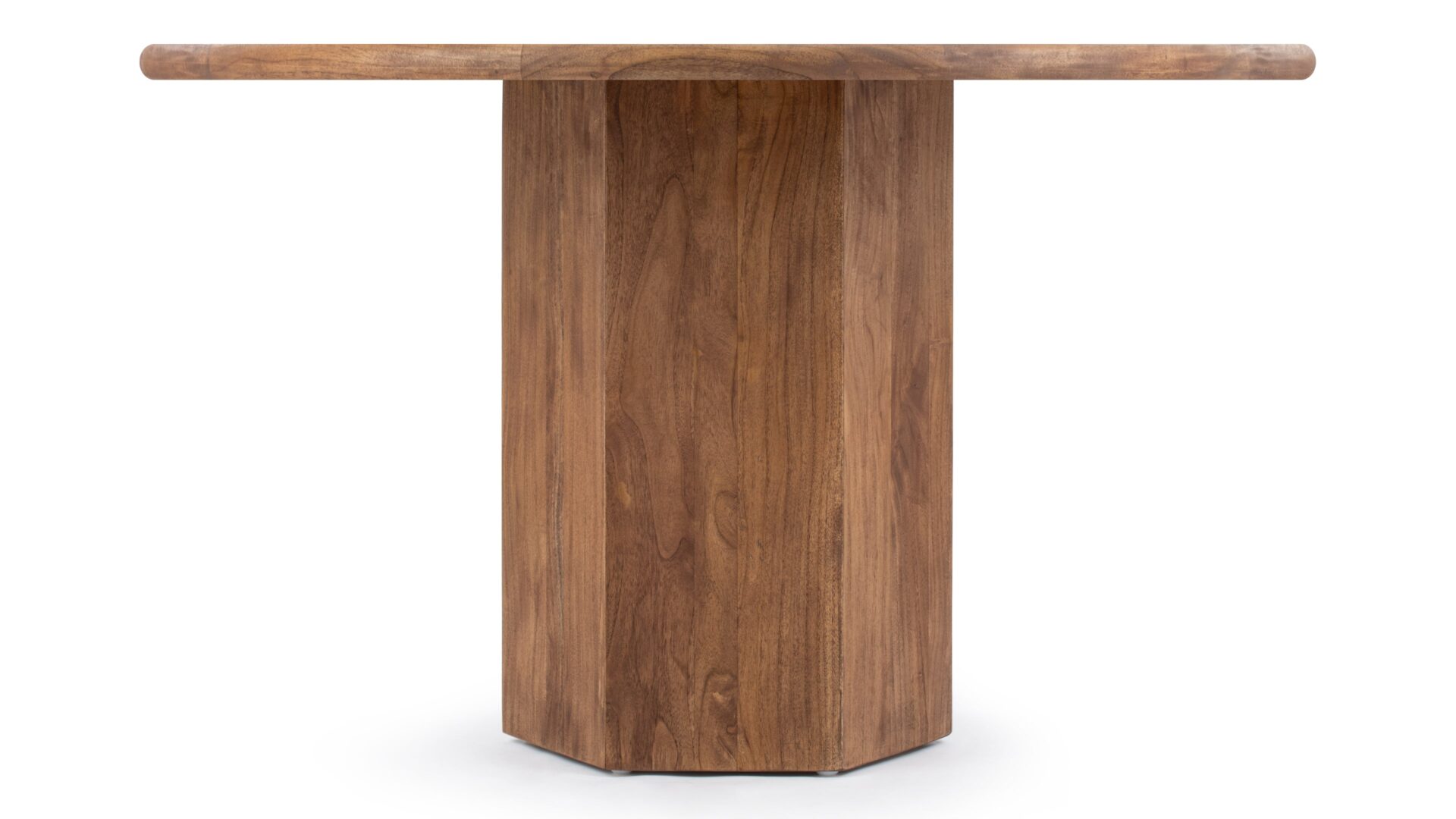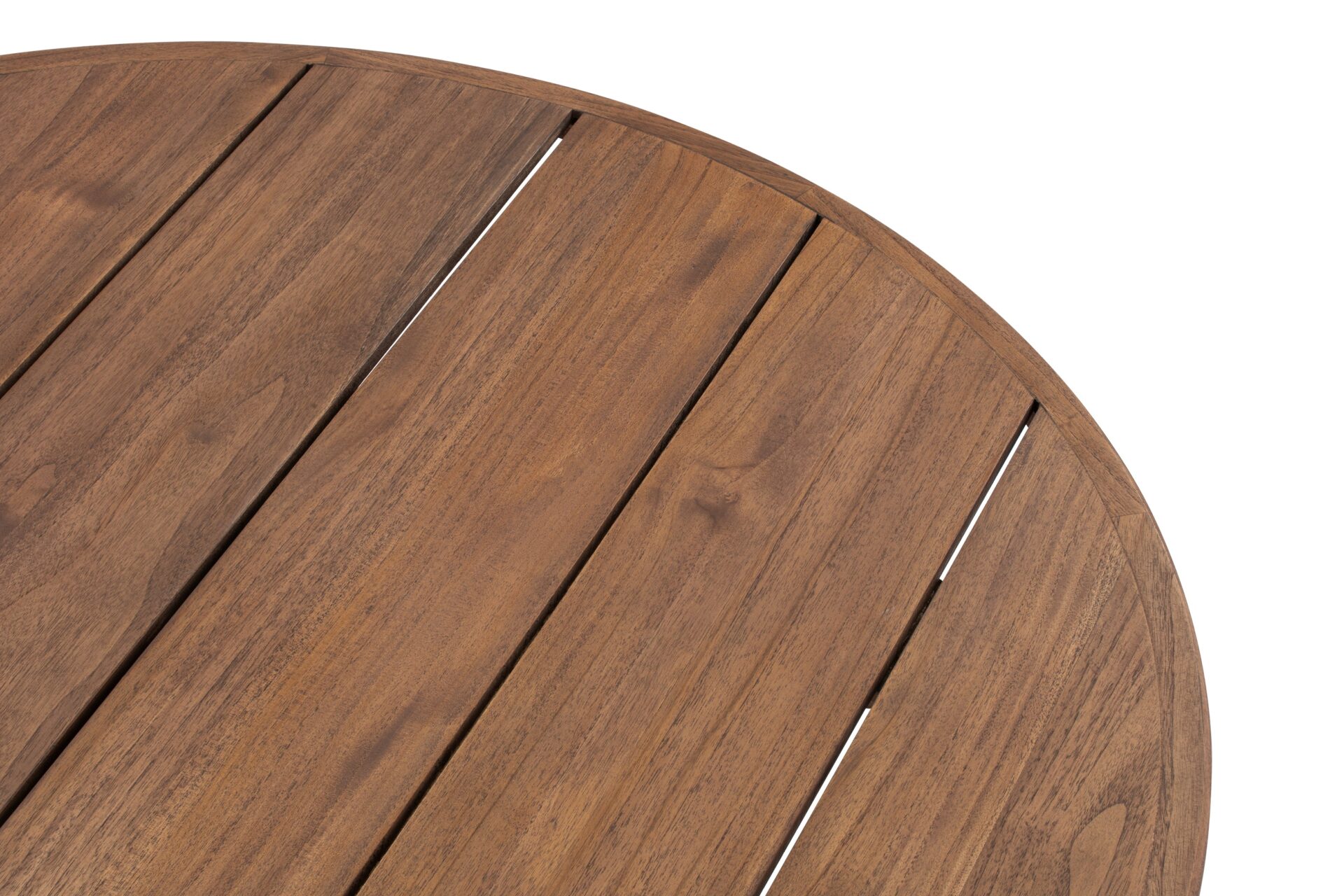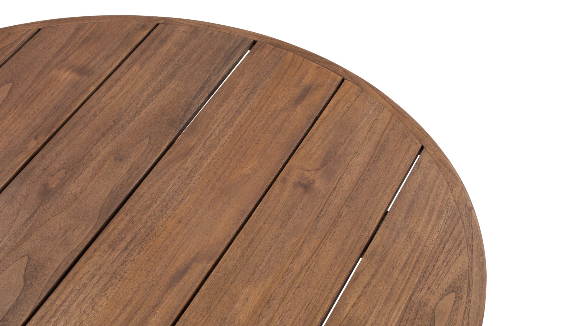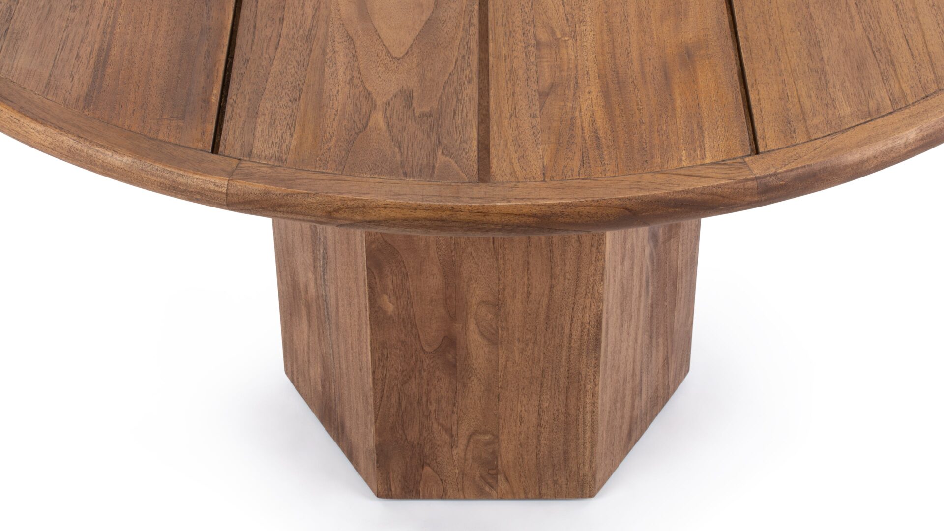 Featuring the rich allure of authentic teak wood, the "table" presents a circular, plank-style tabletop complemented by a robust pedestal base for a harmonious, understated aesthetic. Offered in both natural and walnut-stained variations, it introduces a touch of rustic sophistication to any room.