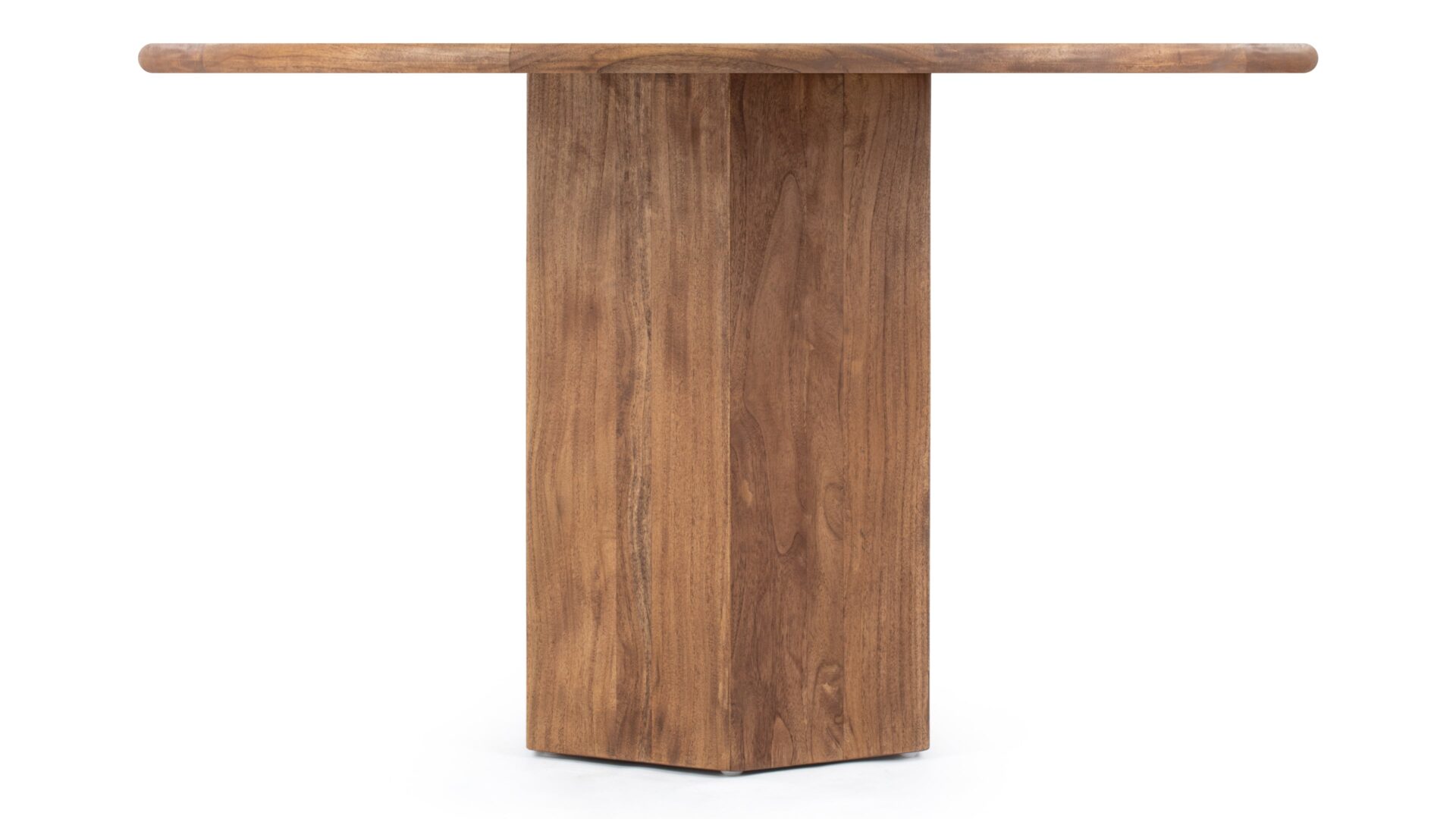 Forged from sturdy teak wood, the Lotus Dining Table promises longevity and robustness in the face of outdoor conditions, rendering it a top-notch selection for patios, terraces, and gardens. The circular tabletop features a plank-style wood grain, introducing a rustic yet sophisticated appearance, amplified by the reliable pedestal base that ensures both steadiness and a sleek, minimalist allure. Offered in a natural finish for an untouched, authentic look or a walnut stain for a touch of refinement, this tabletop effortlessly harmonizes with diverse outdoor aesthetics.