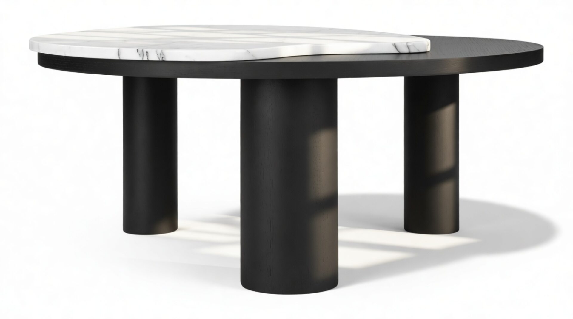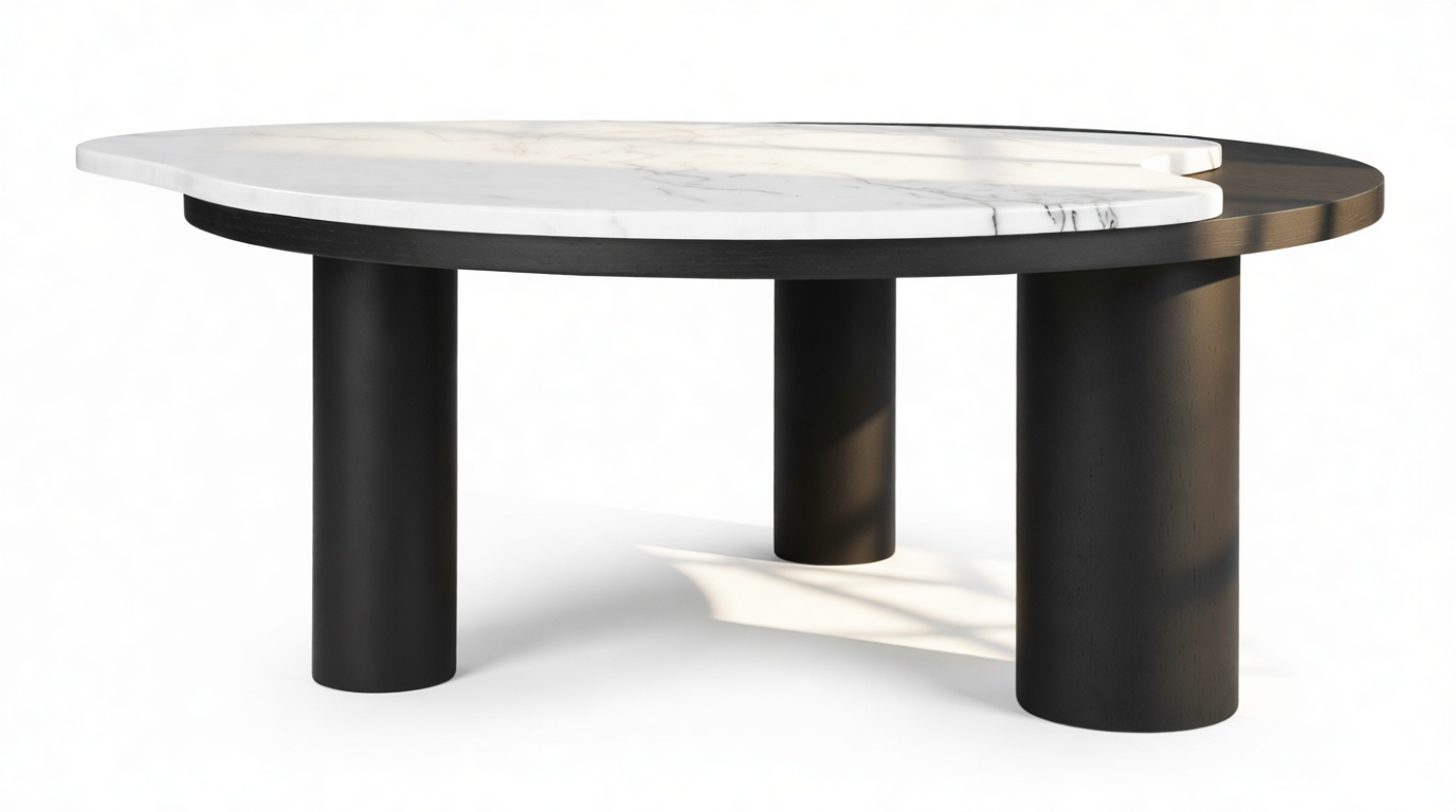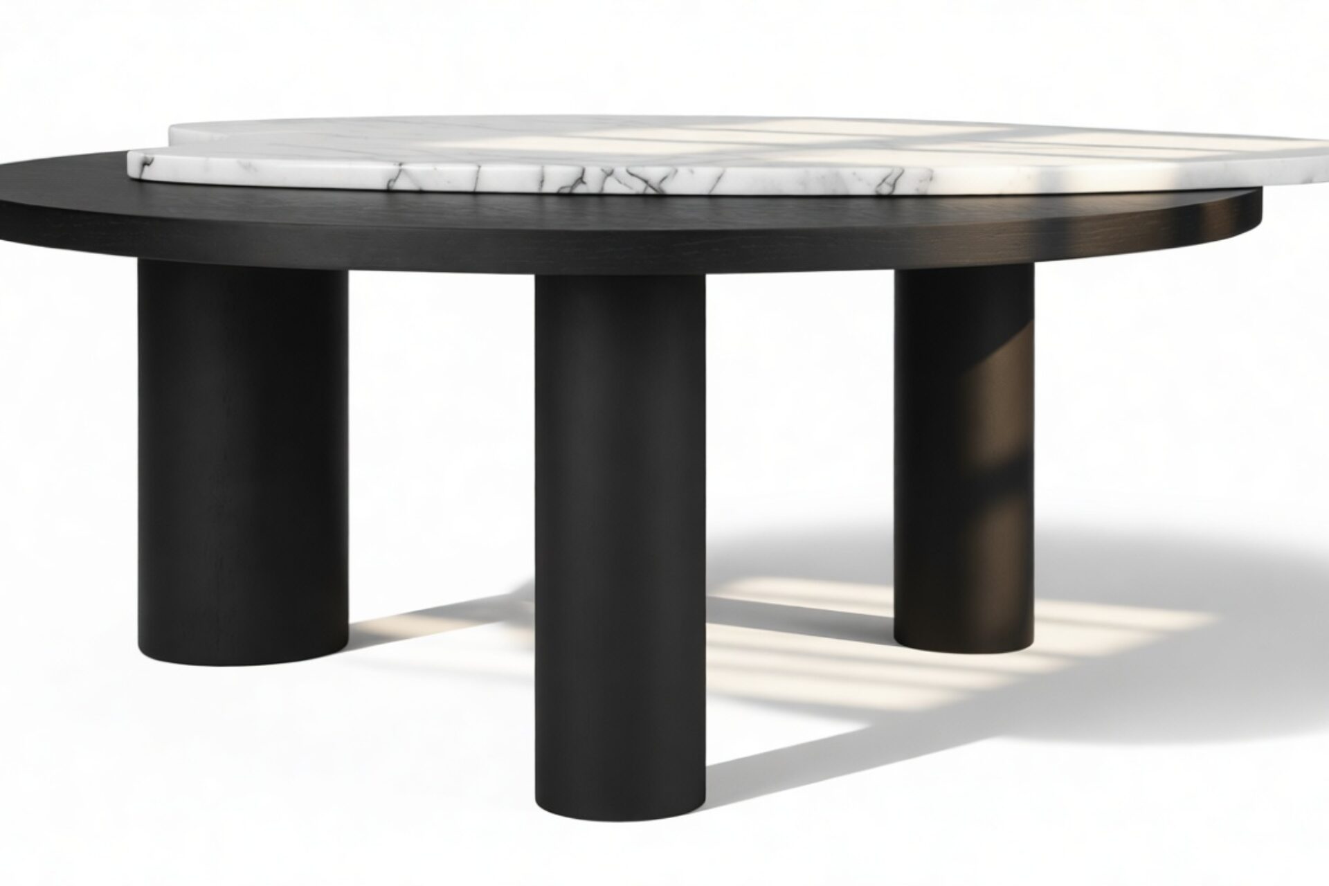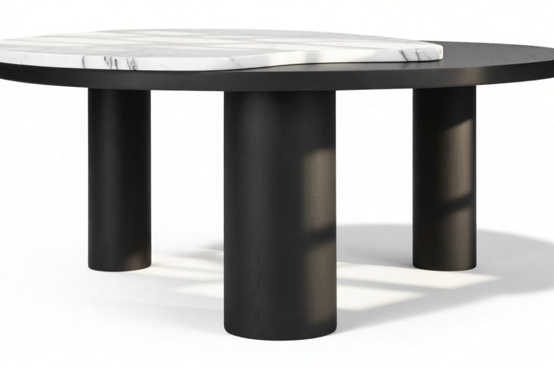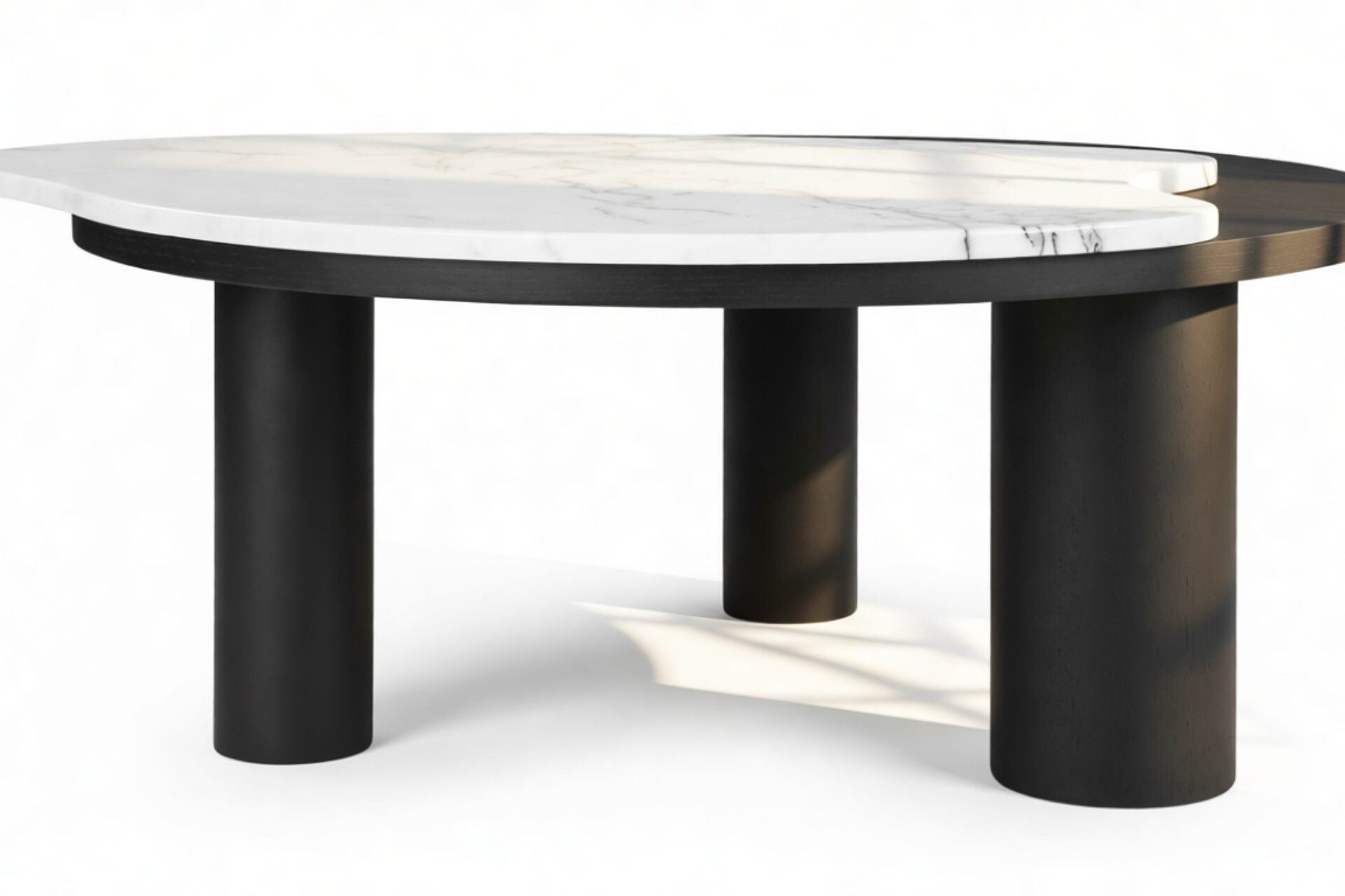 Discover the striking modern design of the Lucera Coffee Table, featuring organic shapes and asymmetrical legs for a contemporary aesthetic. Crafted with a mix of matte black and honed white Calacatta marble, each piece showcases unique, natural dark veins for a touch of sophistication and style.