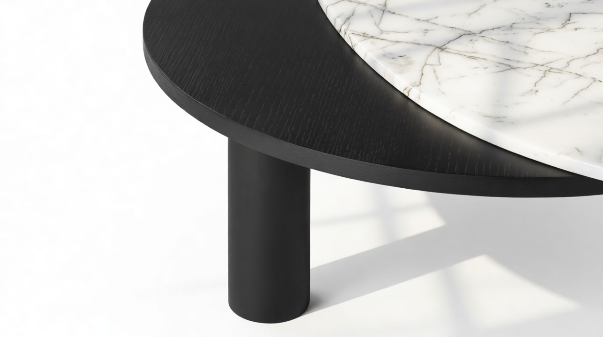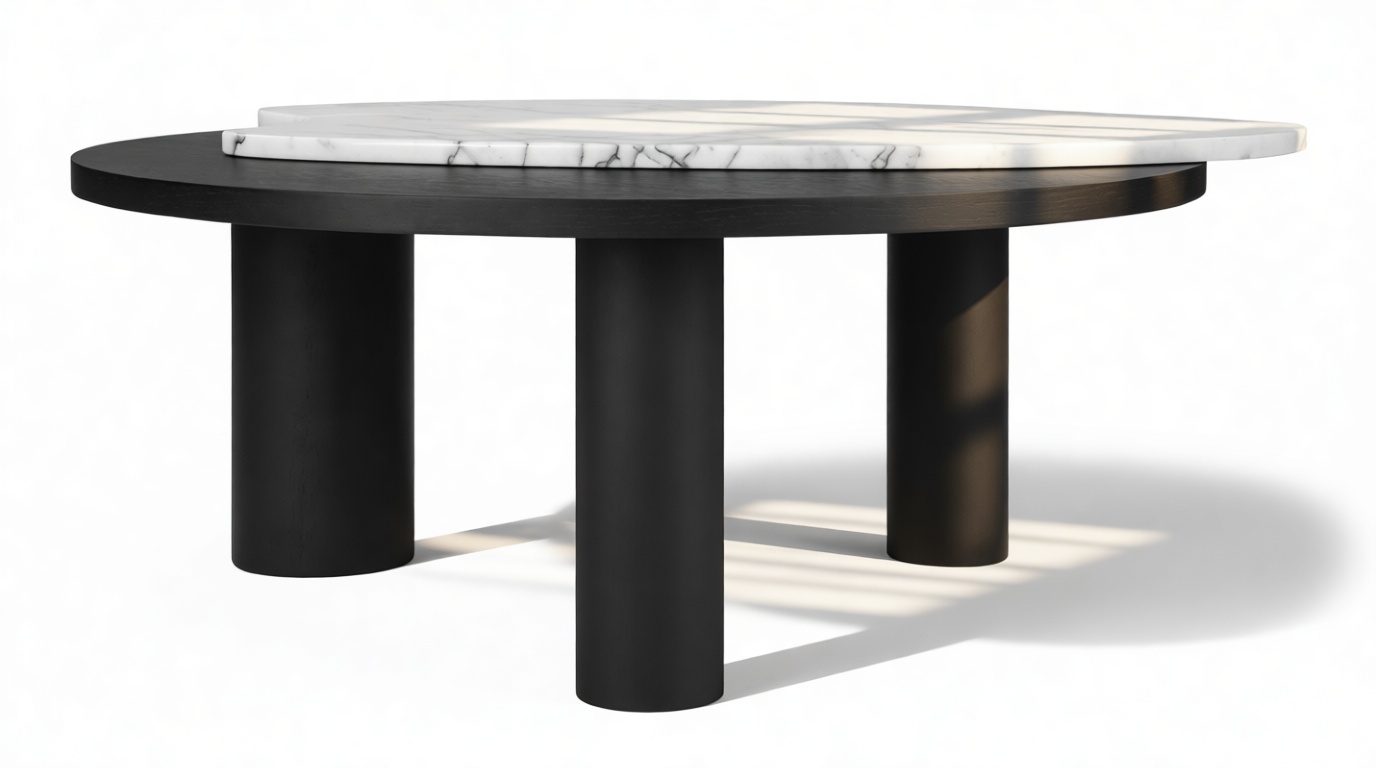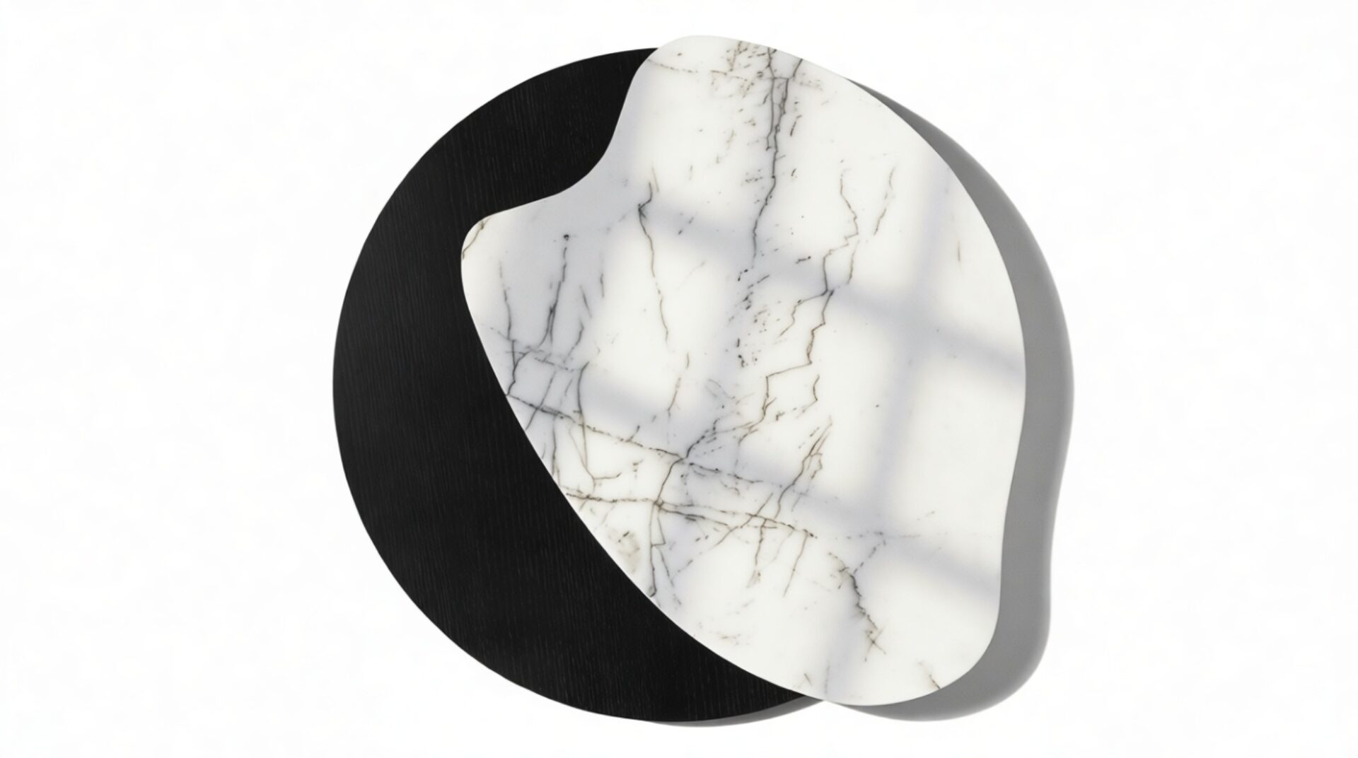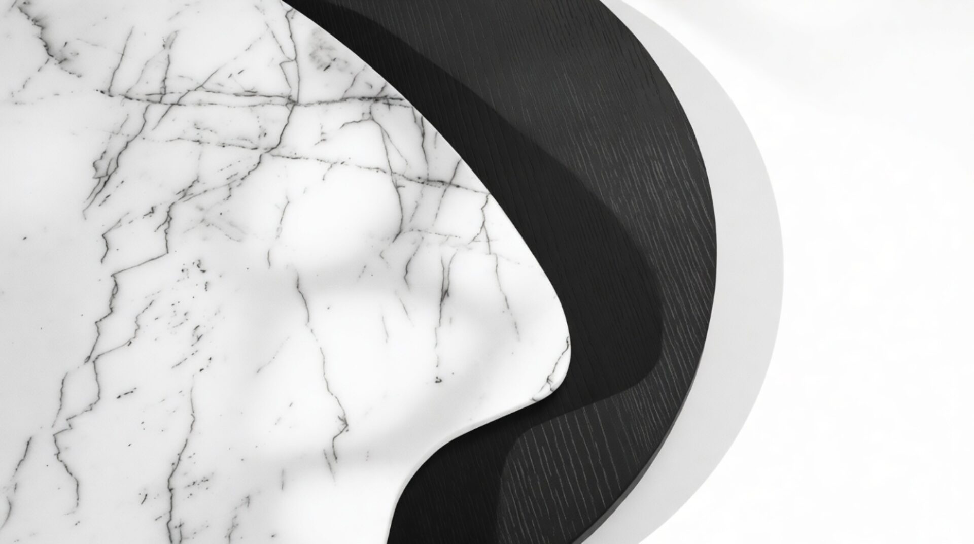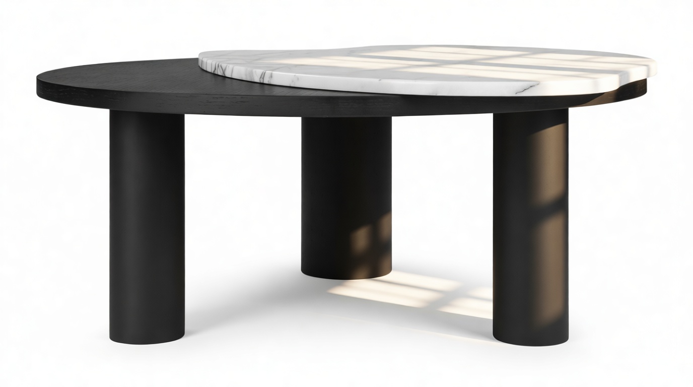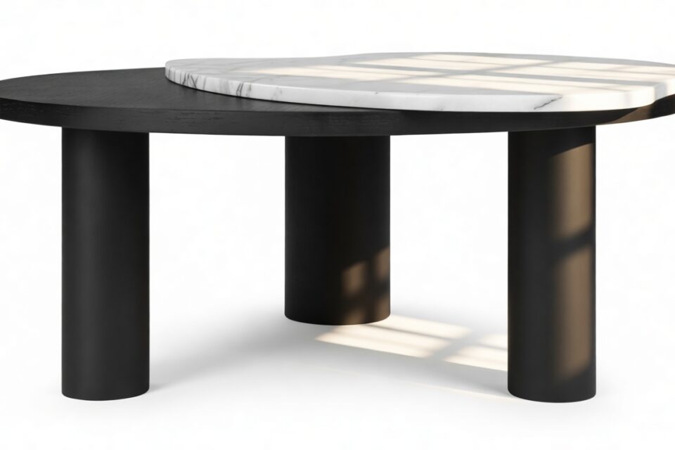 Discover the striking modern design of the Lucera Coffee Table, featuring organic shapes and asymmetrical legs for a contemporary aesthetic. Crafted with a mix of matte black and honed white Calacatta marble, each piece showcases unique, natural dark veins for a touch of sophistication and style.