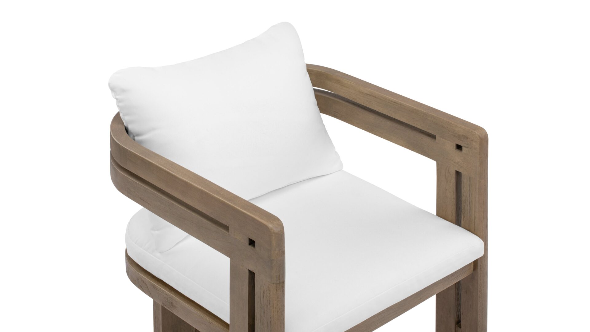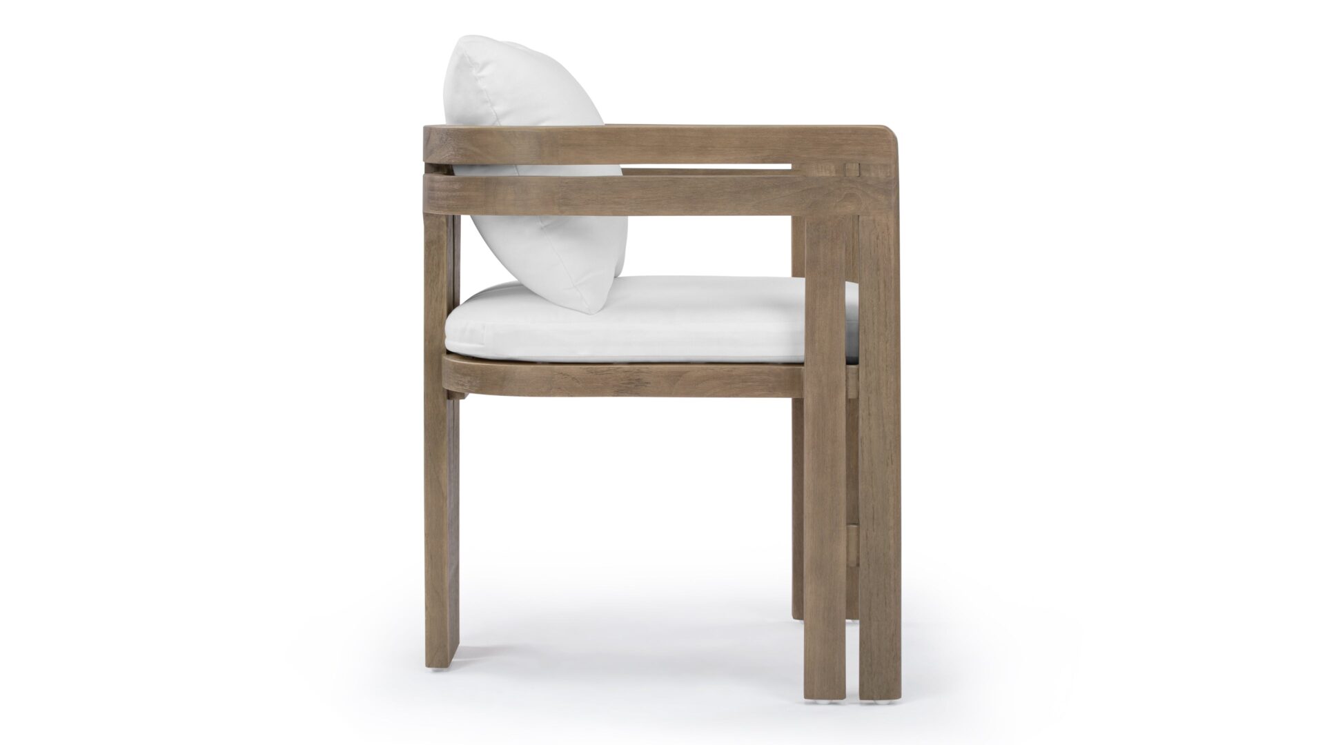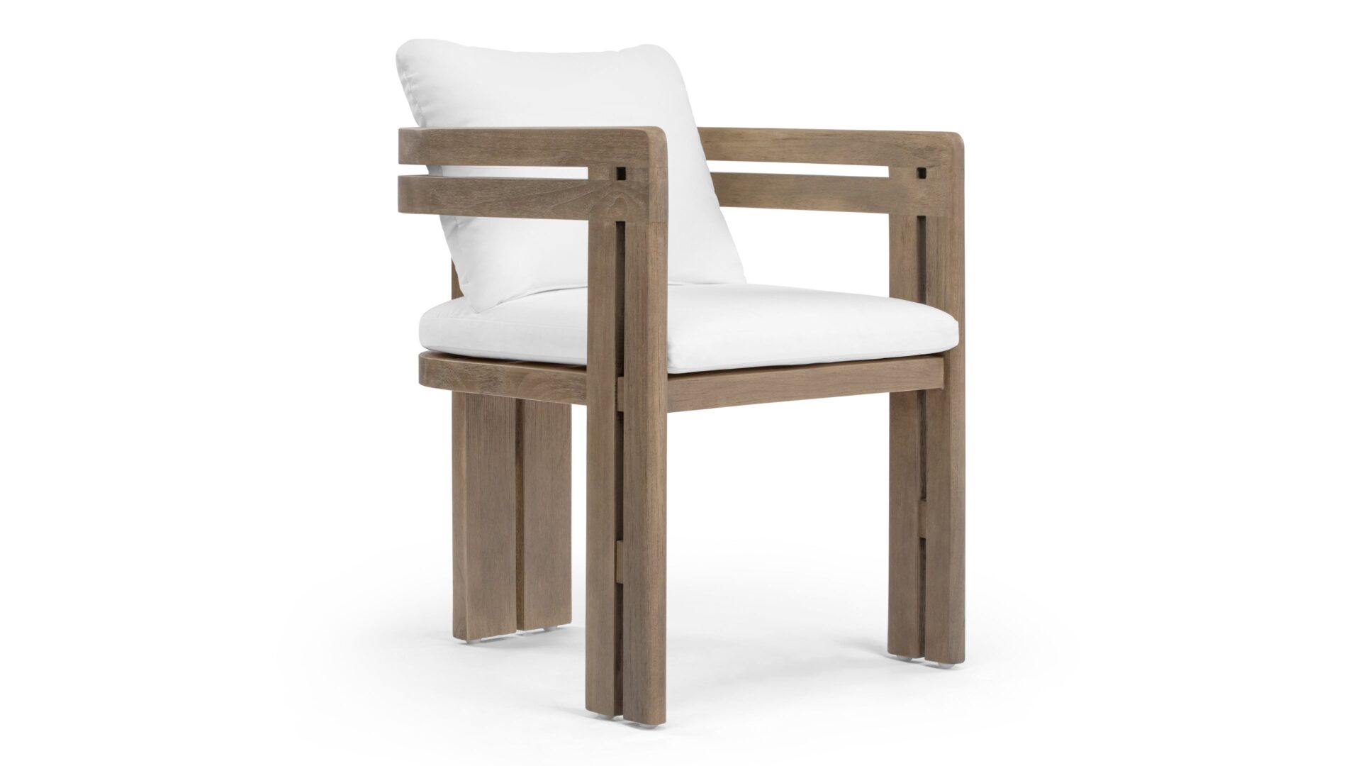 Elevate your outdoor living space with the Lusso Outdoor Collection, inspired by midcentury modern elegance. Crafted from durable teak wood, the Lusso Outdoor Dining Chair in Weathered Teak with White Cushions embodies sophistication and resilience. Every detail is meticulously designed to enhance your outdoor area's allure and personality, creating a perfect blend of style and comfort for memorable gatherings.