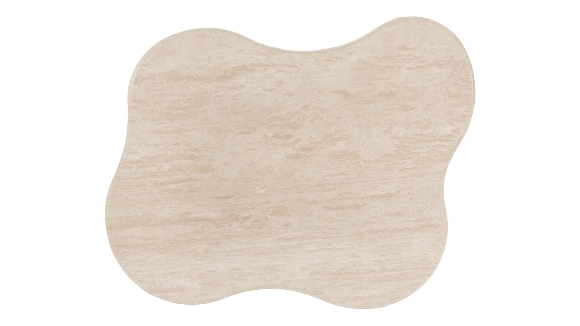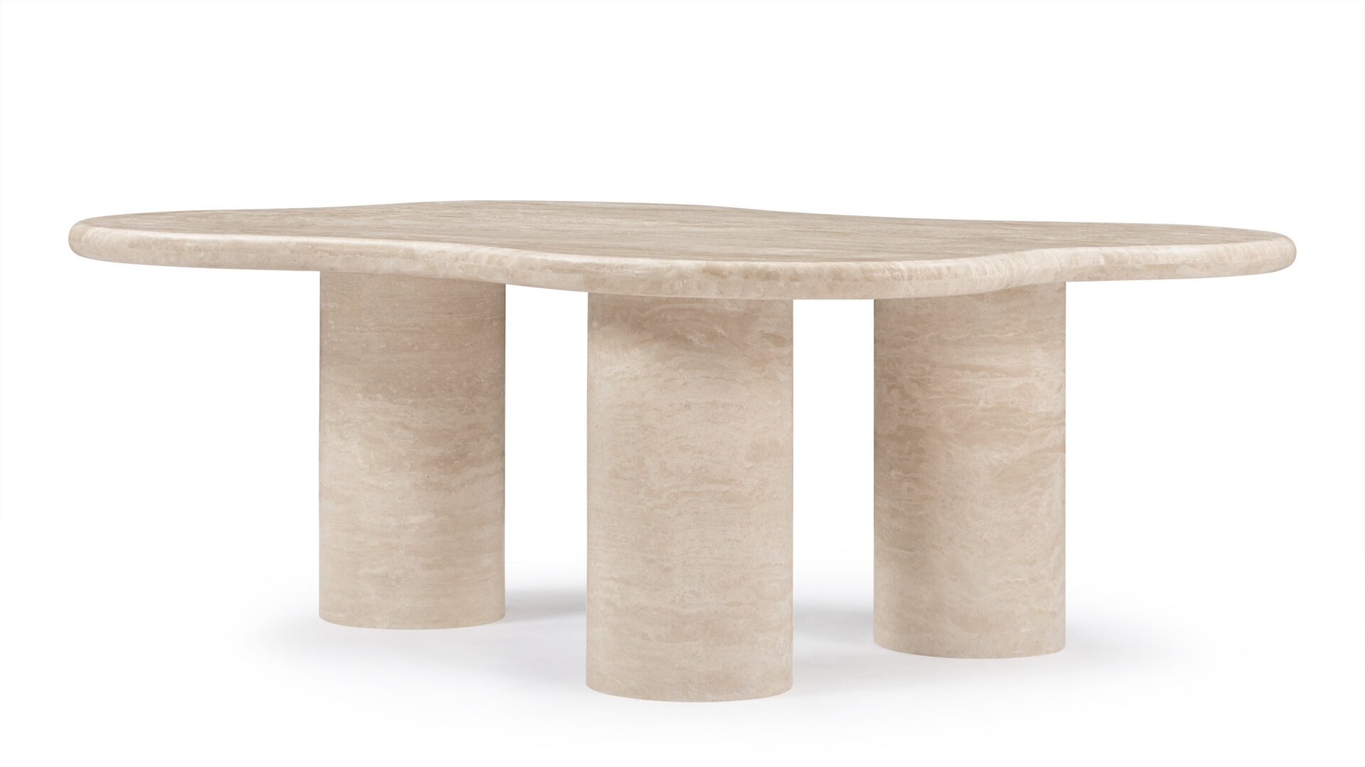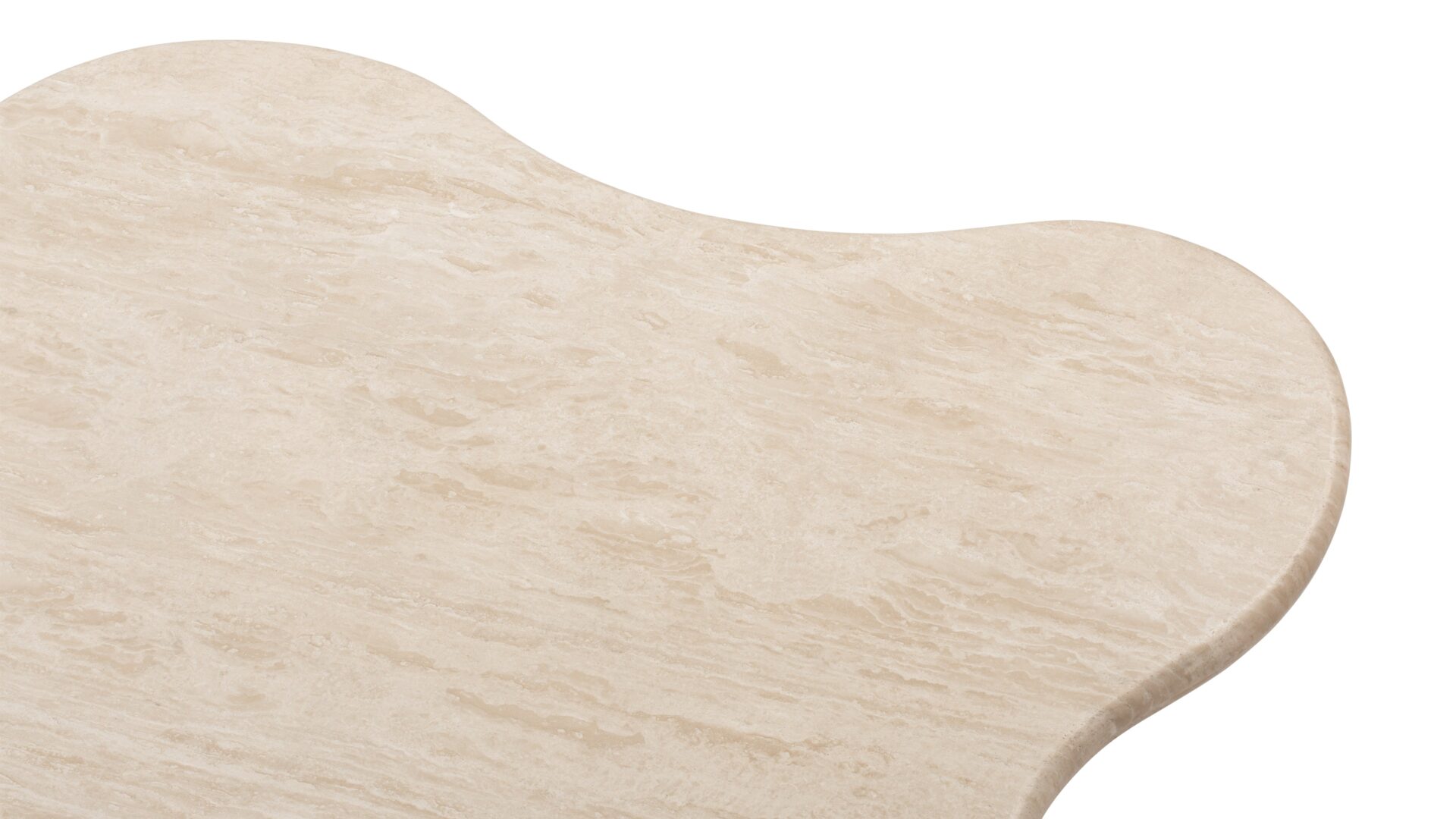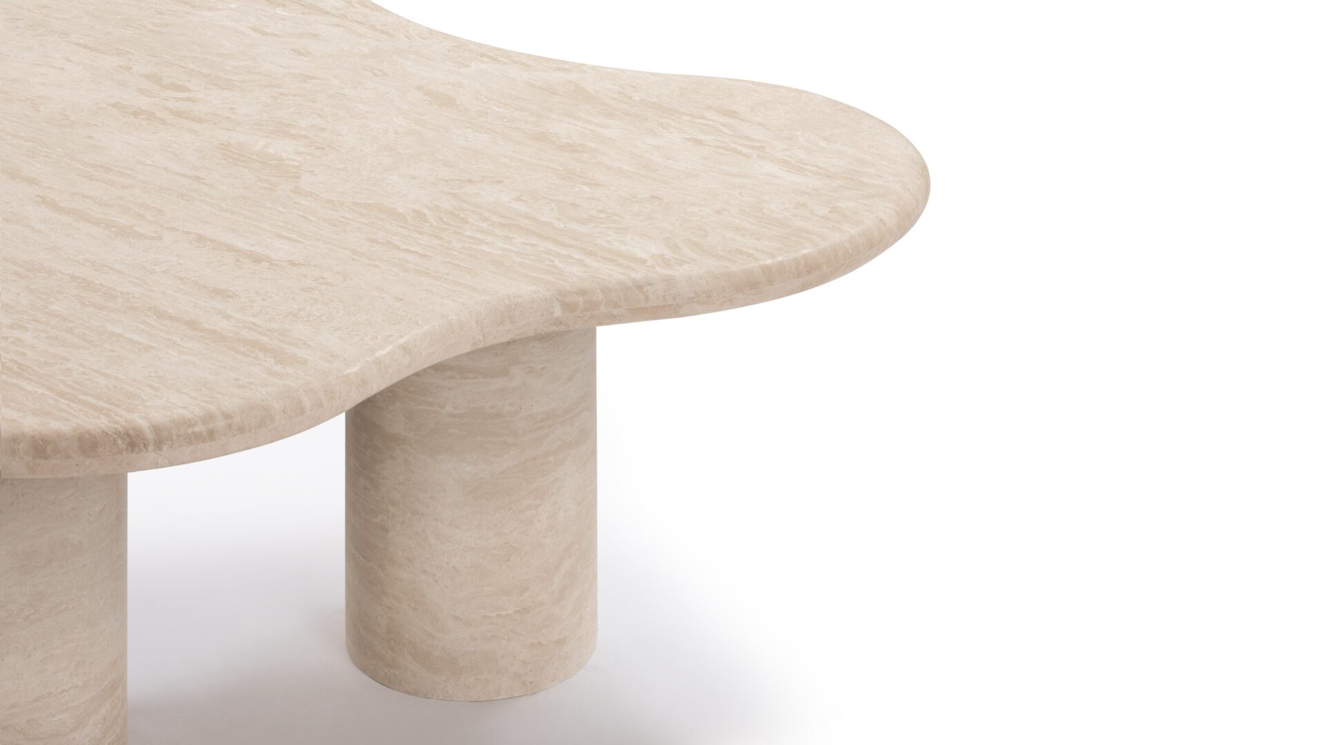 Experience the refined elegance of the Darcy Coffee Table with its travertine material showcasing natural beige tones and intricate cloud-like patterns. The table's smooth, flowing curves and polished finish perfectly highlight a harmonious blend of artistry and simplicity.