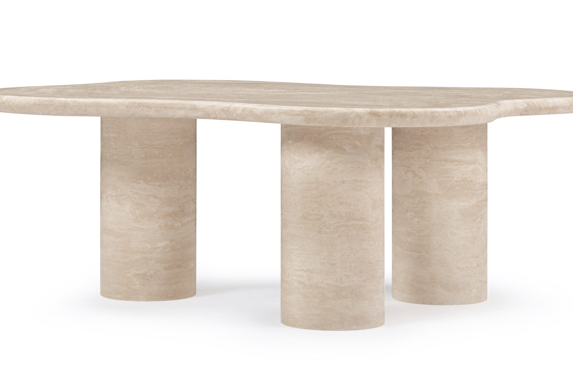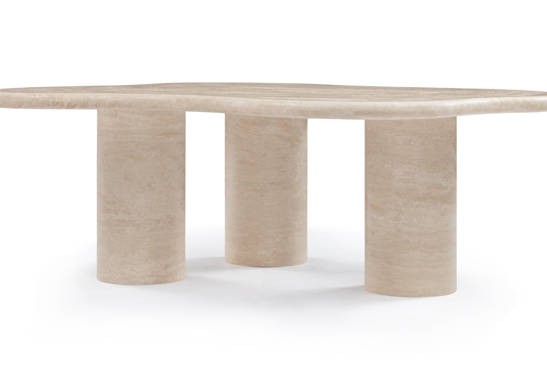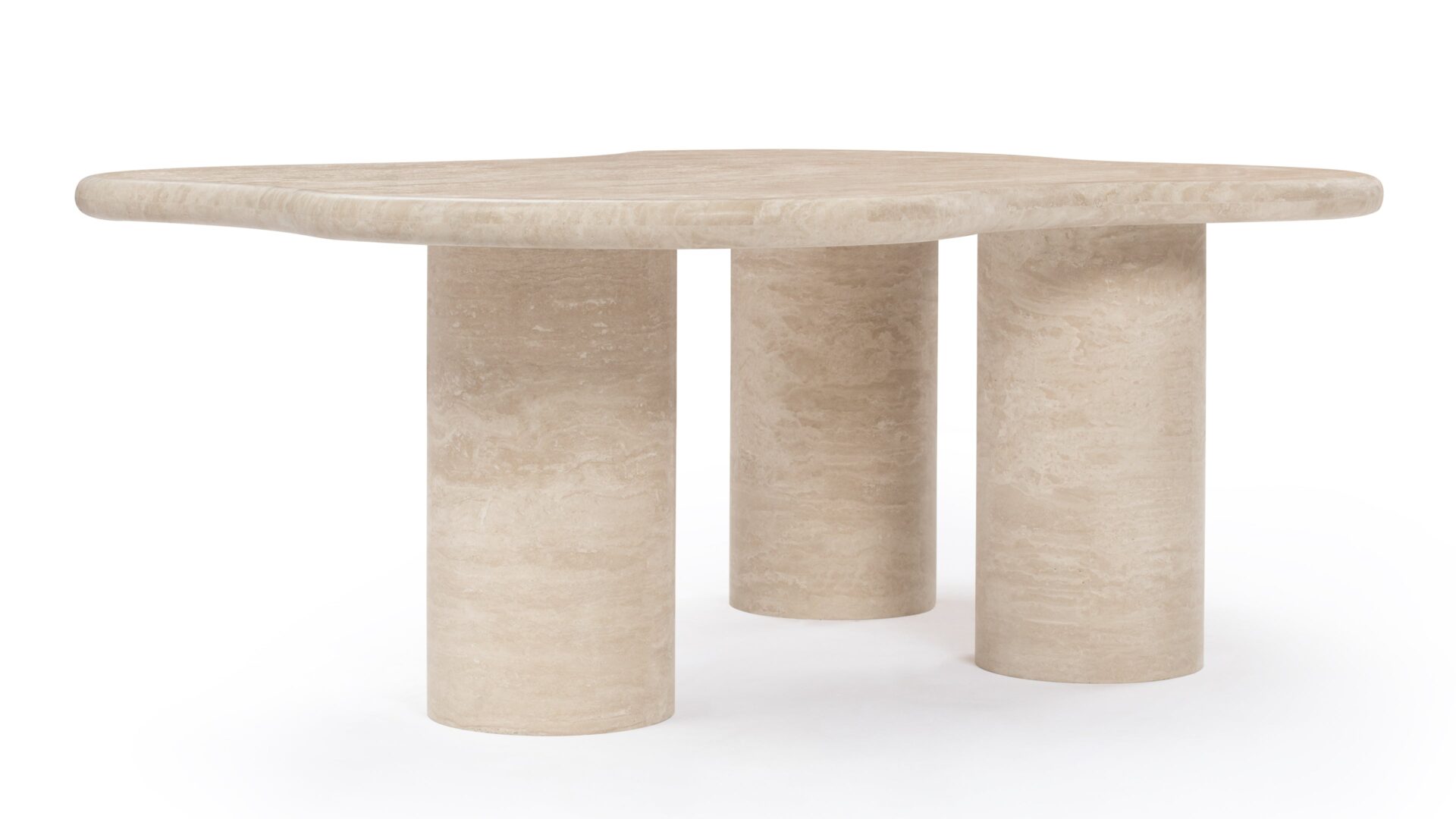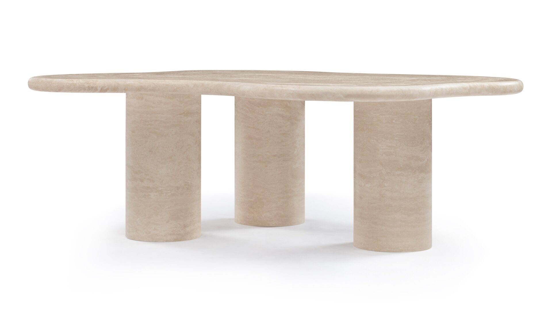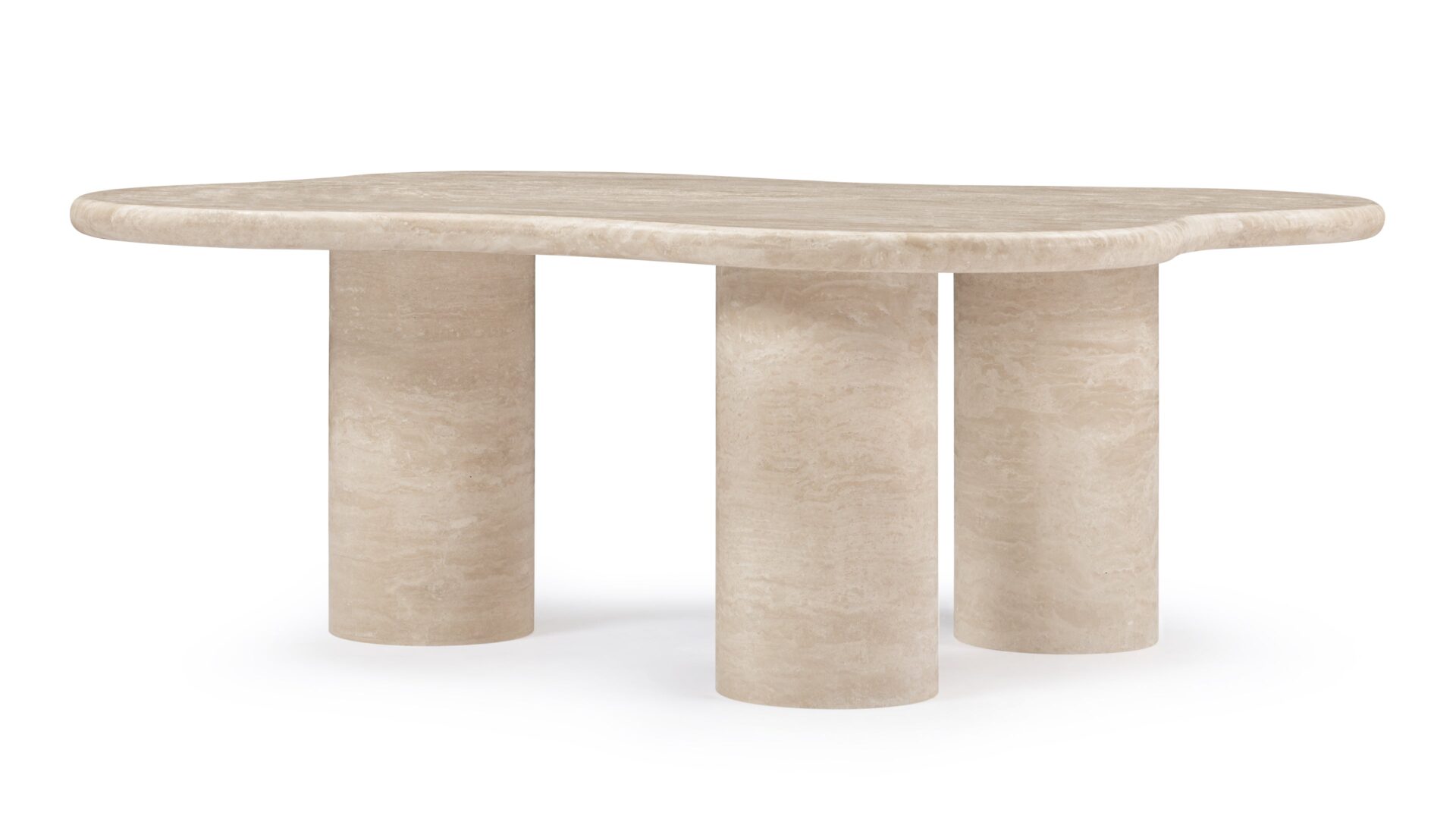 Discover the Maldon Coffee Table, a stunning travertine-crafted masterpiece showcasing a sculptural organic design. Boasting flowing curves, a polished surface, and sturdy cylindrical legs, this table embodies a minimalist and contemporary aesthetic, ideal for modern interiors.
