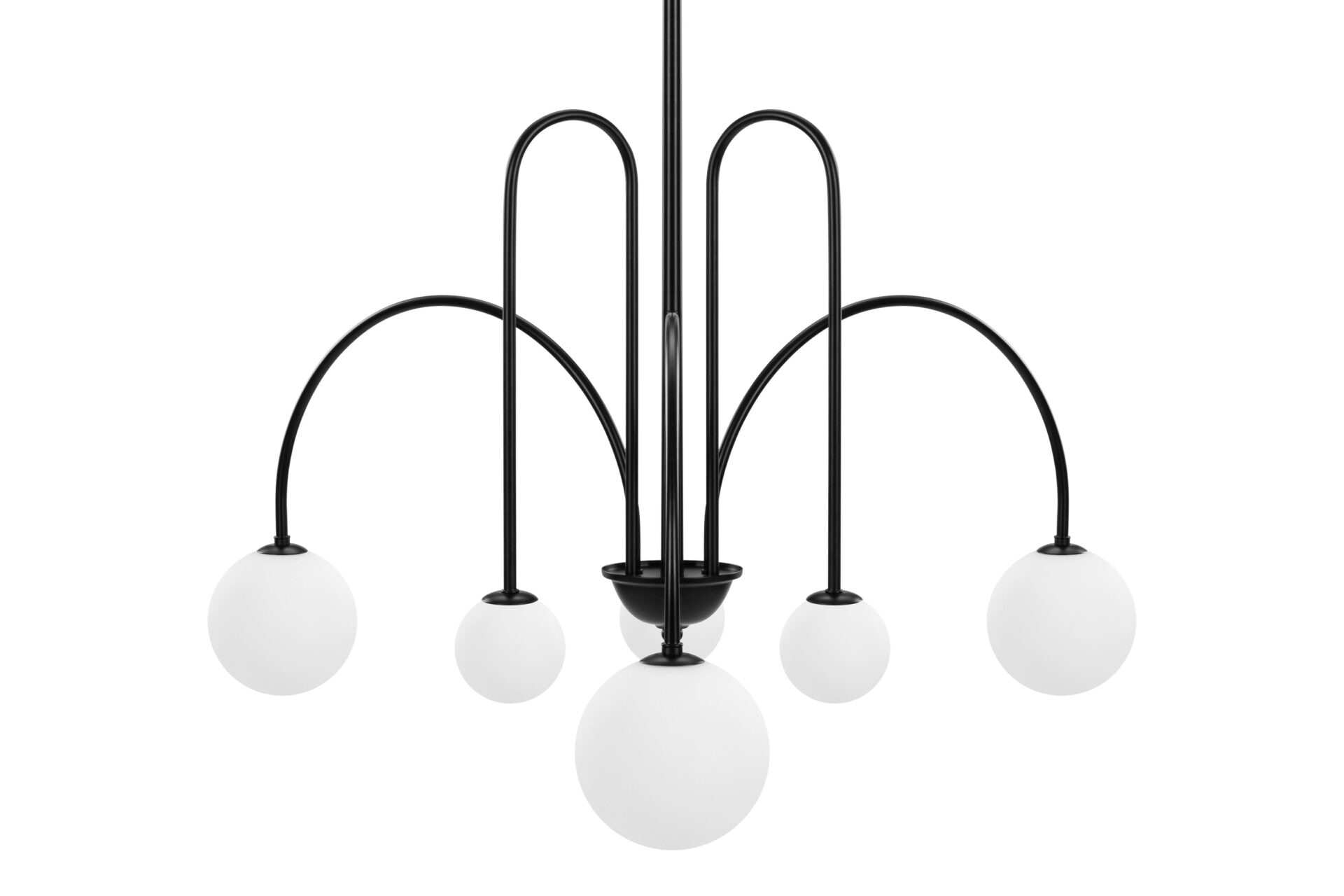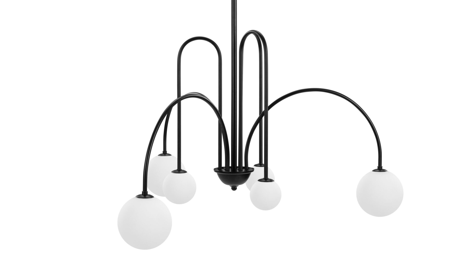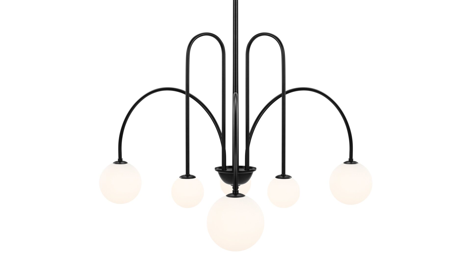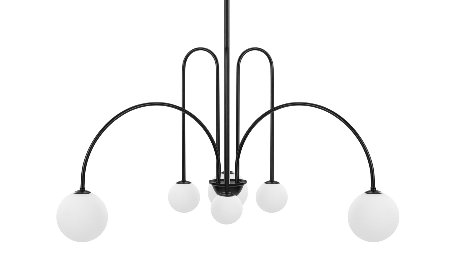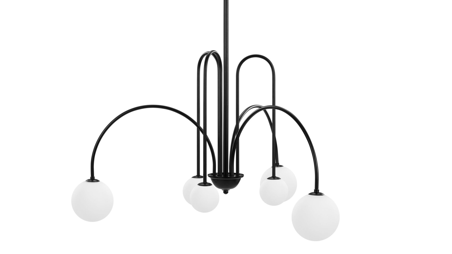 Introducing the Mars Chandelier, showcasing slender, wrought iron arms adorned in a classic matte black finish. The distinctive shapes meld tall, sharp arches with shallower arcs and wide curves, resulting in a dynamic and refined appearance. Unlike traditional chandeliers, this fixture features arms that point downwards, offering a contemporary twist on a timeless design.