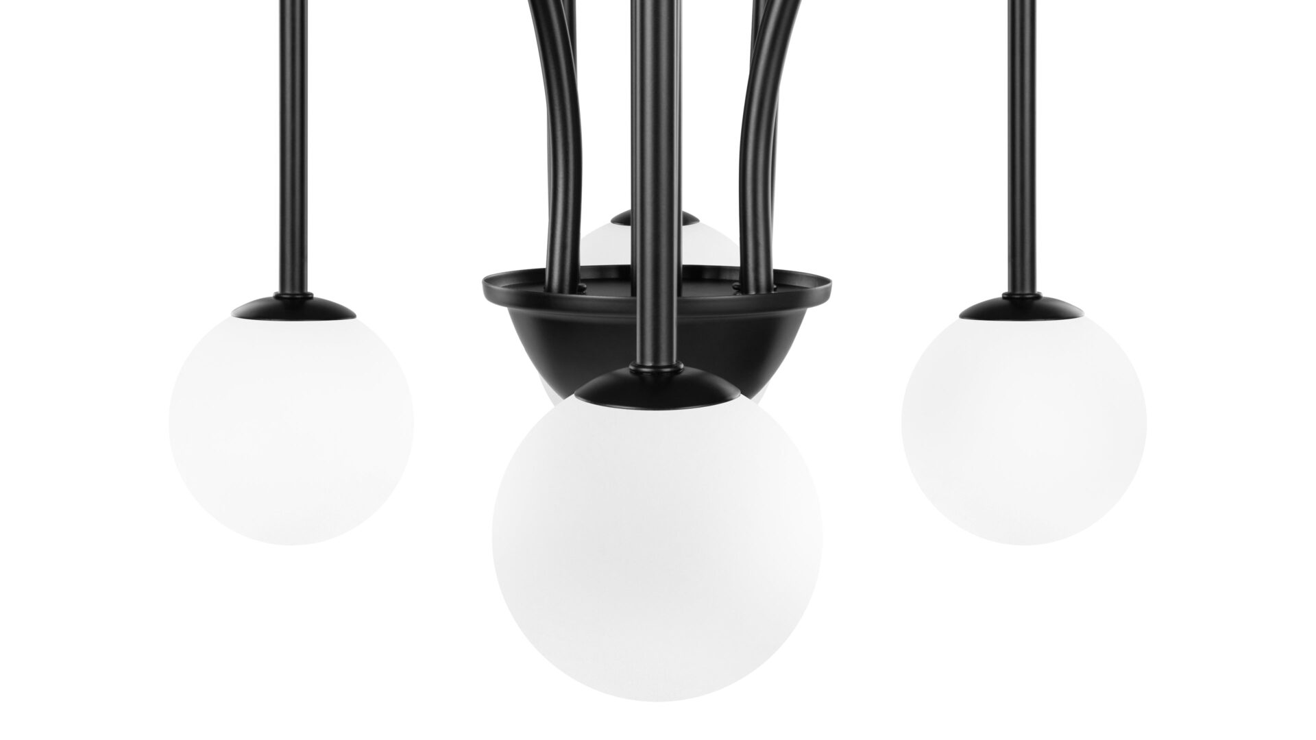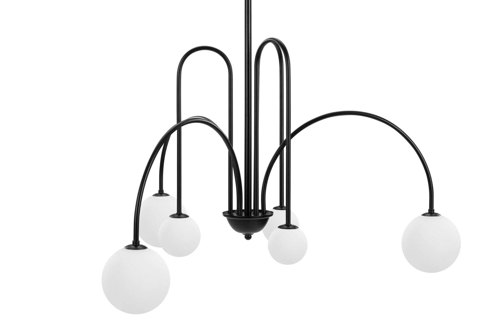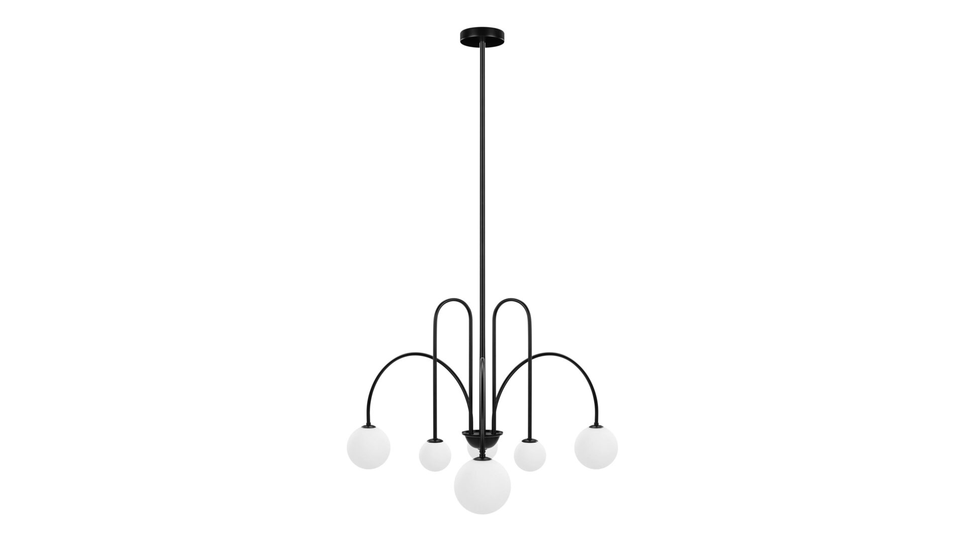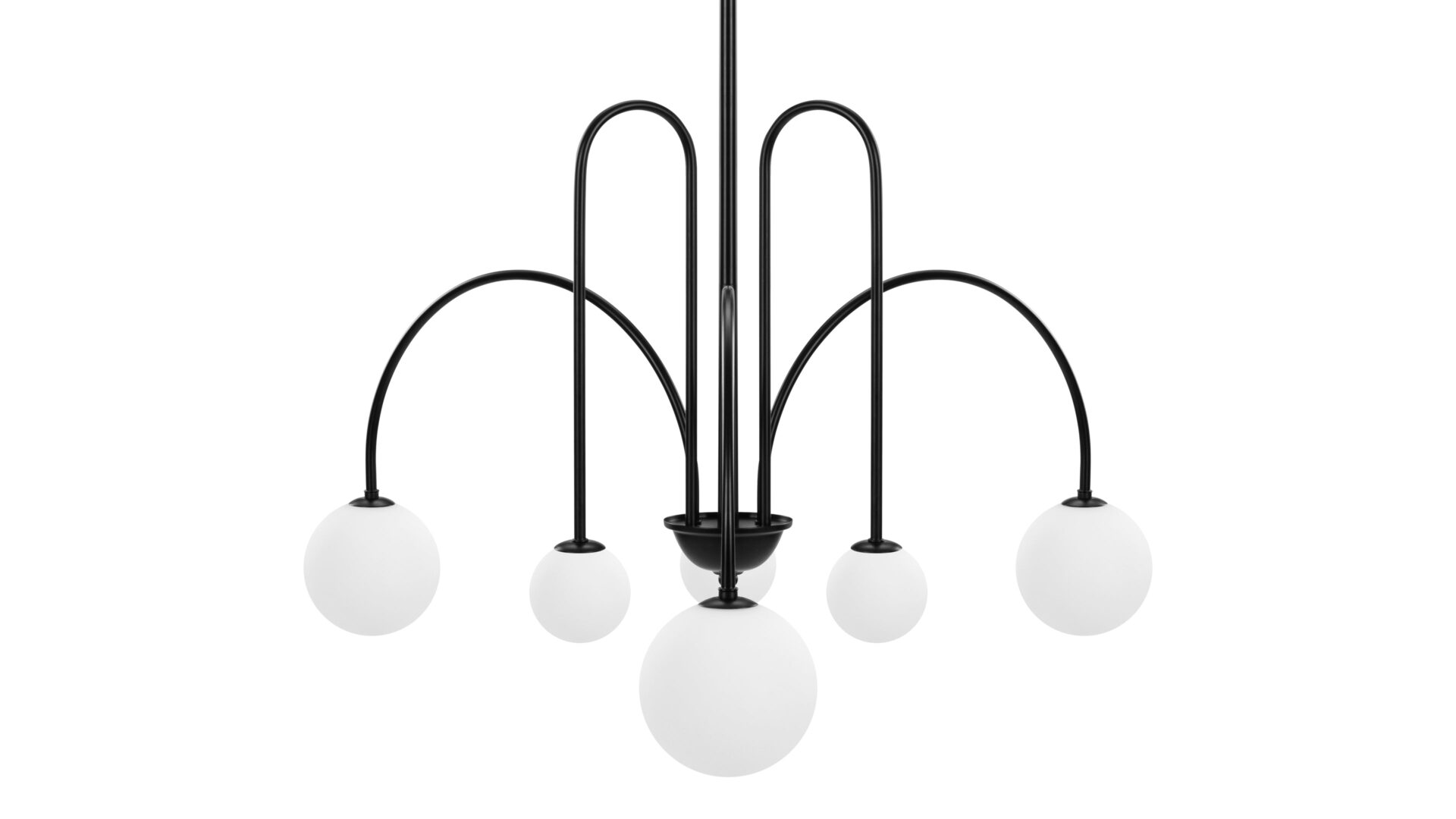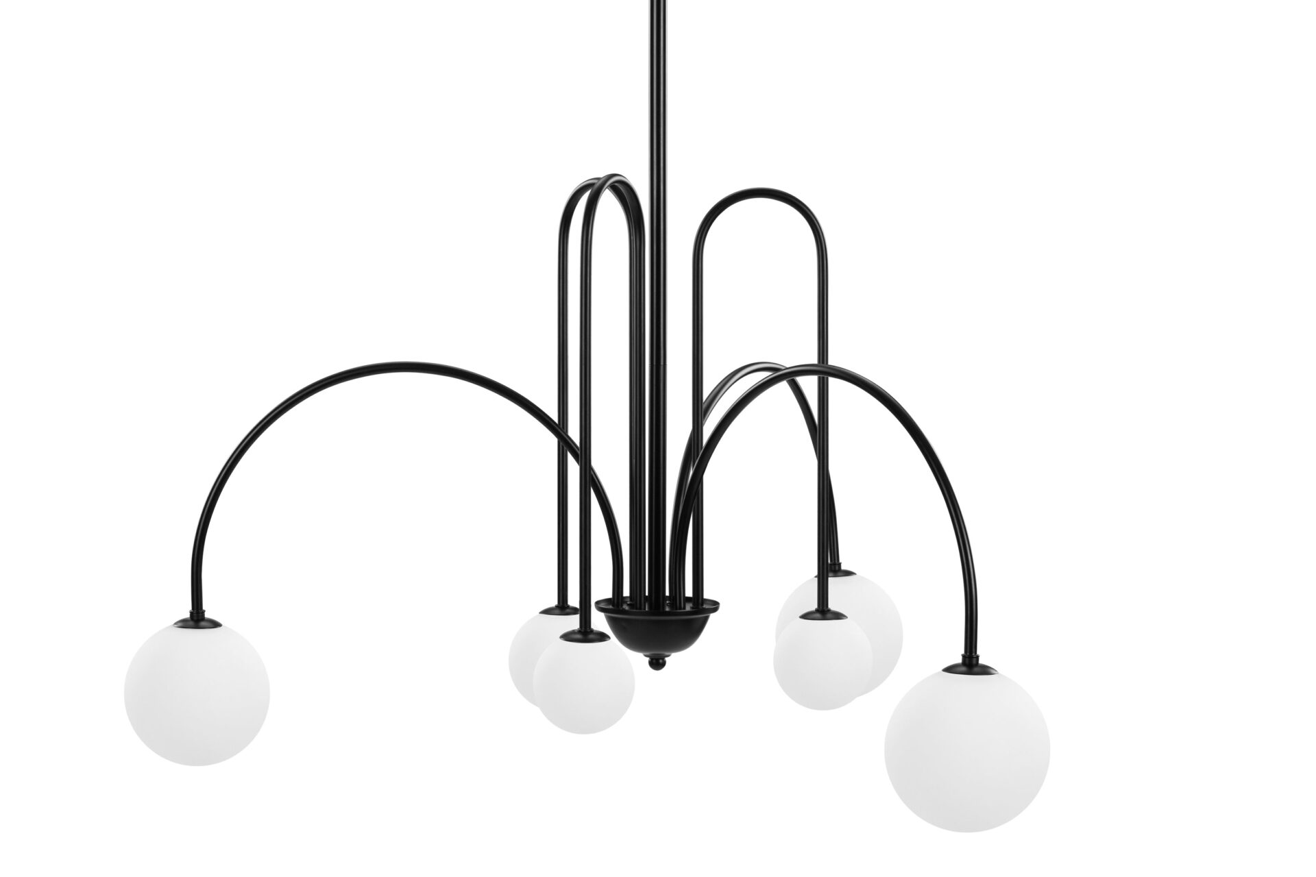 Introducing the Mars Chandelier, showcasing slender, wrought iron arms adorned in a classic matte black finish. The distinctive shapes meld tall, sharp arches with shallower arcs and wide curves, resulting in a dynamic and refined appearance. Unlike traditional chandeliers, this fixture features arms that point downwards, offering a contemporary twist on a timeless design.