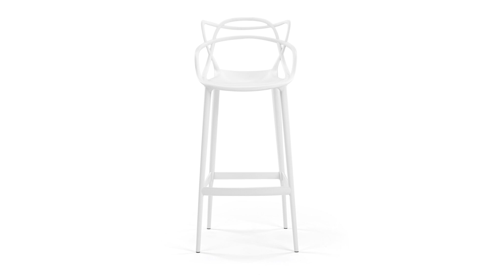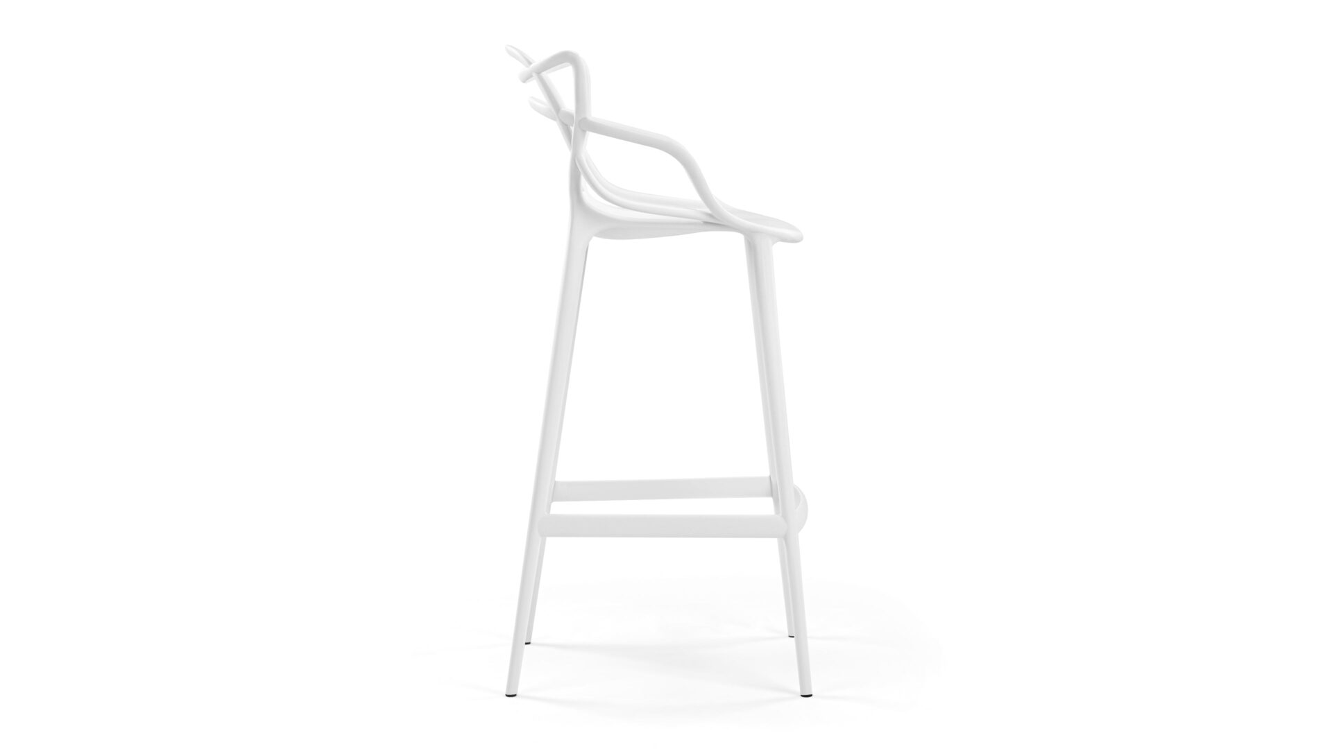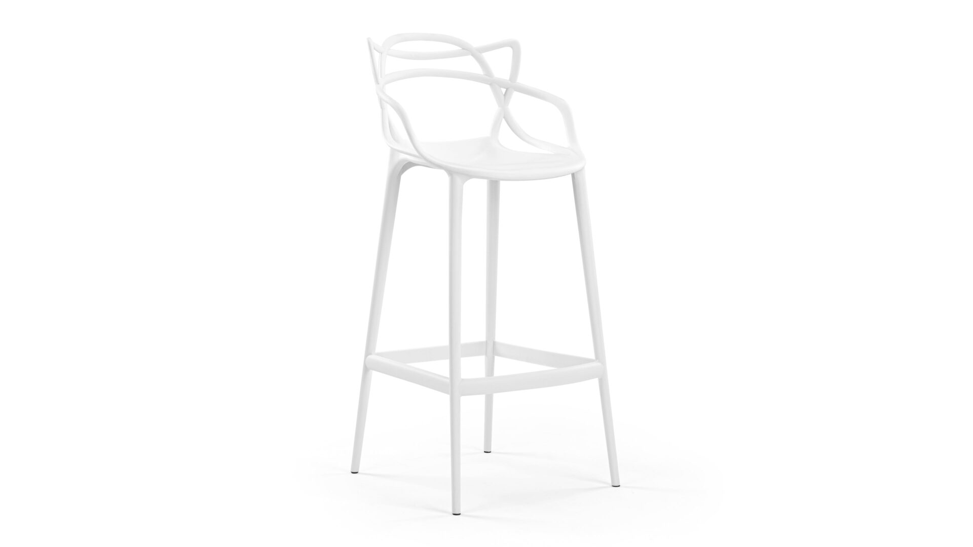 Introducing the Master's Collection, a timeless dining chair showcasing a blend of modern and iconic design. With a chic white finish, this chair is elegantly crafted with a unique contemporary backrest and tapered legs, embodying a democratic design that combines grace and practicality. The Masters Bar Stool in white offers exquisite contemporary style inspired by iconic designs from the 20th century, featuring seamless fluidity and dynamic presence, making it a versatile and weather-resistant piece perfect for indoor or outdoor settings.