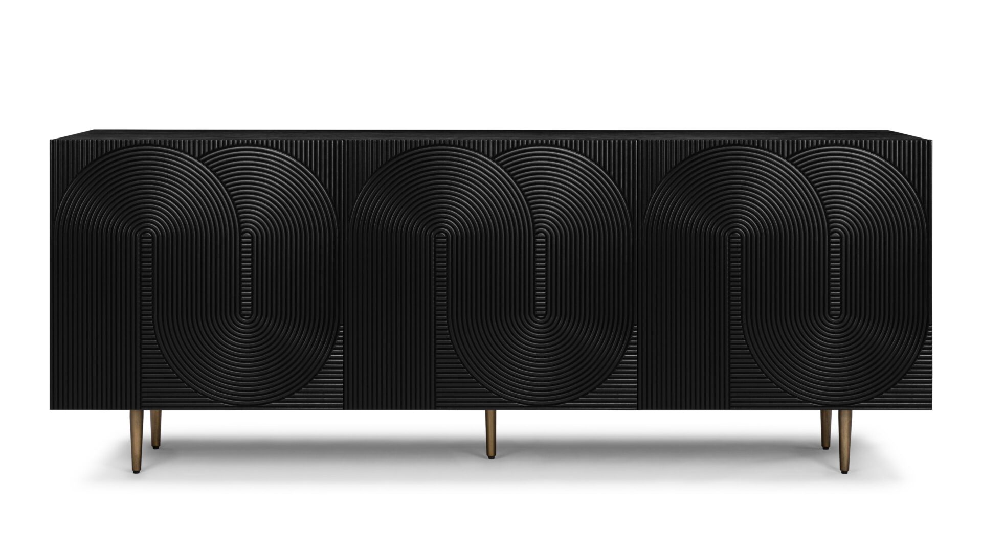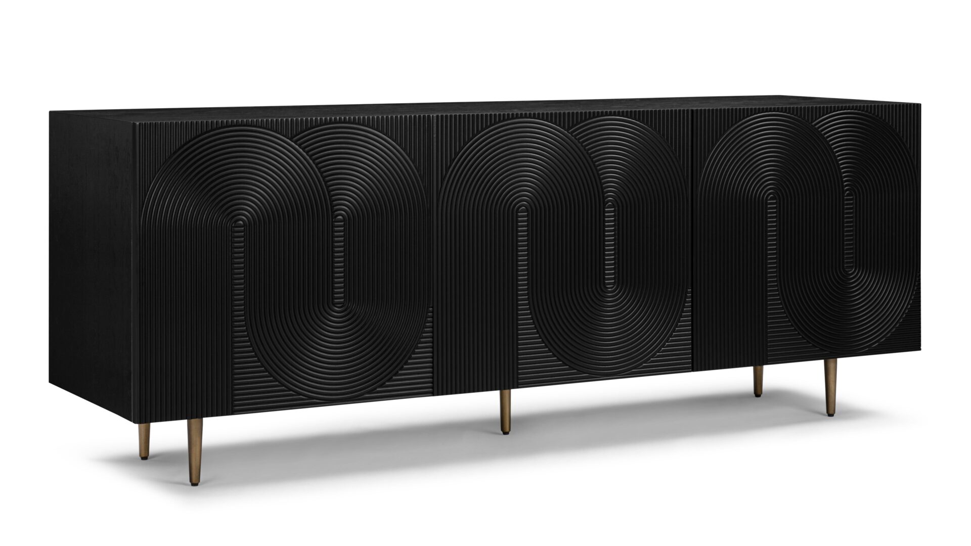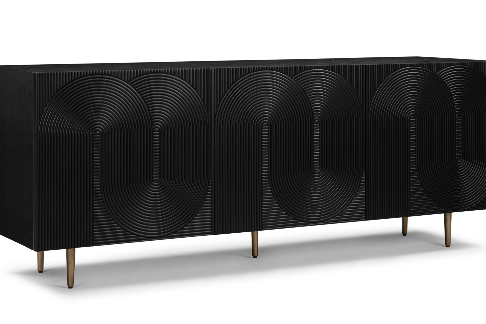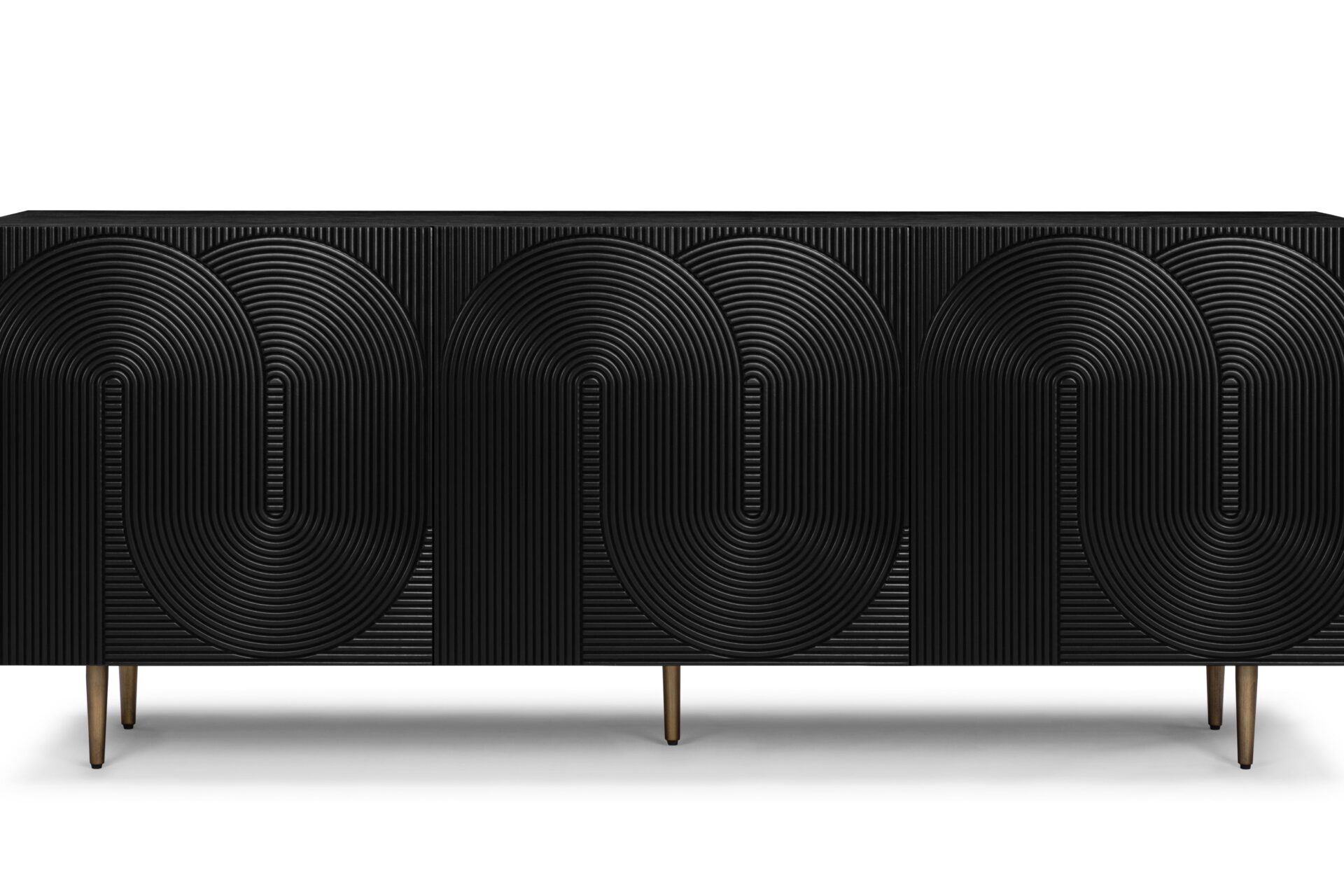 Introducing the Matisse Sideboard, showcasing a striking 1970s-inspired frontage adorned with recurring patterns that infuse it with a unique and artistic charm. Enhanced by a chic black finish and brass-colored legs, this sideboard exudes a modern elegance that elevates its status as a standout statement piece in any living space.