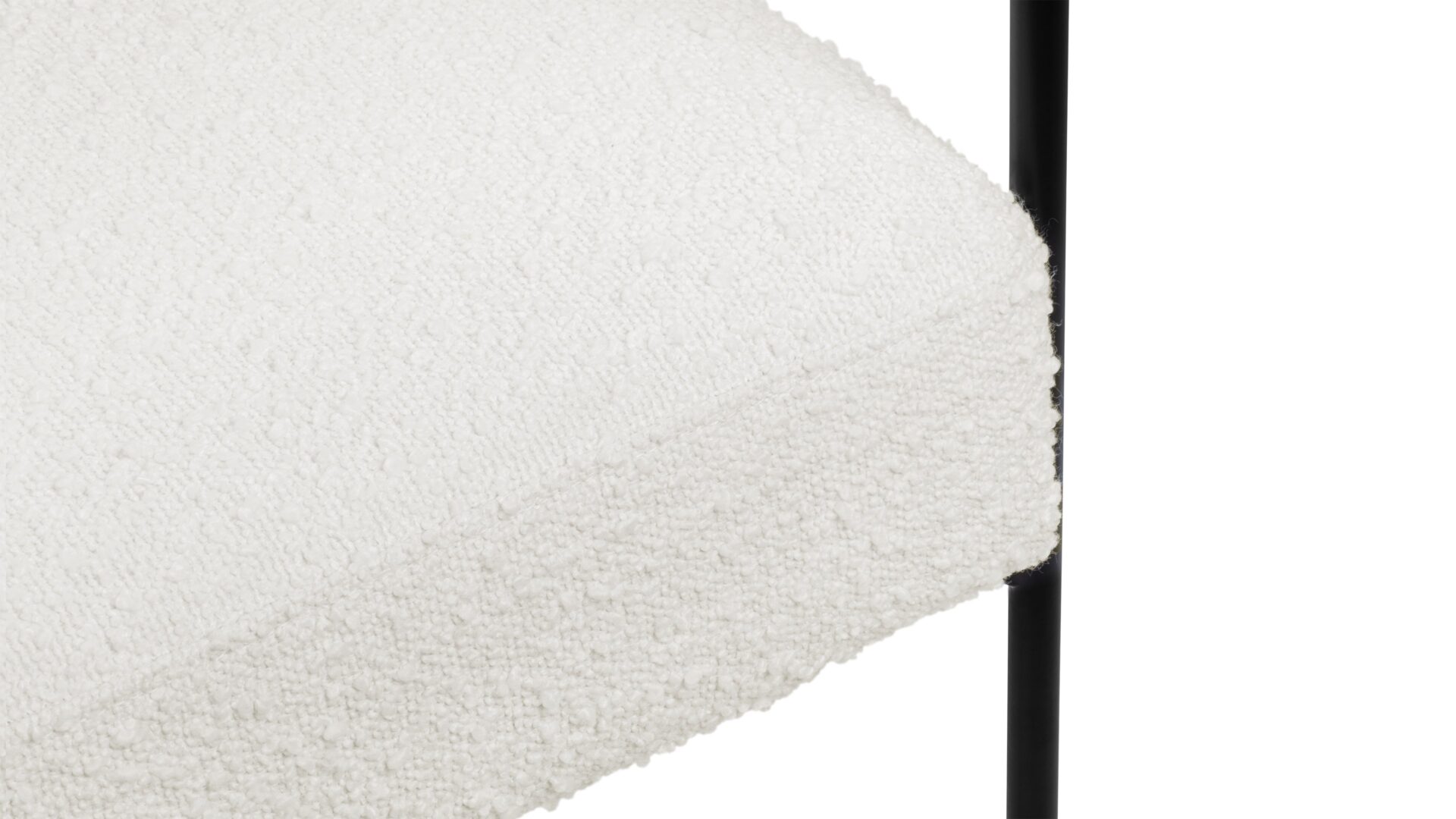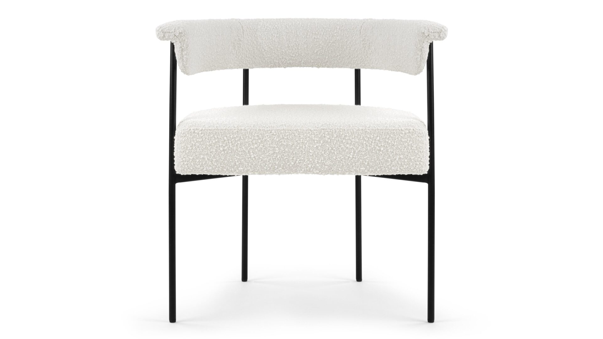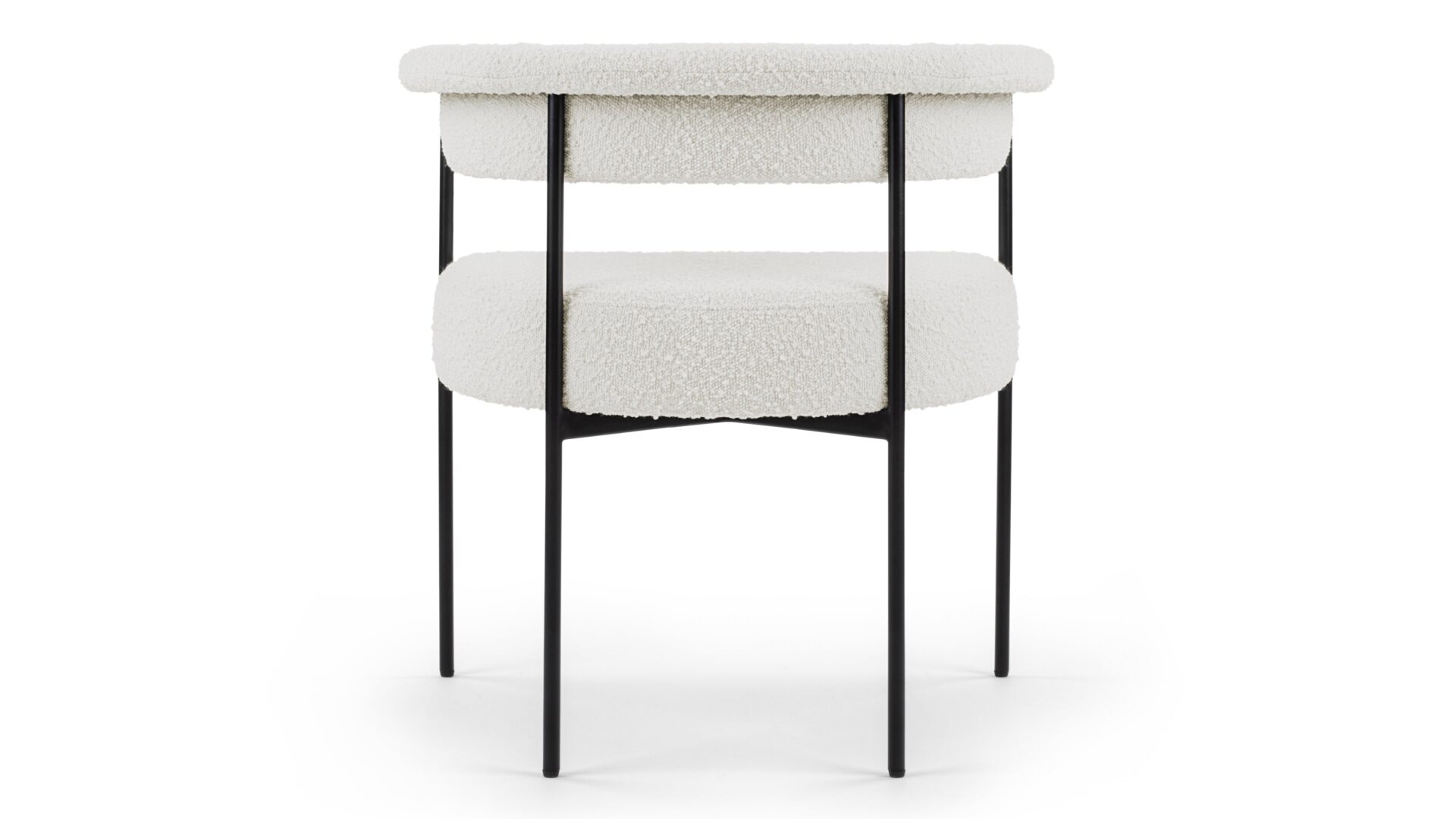 Experience the contemporary allure of the Mei Armchair, featuring a gracefully curved backrest and slim metal frame for a modern touch. Upholstered in cozy white boucle, this chair offers a plush texture that beautifully juxtaposes the matte black frame.