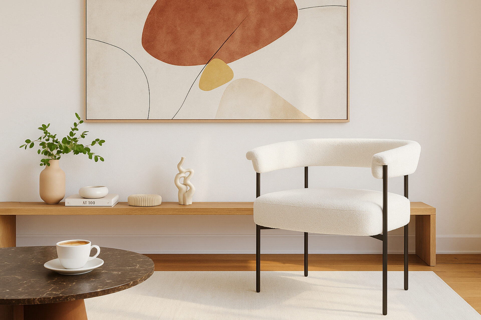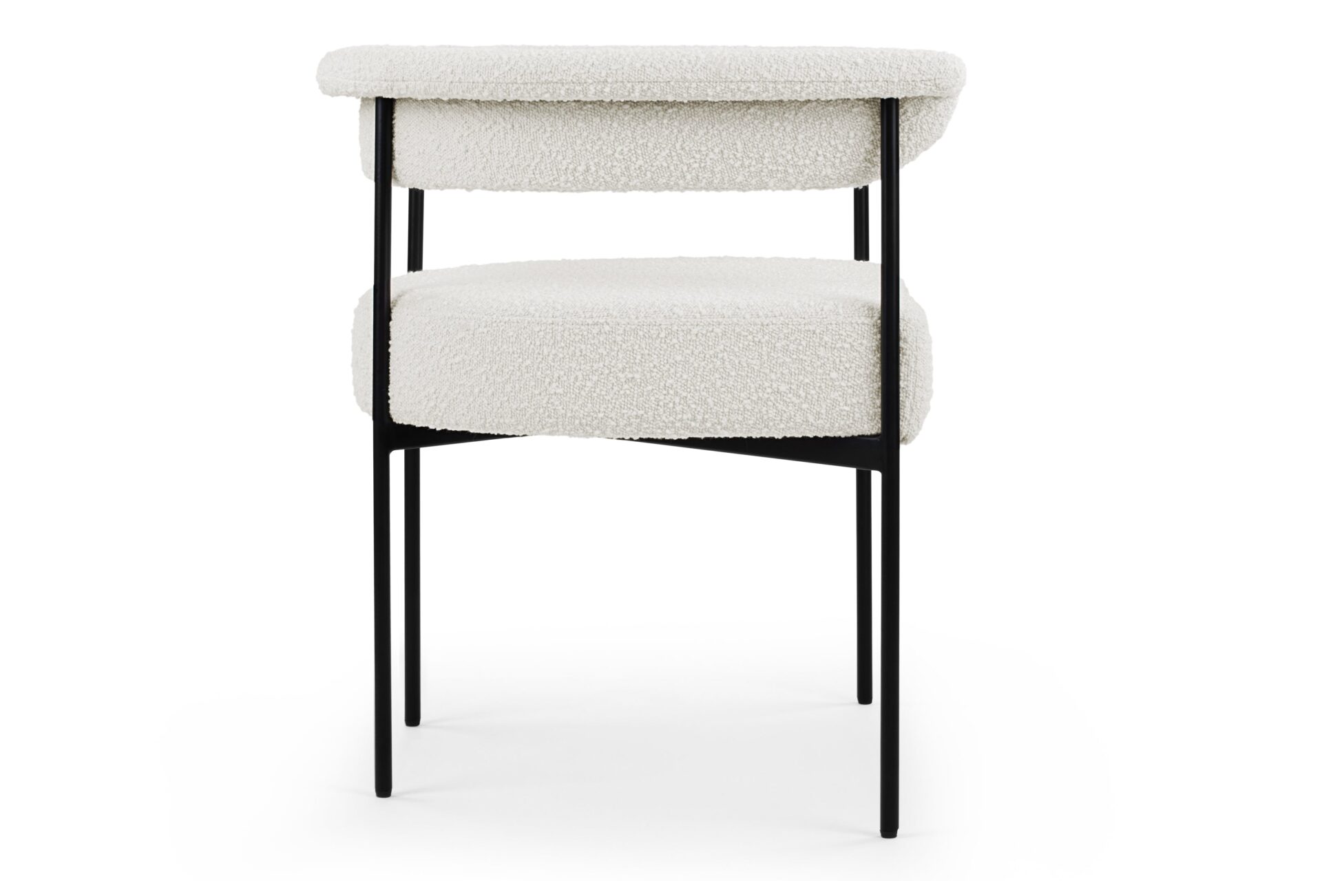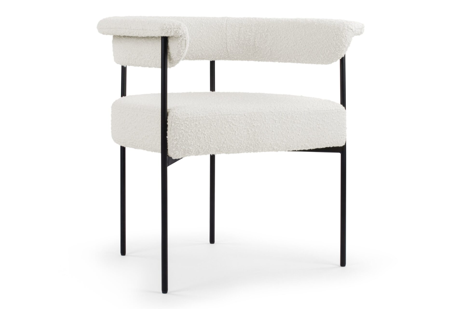Experience the contemporary allure of the Mei Armchair, featuring a gracefully curved backrest and slim metal frame for a modern touch. Upholstered in cozy white boucle, this chair offers a plush texture that beautifully juxtaposes the matte black frame.