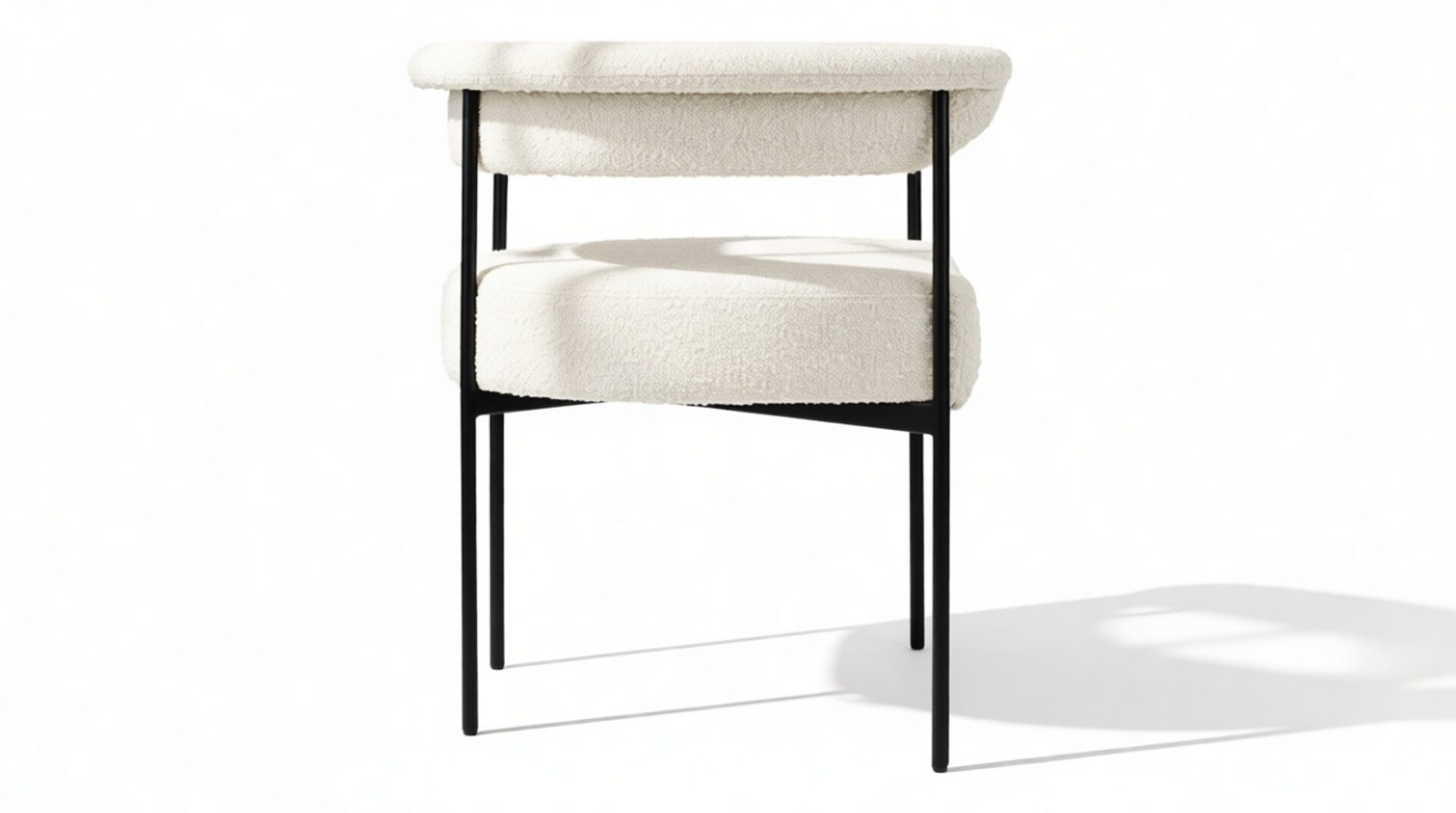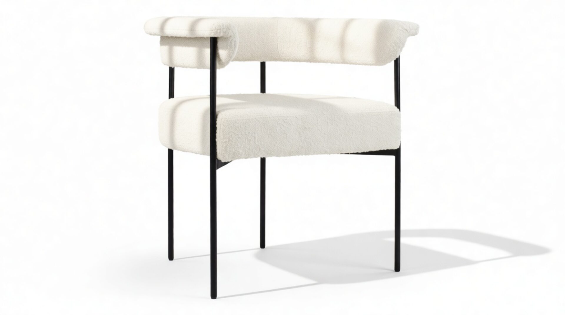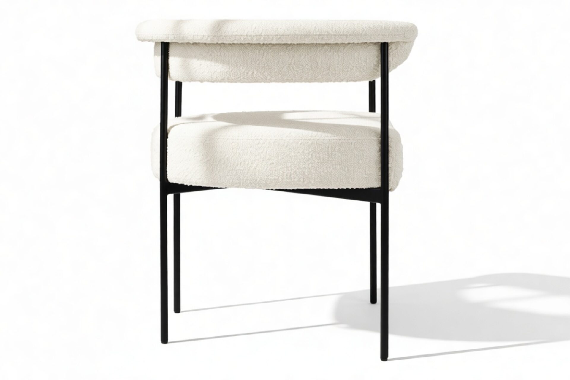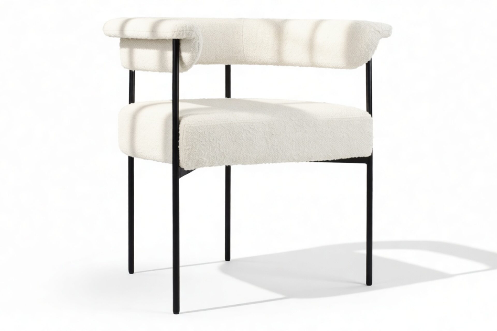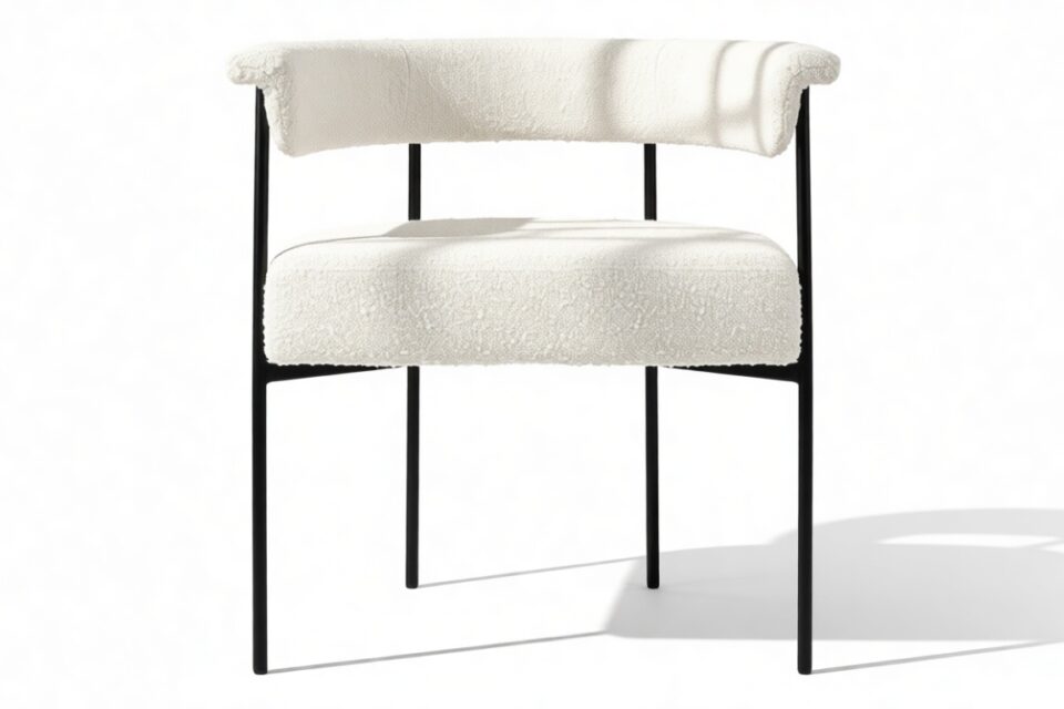 Discover the exquisitely crafted Merry Armchair, a harmonious fusion of comfort and contemporary sophistication, perfect for today’s modern interiors. Draped in a luxurious warm white boucle upholstery, this chair envelops you in a plush, tactile experience thanks to the fabric’s inviting looped texture. A delicate metal frame in a matte black finish provides a striking contrast against the pale fabric, elevating the chair’s aesthetic appeal.