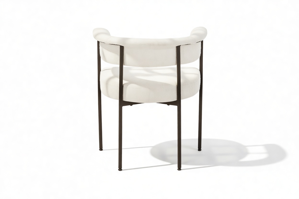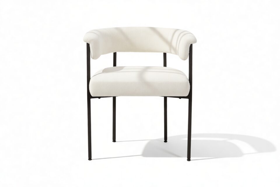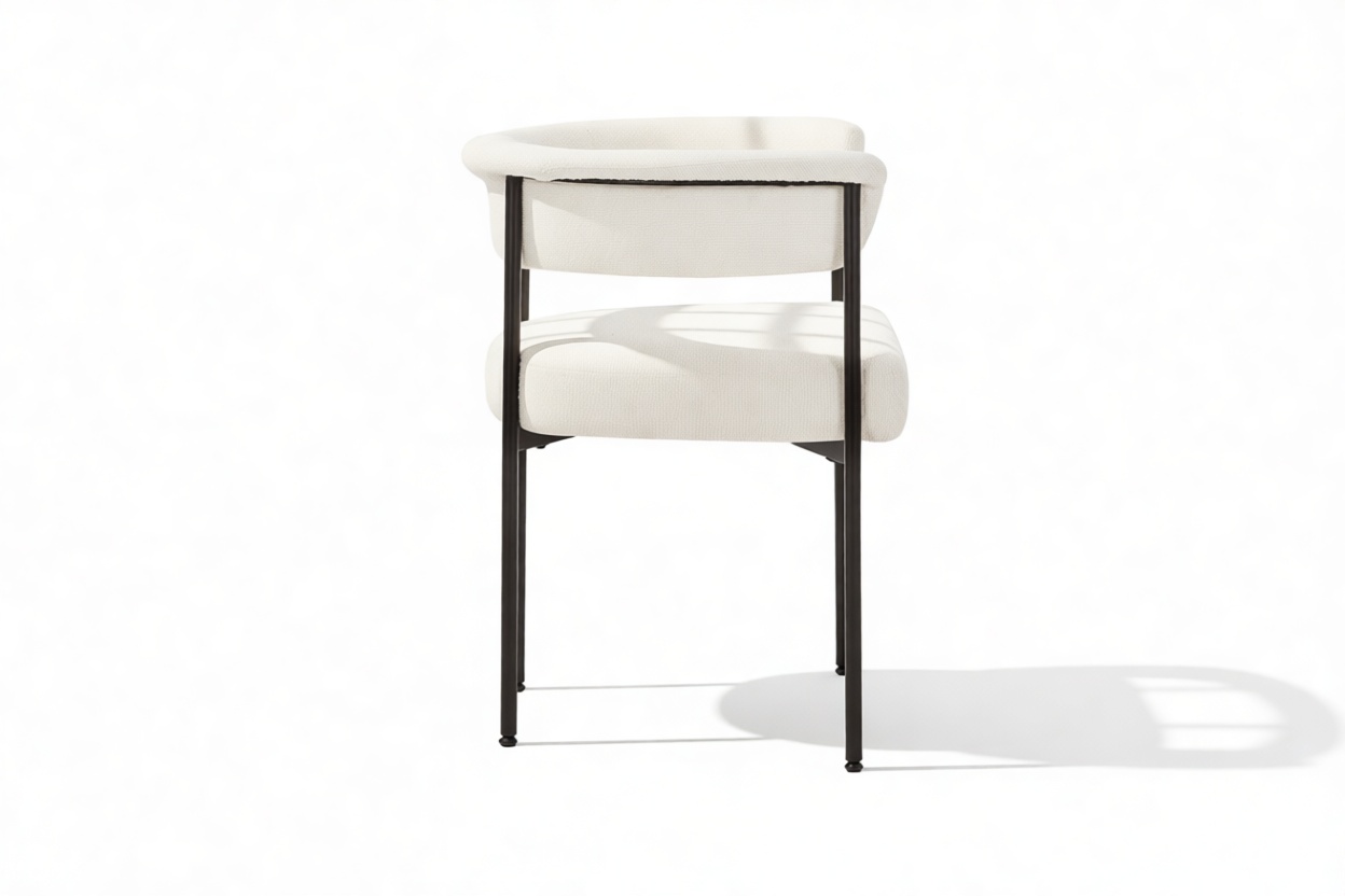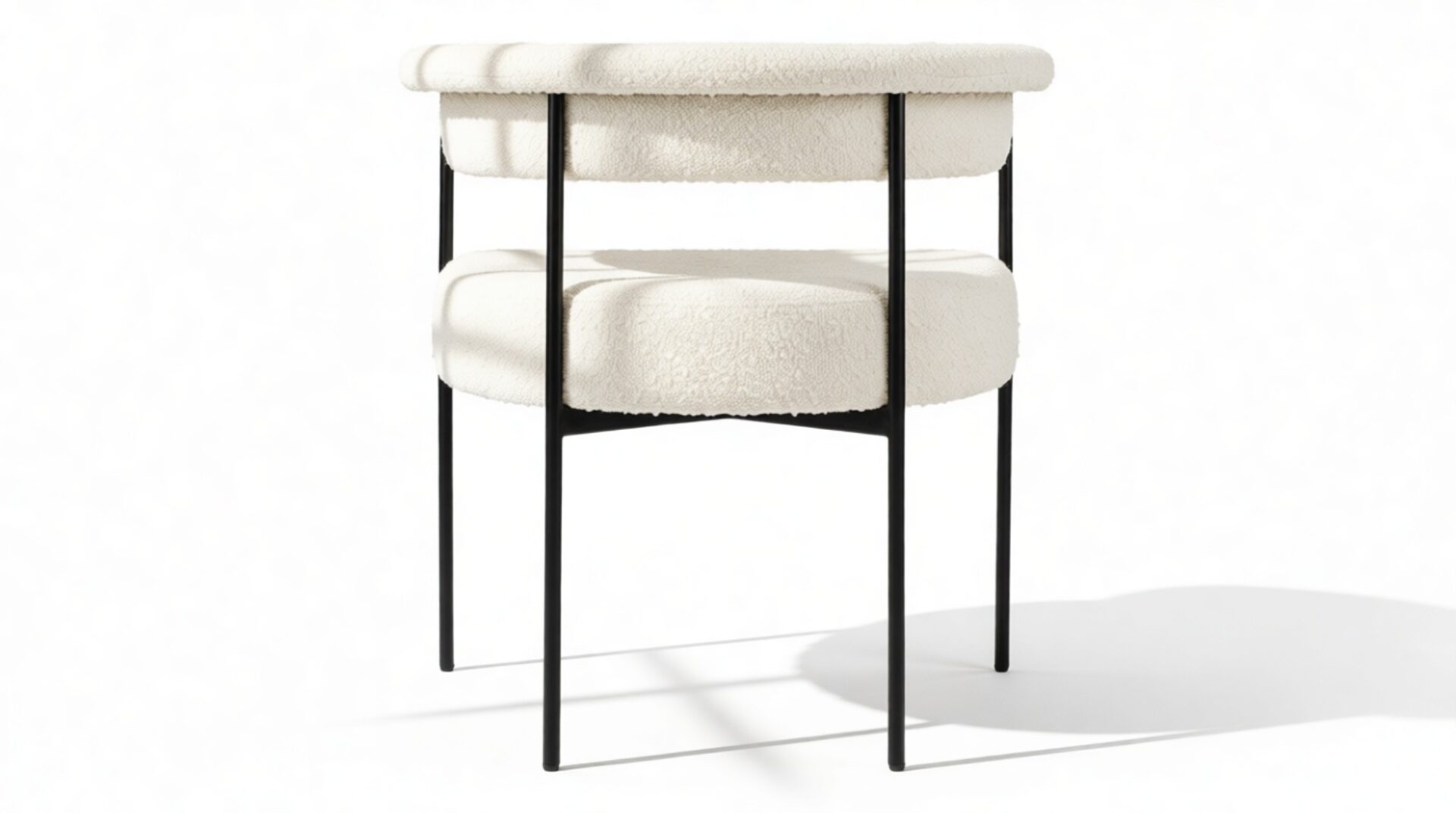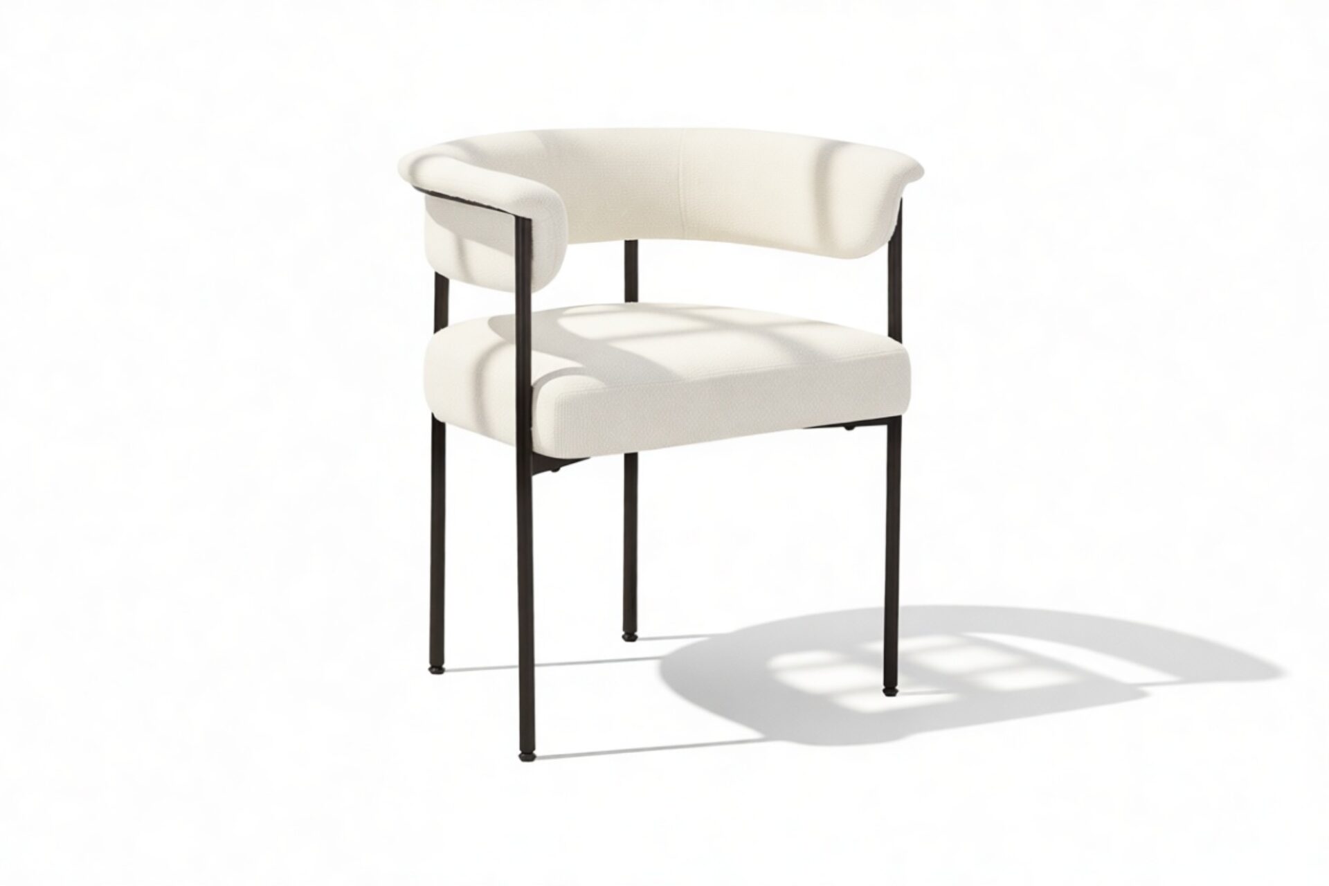 Discover the exquisitely crafted Merry Armchair, a harmonious fusion of comfort and contemporary sophistication, perfect for today’s modern interiors. Draped in a luxurious warm white boucle upholstery, this chair envelops you in a plush, tactile experience thanks to the fabric’s inviting looped texture. A delicate metal frame in a matte black finish provides a striking contrast against the pale fabric, elevating the chair’s aesthetic appeal.