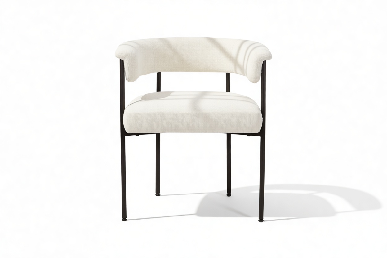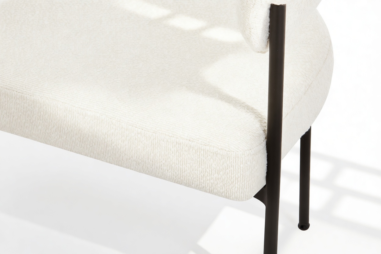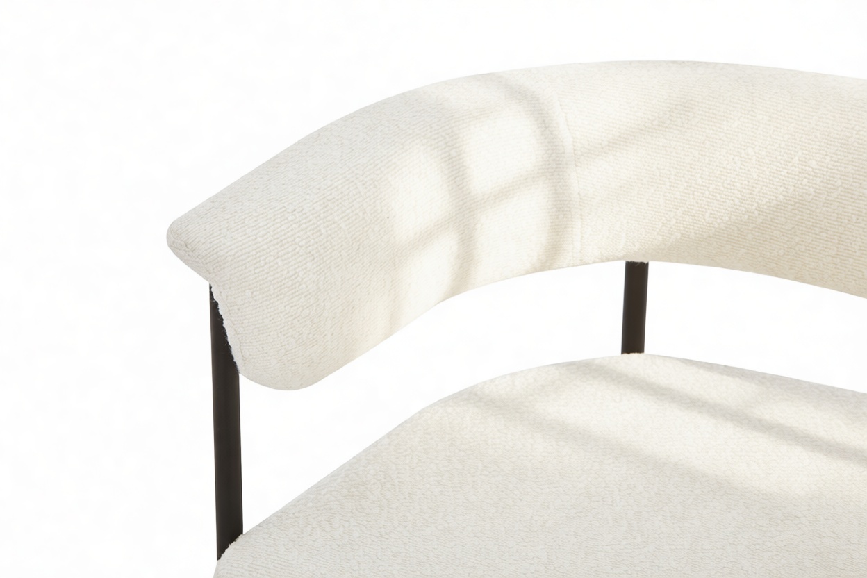 Experience the contemporary allure of the Merry Armchair, featuring a gracefully curved backrest and slim metal frame for a modern touch. Upholstered in cozy white boucle, this chair offers a plush texture that beautifully juxtaposes the matte black frame.