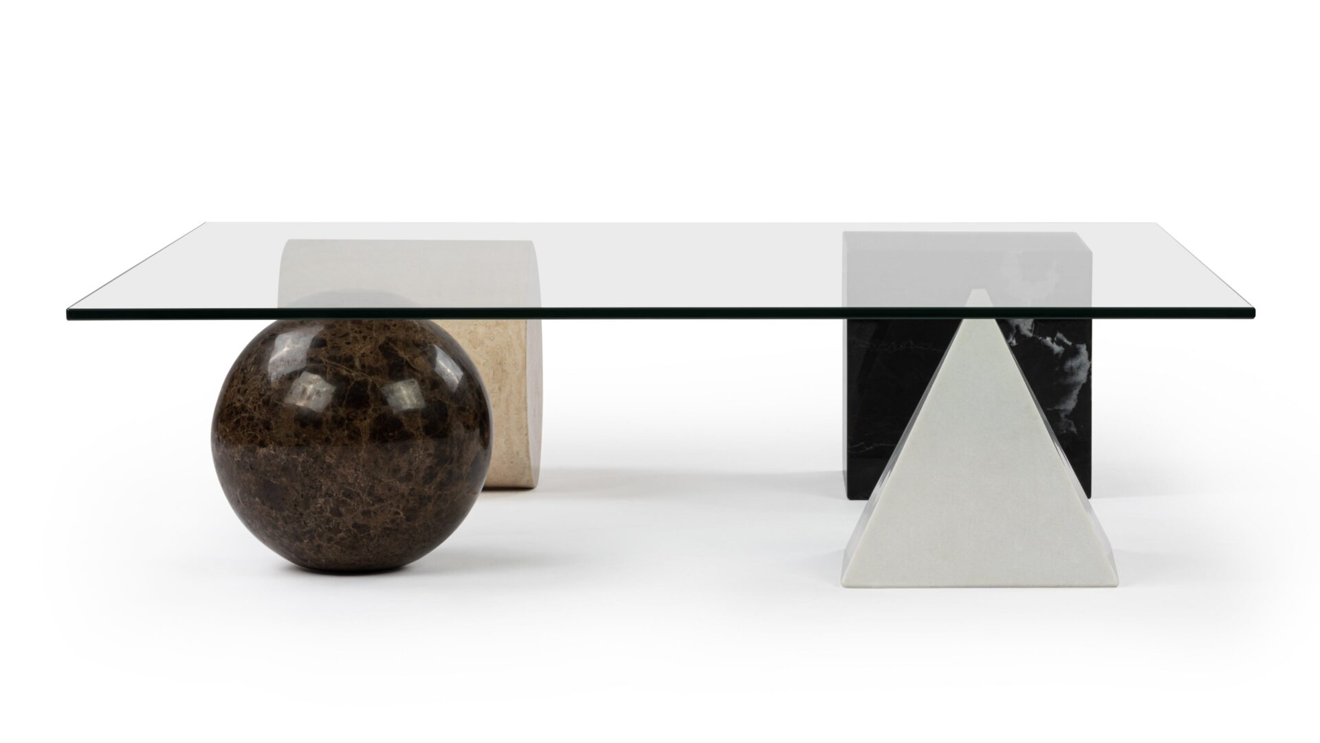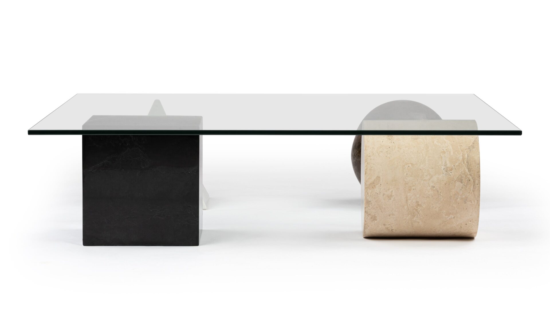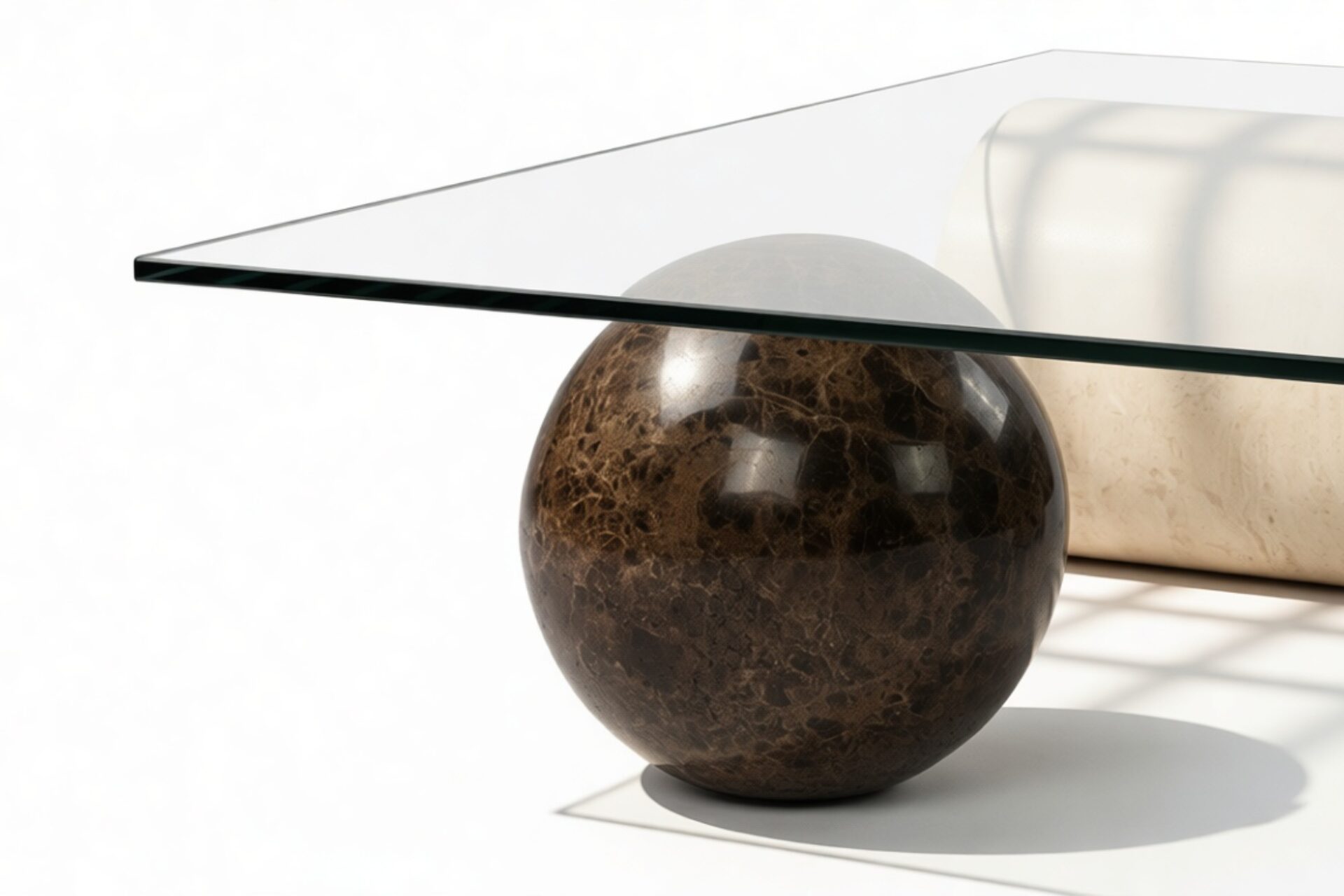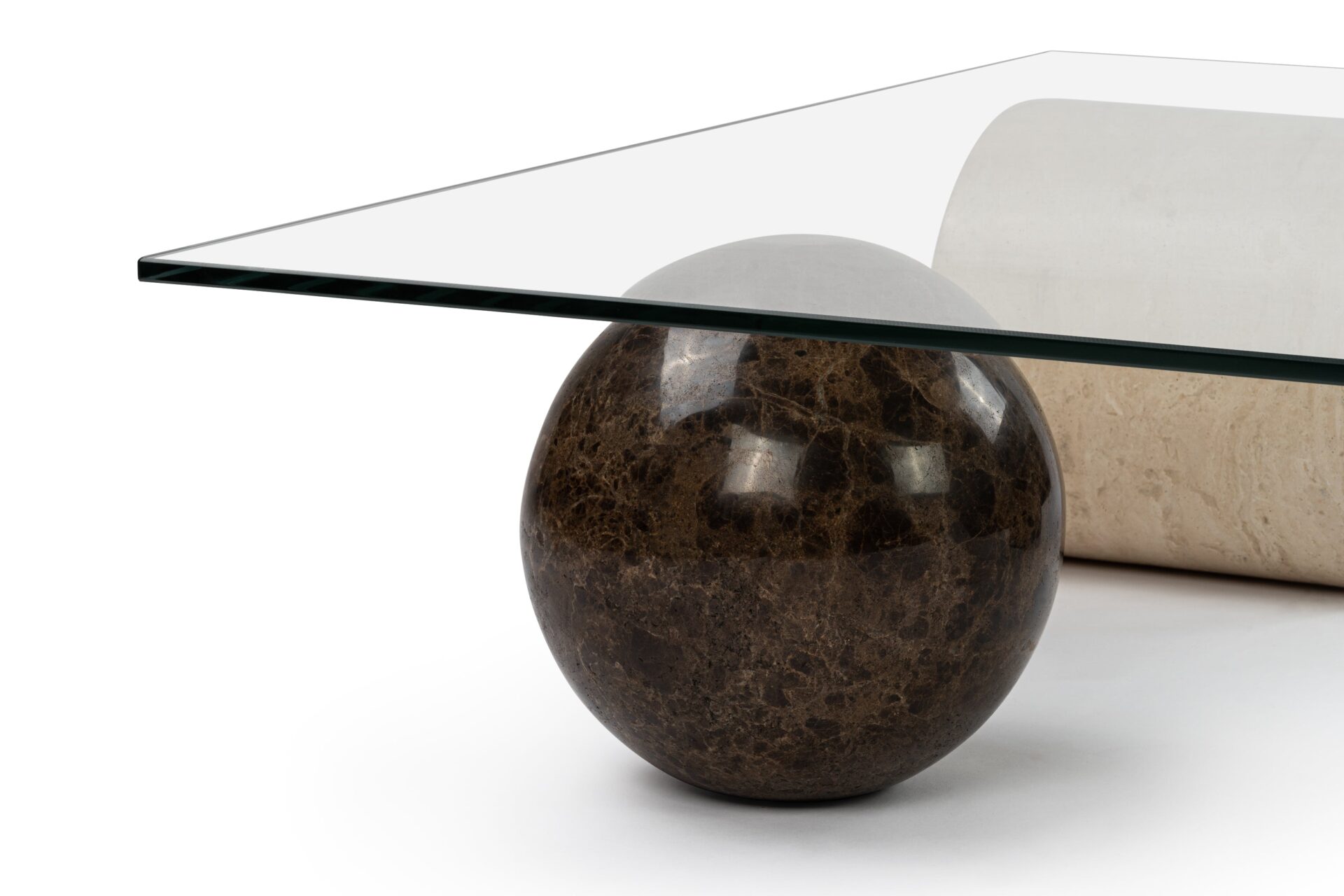 Experience the Metafora Coffee Table, a masterpiece crafted to inspire dialogue and fuel creativity. With its unique design, this table radiates energy and motion. Meticulously assembled using a blend of glass, marble, and travertine, it seamlessly blends strength with transparency.