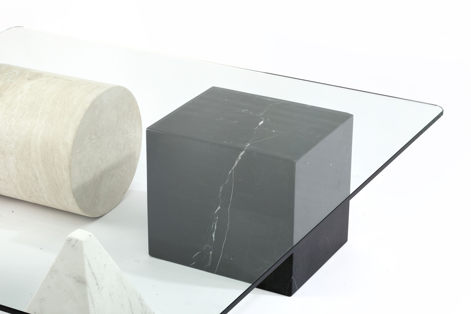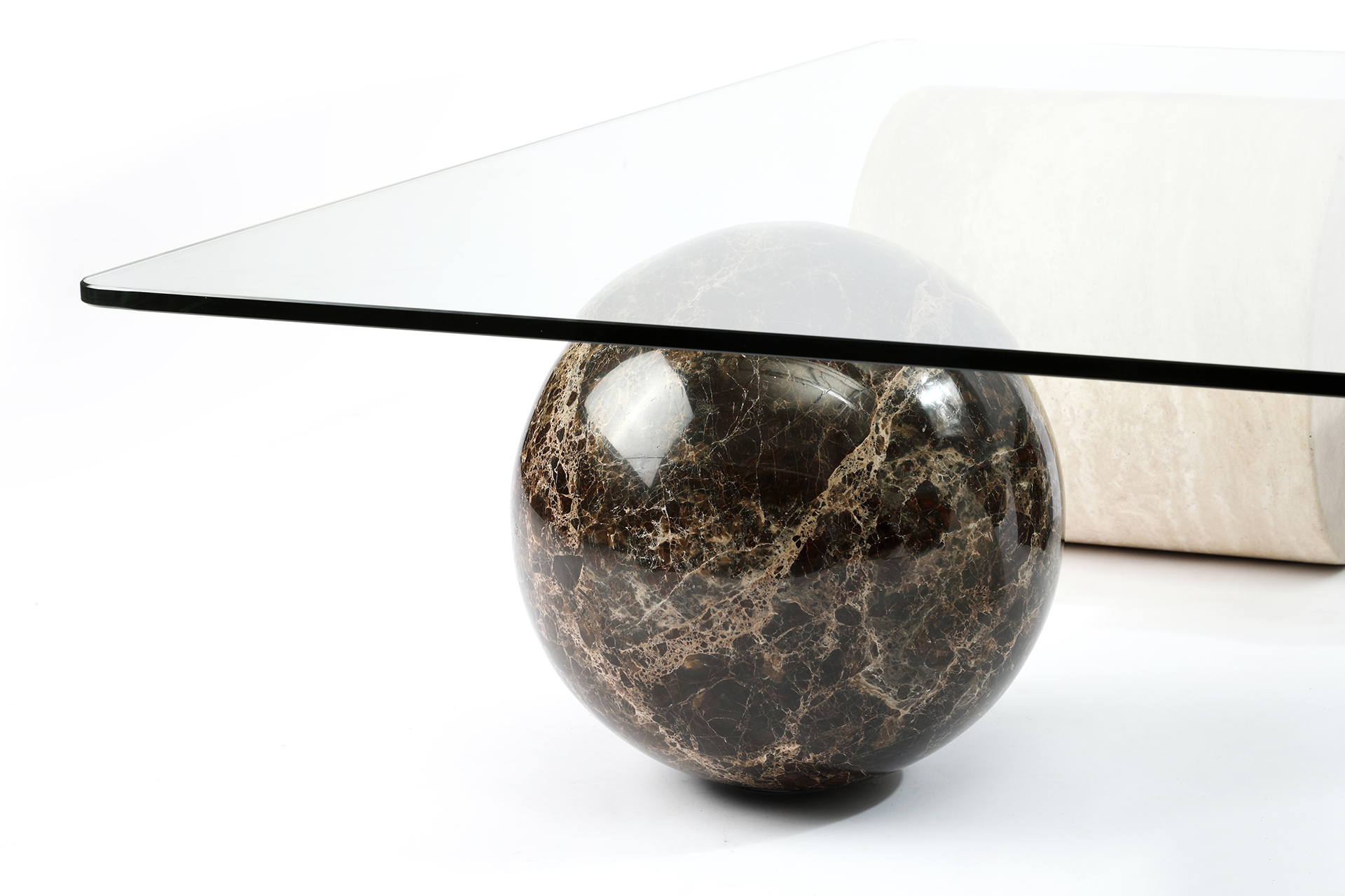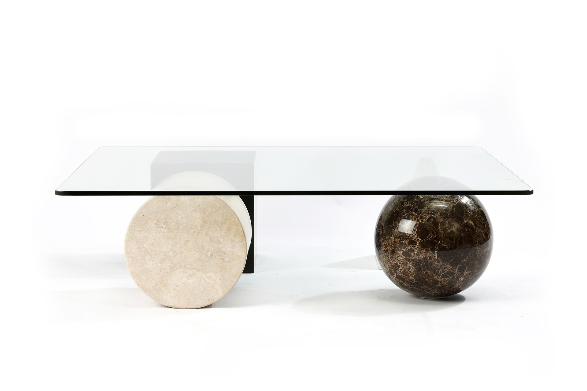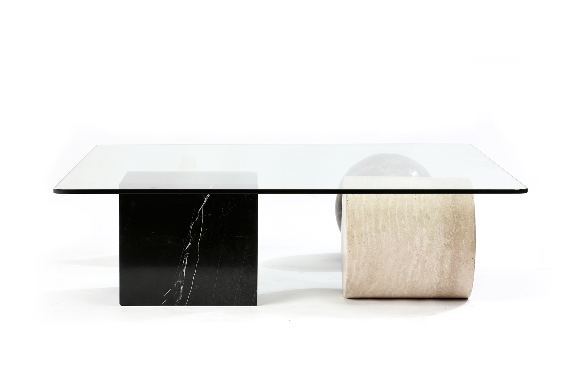 Experience the Metafora Coffee Table, a masterpiece crafted to inspire dialogue and fuel creativity. With its unique design, this table radiates energy and motion. Meticulously assembled using a blend of glass, marble, and travertine, it seamlessly blends strength with transparency.