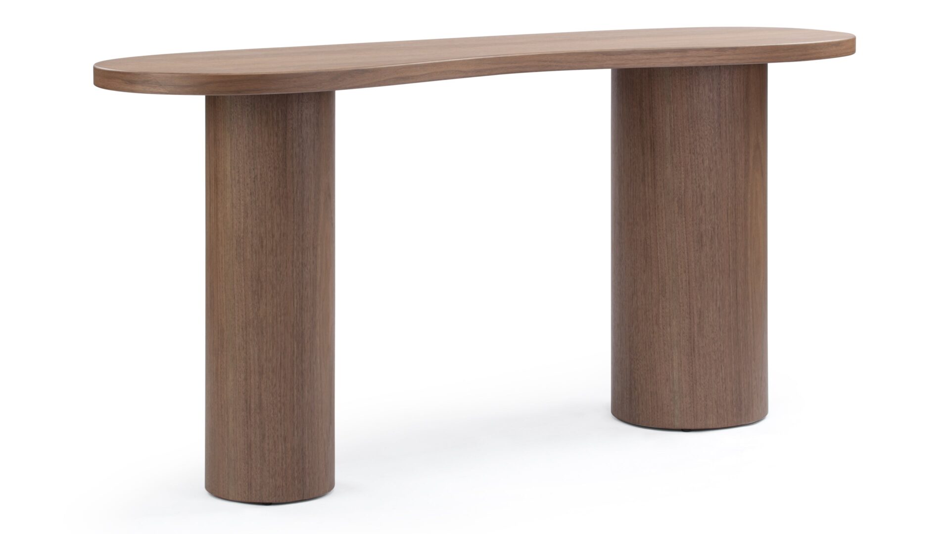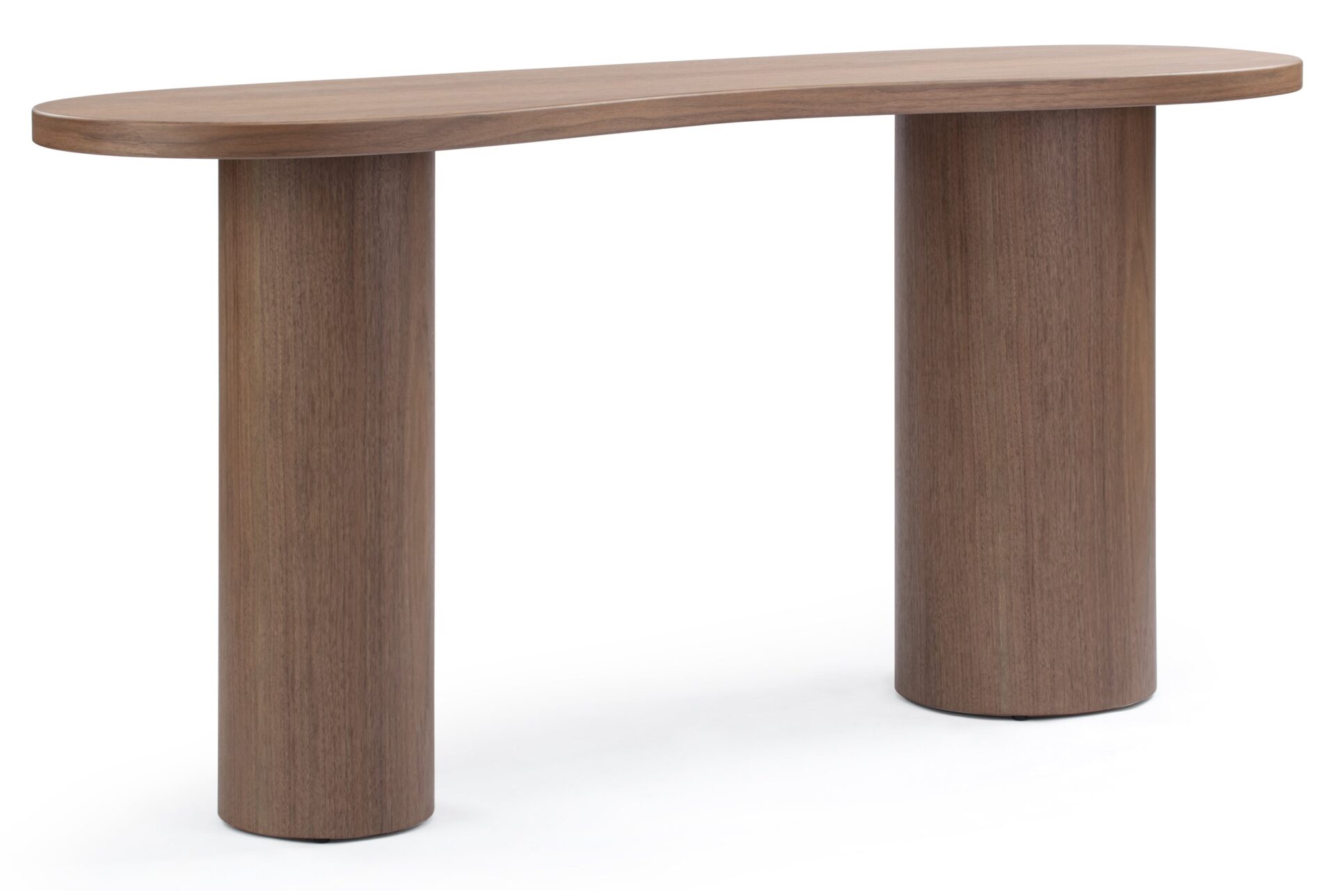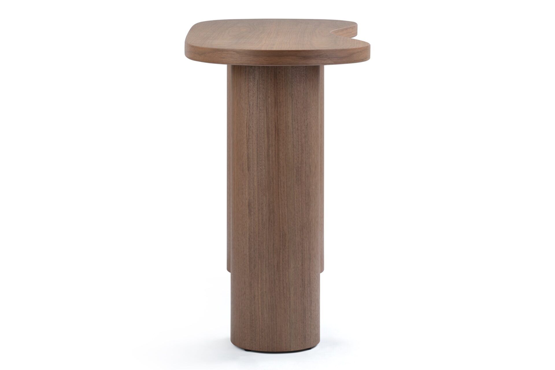 Elevate your space with the Mezzo Console Table - a contemporary masterpiece marrying organic shapes with minimalist design. Crafted from luxurious walnut veneer, its unique kidney-shaped top and striking cylindrical legs combine artistic allure with practical durability. Versatile in style, it seamlessly enhances modern, mid-century, and organic decors, making it a sophisticated and flexible centerpiece for any setting.