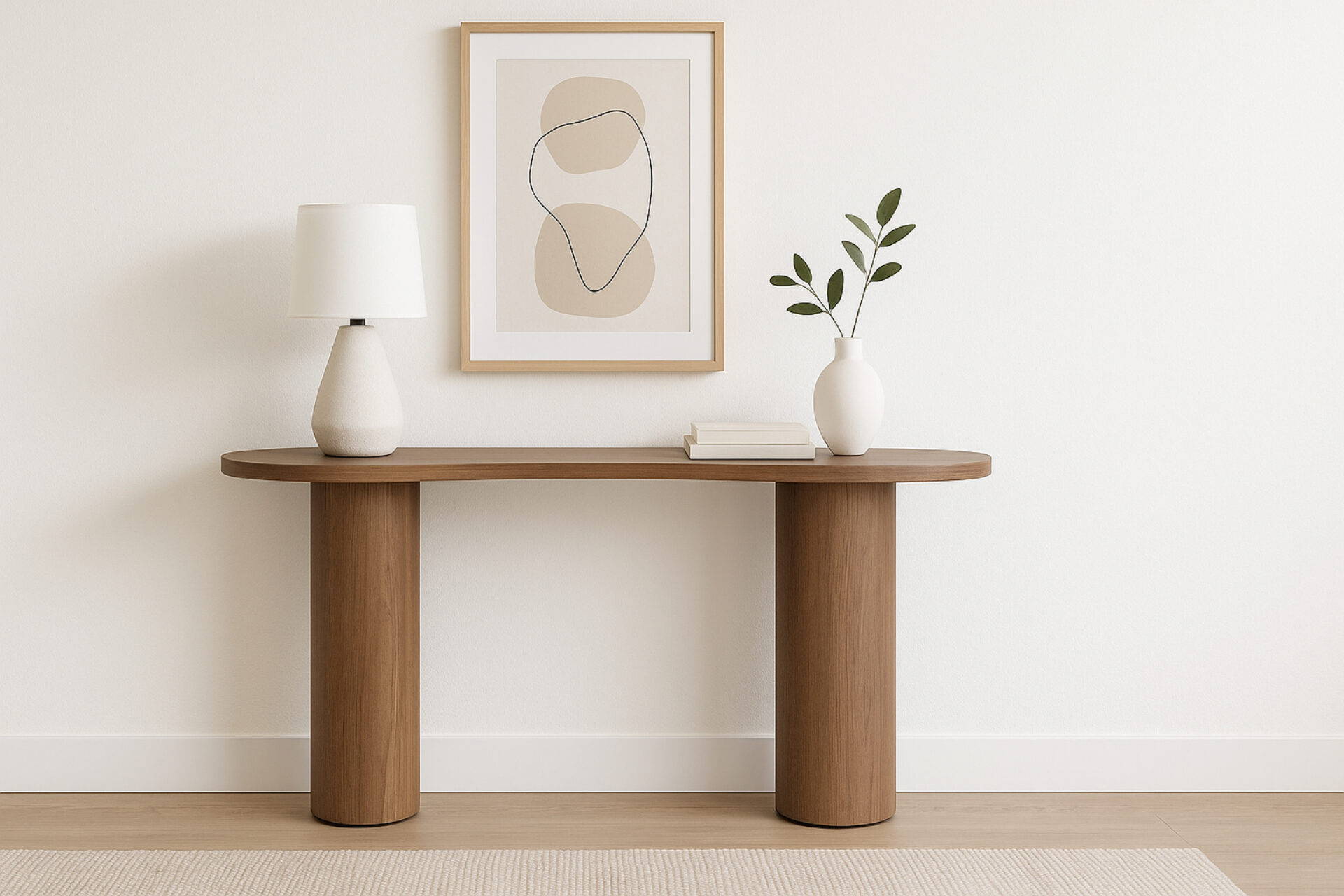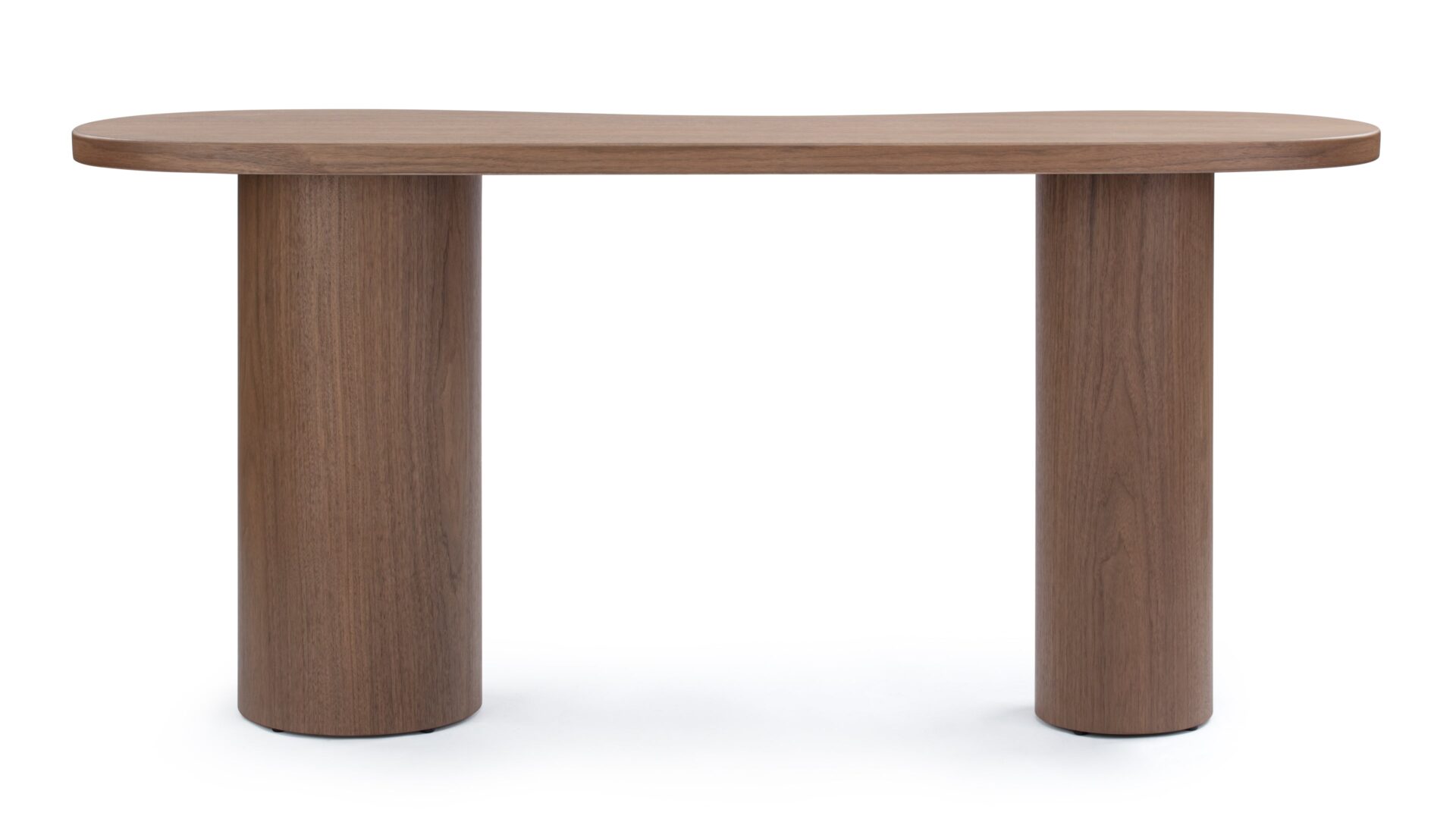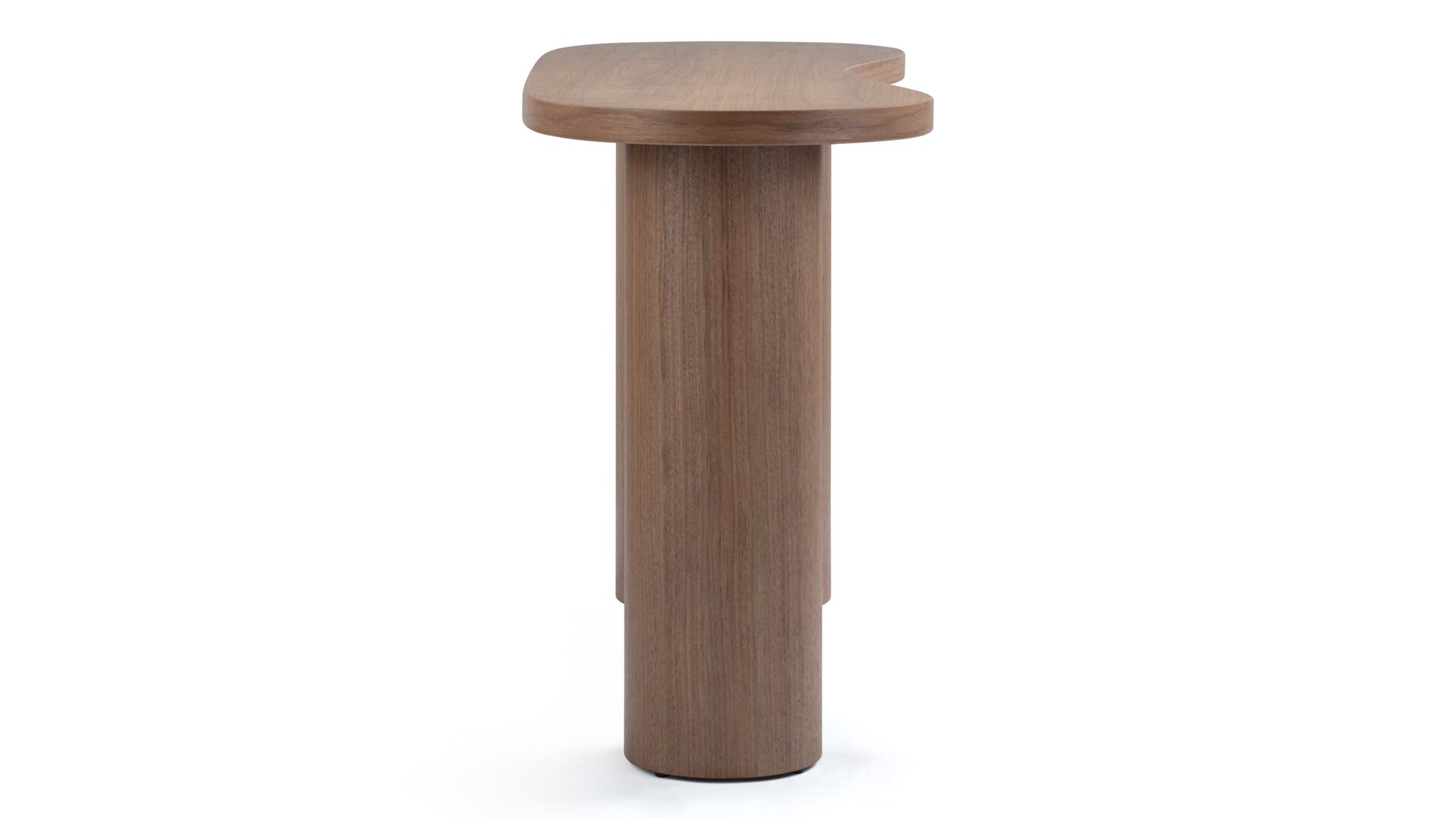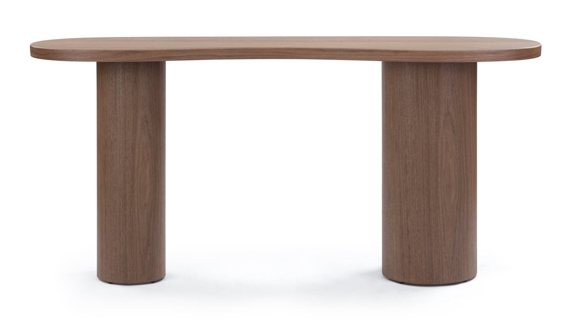 Elevate your space with the Mezzo Console Table - a contemporary masterpiece marrying organic shapes with minimalist design. Crafted from luxurious walnut veneer, its unique kidney-shaped top and striking cylindrical legs combine artistic allure with practical durability. Versatile in style, it seamlessly enhances modern, mid-century, and organic decors, making it a sophisticated and flexible centerpiece for any setting.