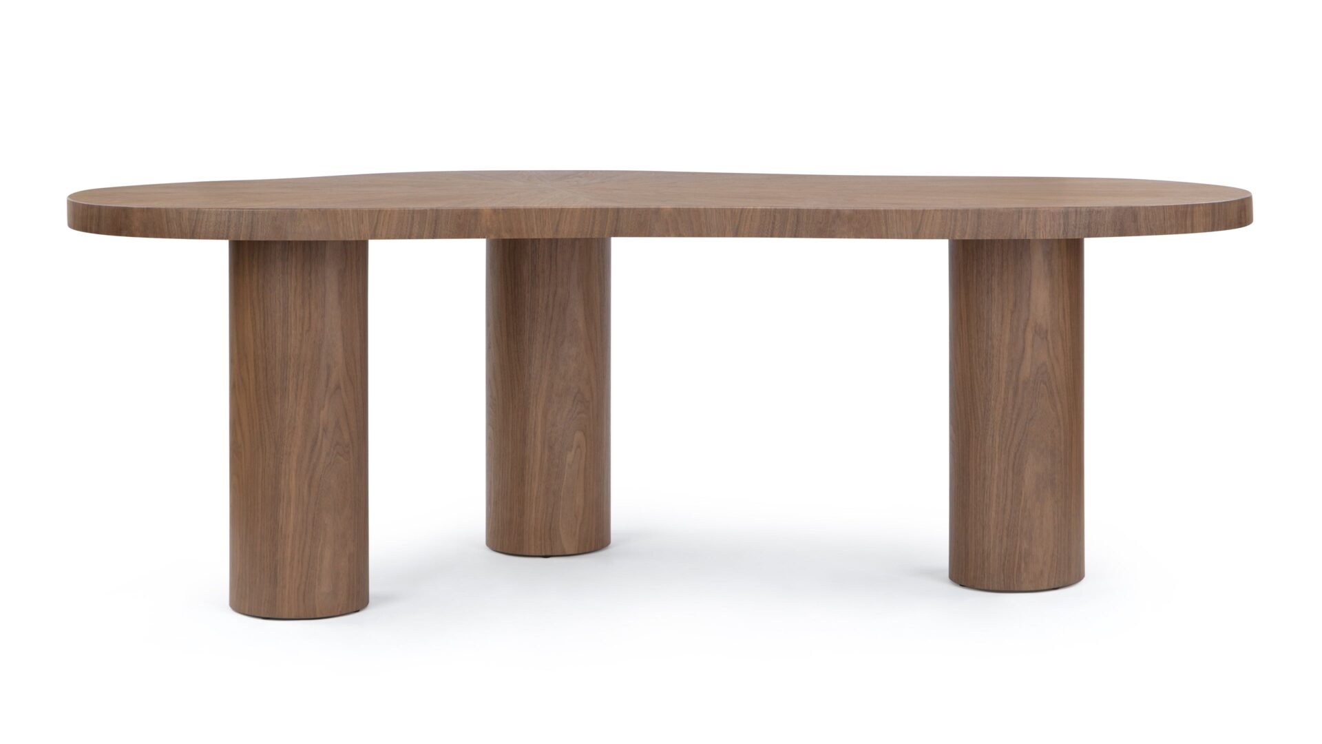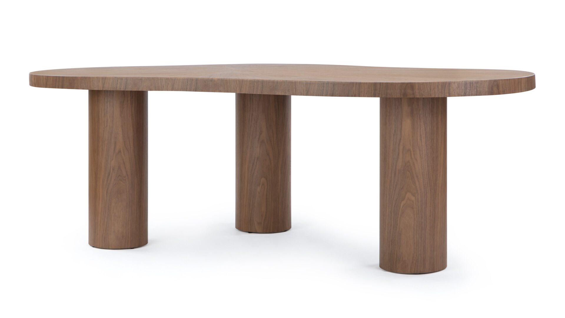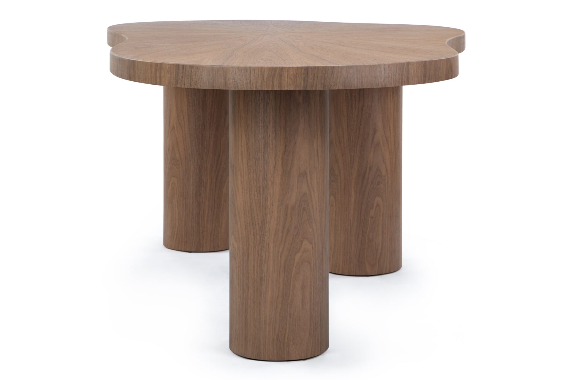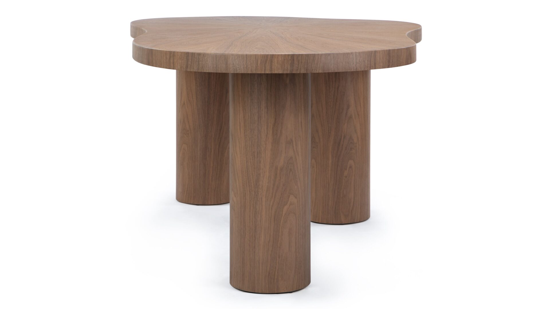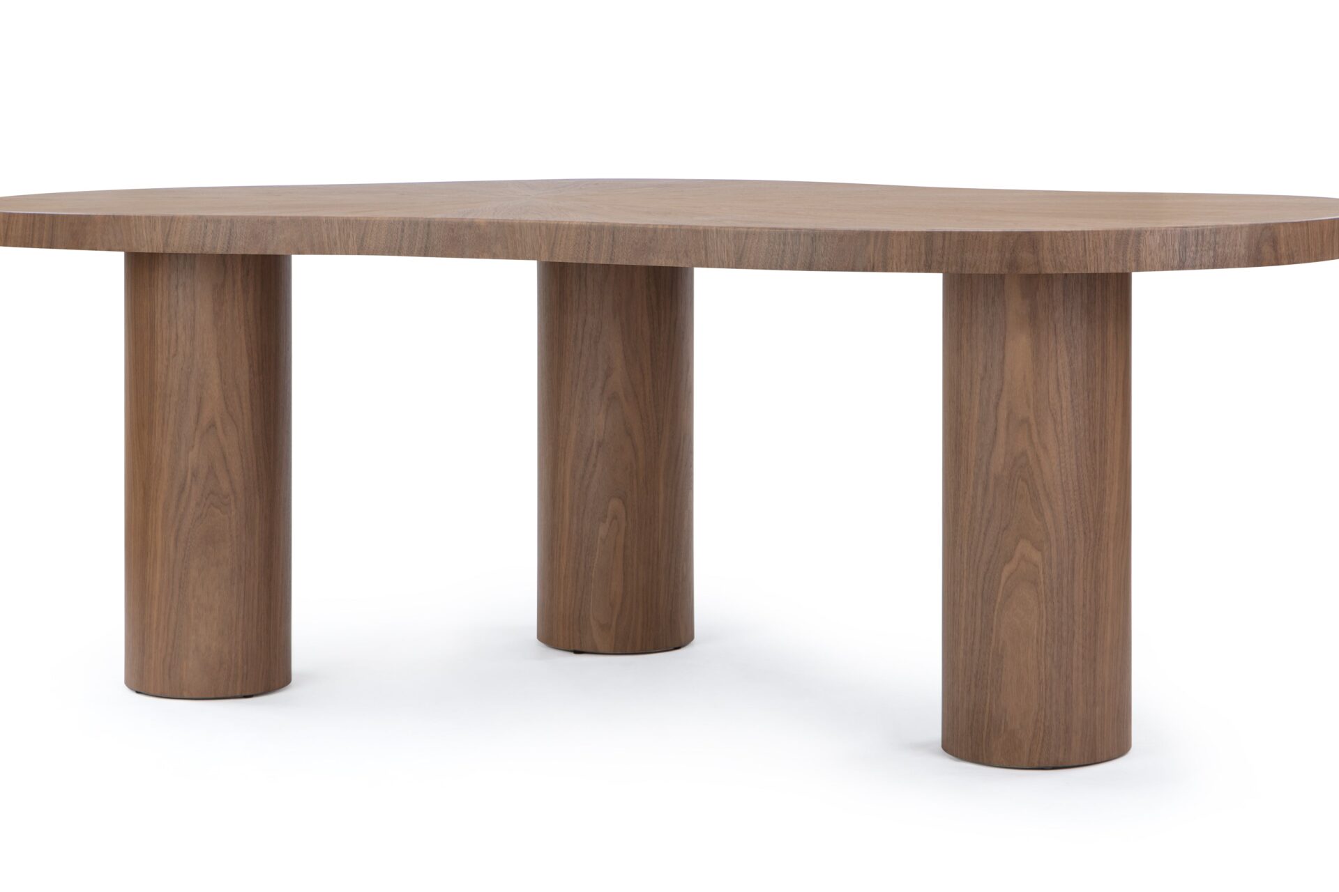 Experience the organic elegance and bold modern design of the Mezzo Dining Table. Crafted with a freeform tabletop of rich walnut veneer, this piece showcases a stunning starburst pattern that accentuates the natural beauty of the wood grain. Supported by three substantial cylindrical legs, this table exudes a sculptural presence that harmonizes fluid curves with architectural strength. Versatile and contemporary, the Mezzo Dining Table can grace your dining area or command attention as a focal point in an entryway or a creative workspace. Its warm wood tones, soft edges, and artistic design create a perfect match for interiors blending modern minimalism with natural textures.