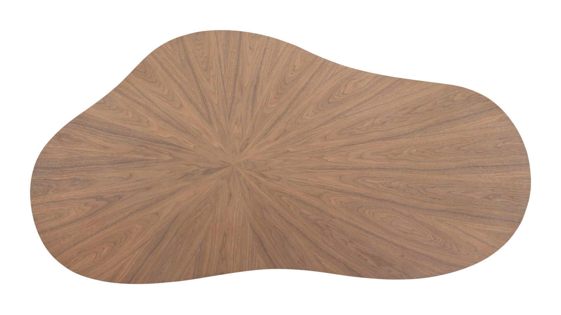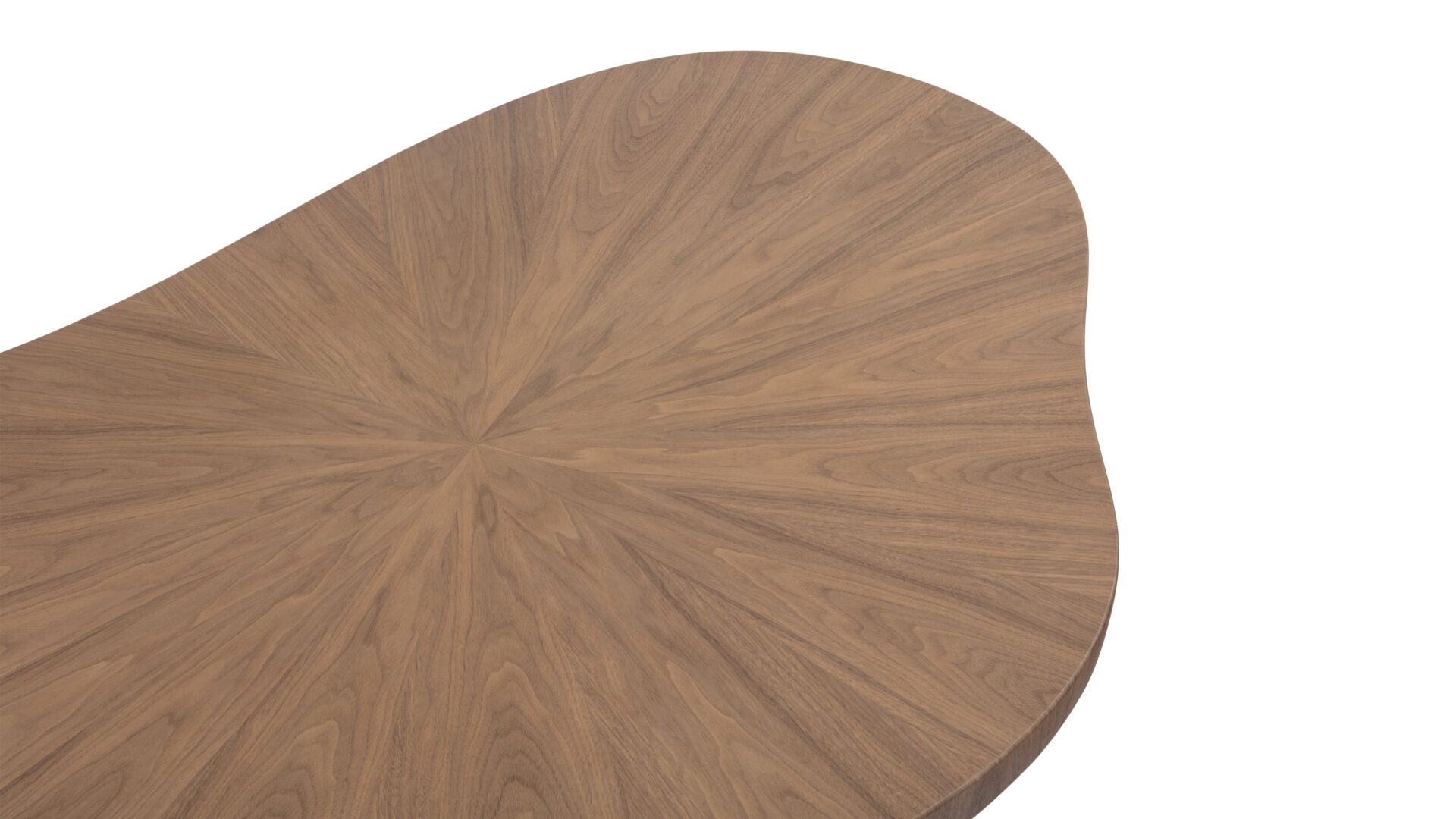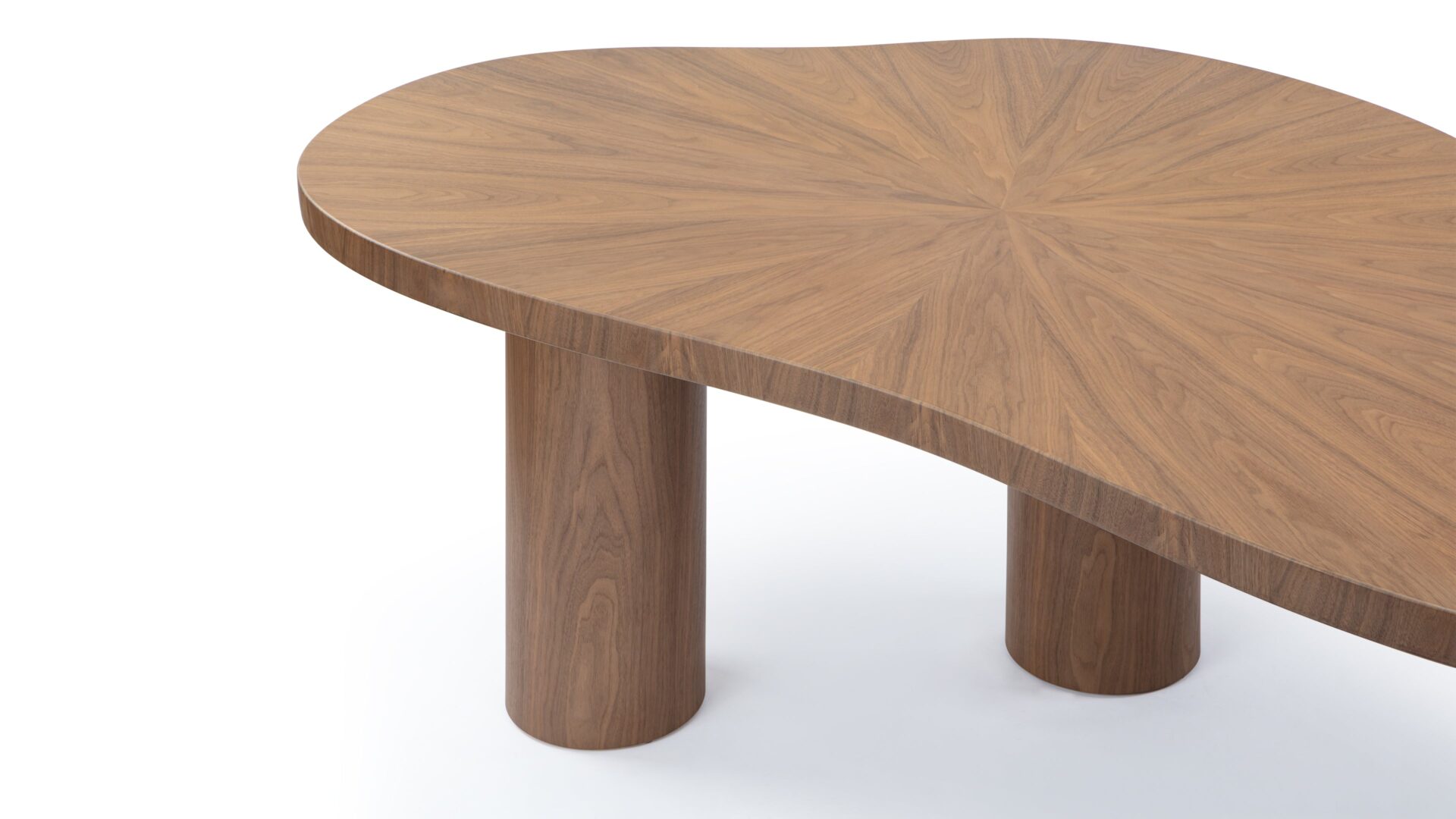 Indulge in the captivating blend of organic elegance and modern design with the Mezzo Dining Table. Its freeform walnut veneer top features a stunning starburst pattern, supported by robust cylindrical legs, creating a sculptural presence that blends artistic design with functionality. Versatile and contemporary, the Mezzo table is perfect for dining areas, entryways, or creative workspaces, embodying a harmonious fusion of modern minimalism and natural textures.
