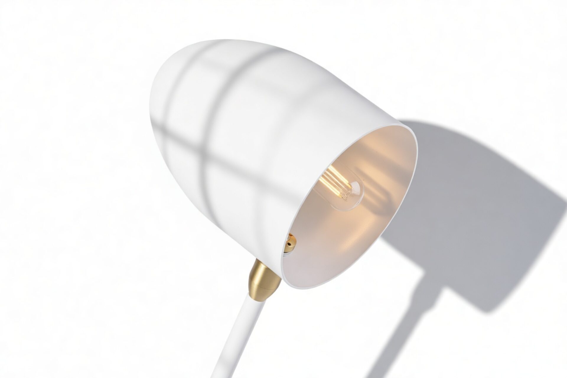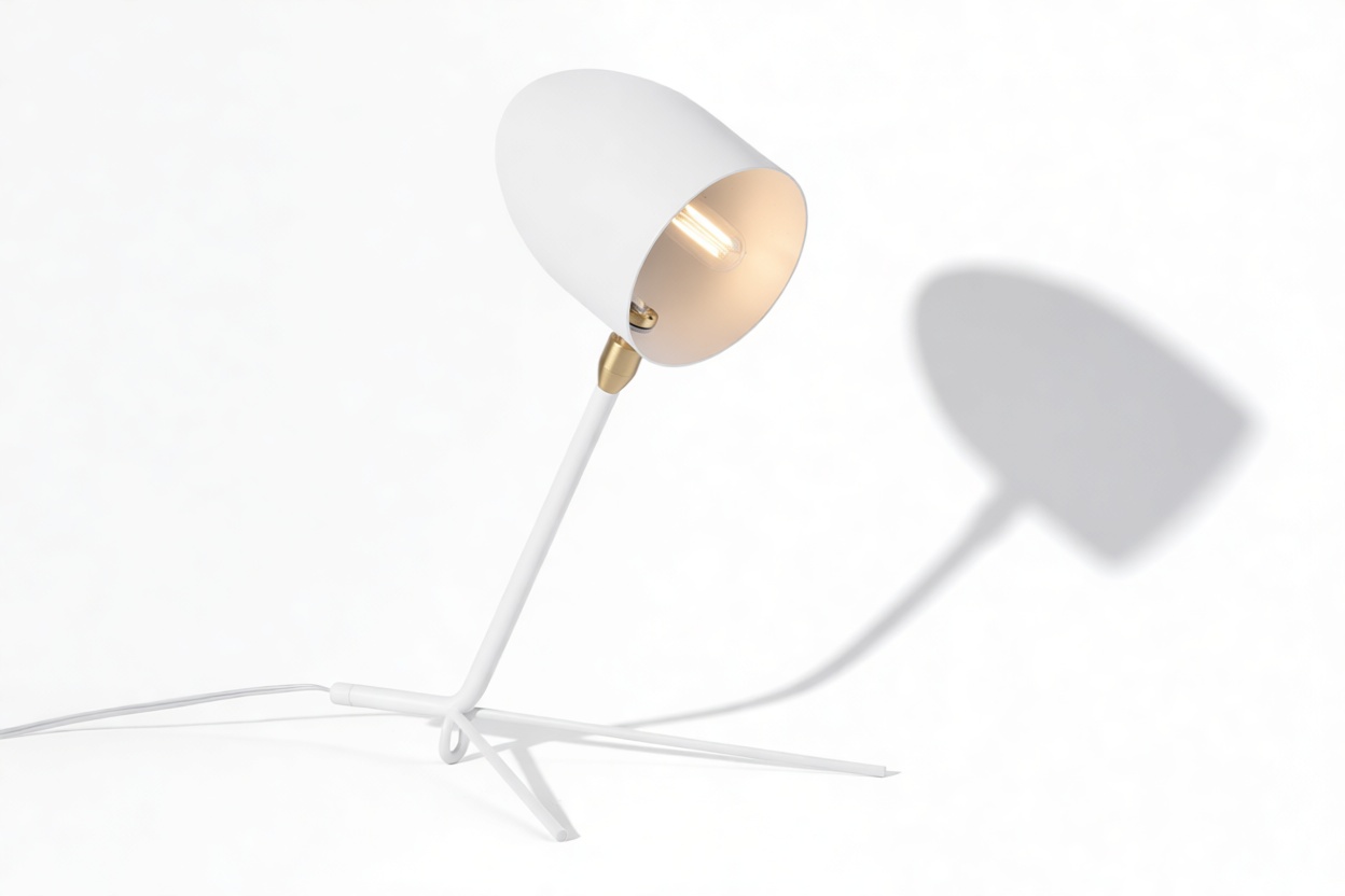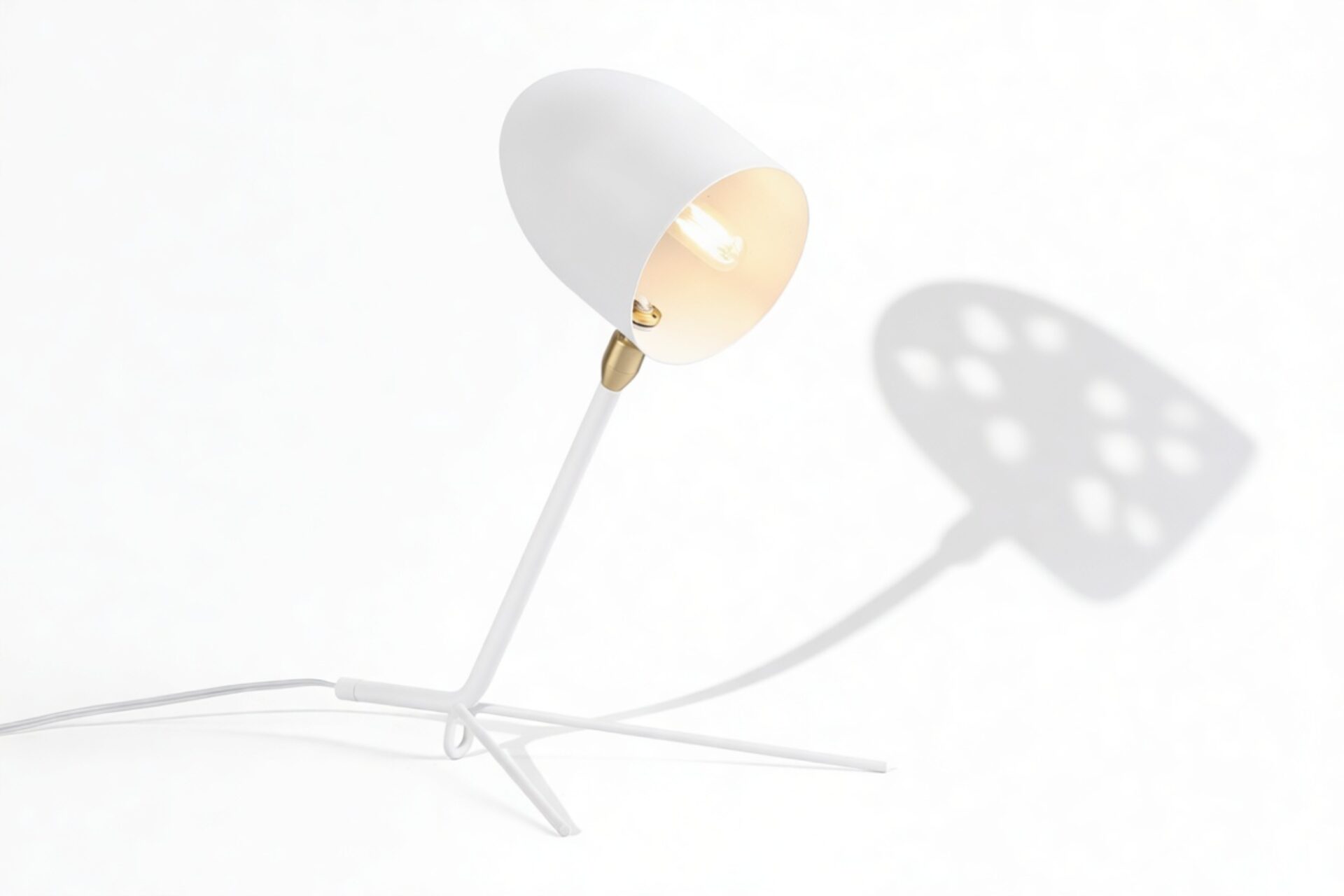 Introducing the Mouille Table Lamp, a stunning fusion of timeless sophistication and sculptural artistry that sets it apart from ordinary lighting fixtures. The classic yet modern design in white exudes elegance. Its tripod base ensures stability while the adjustable shade allows for versatile lighting options. Elevate any room with this sleek and stylish accent piece.