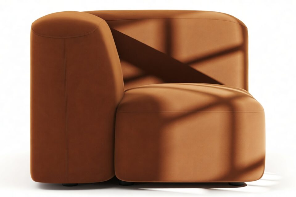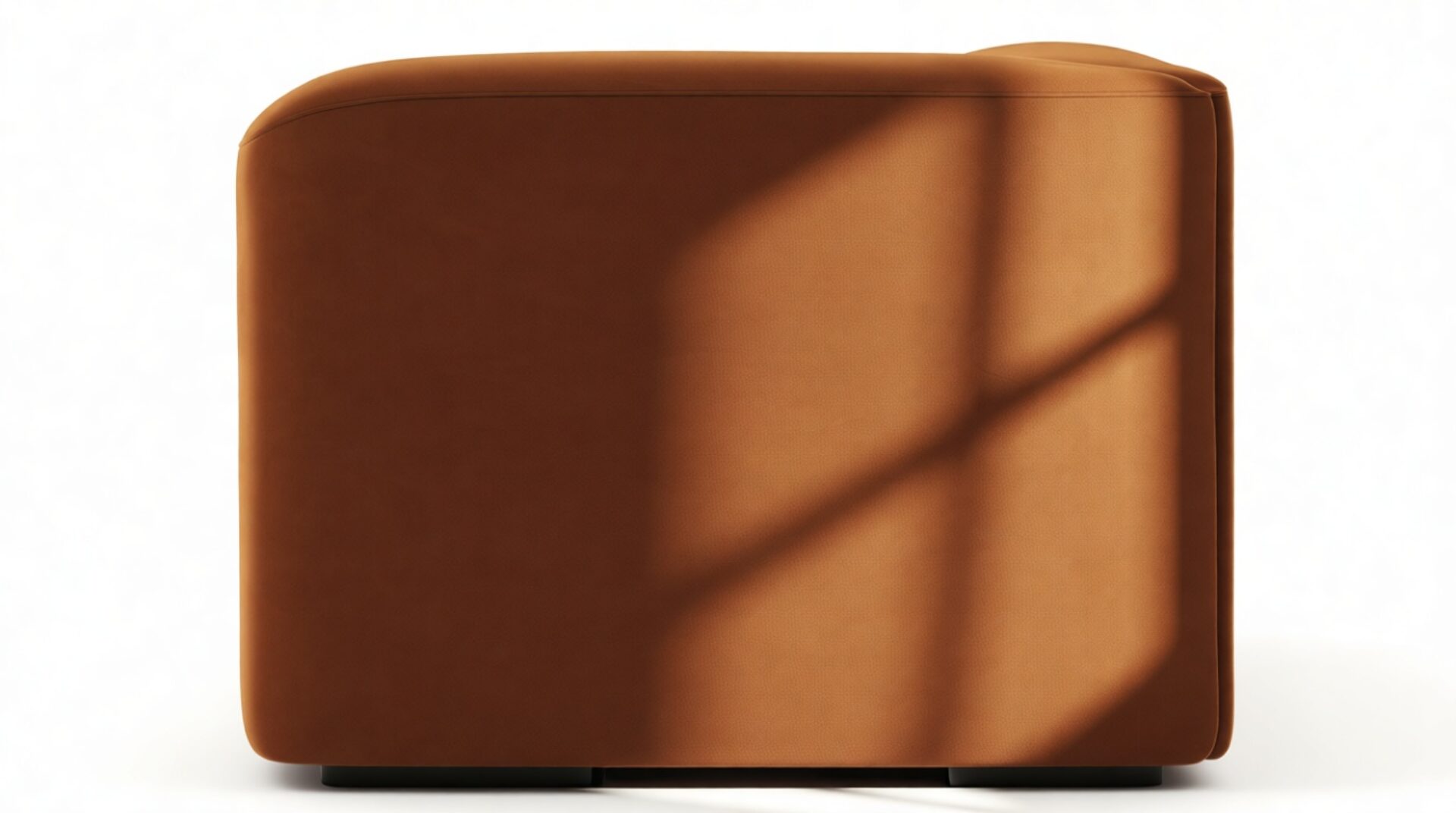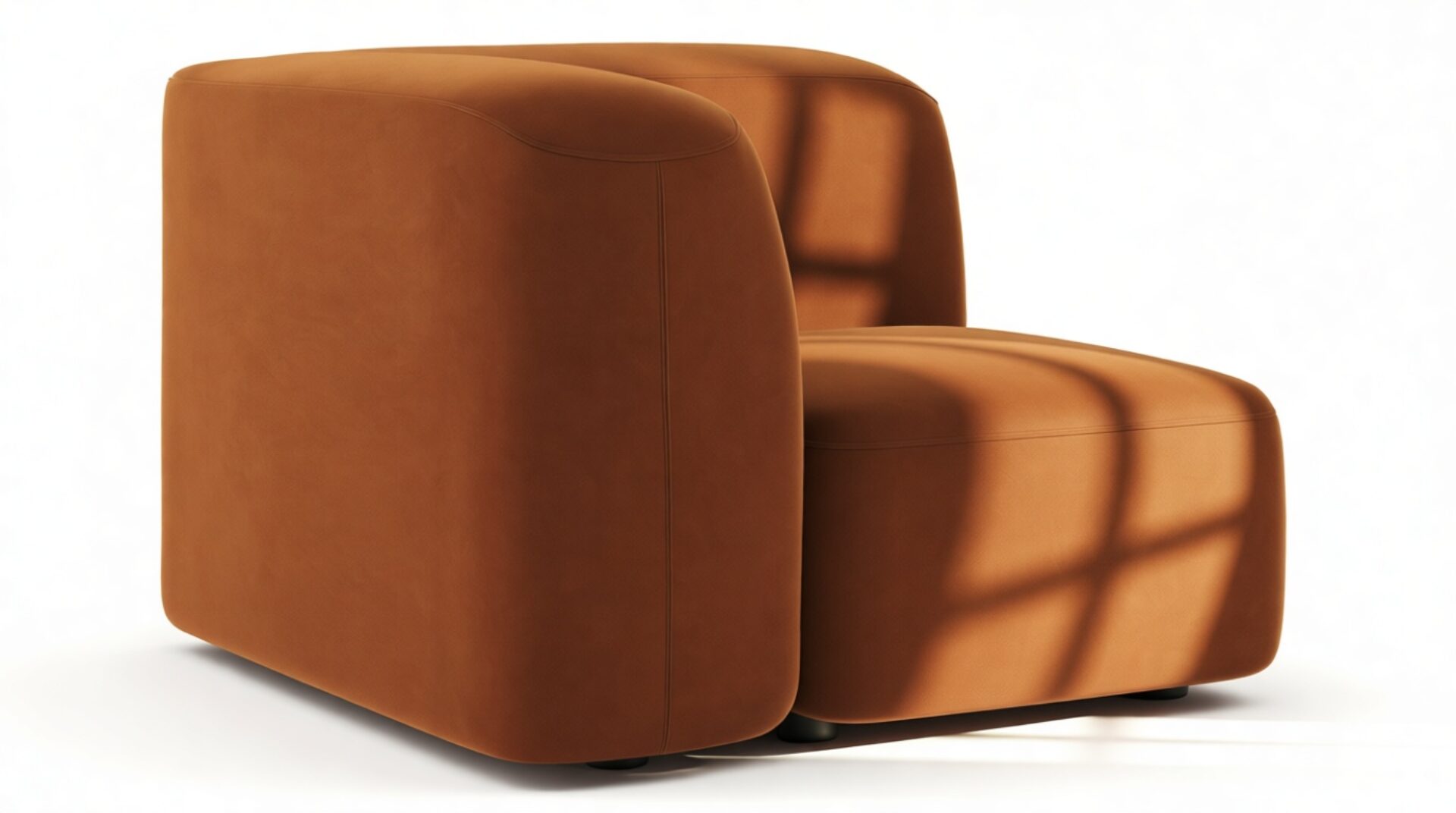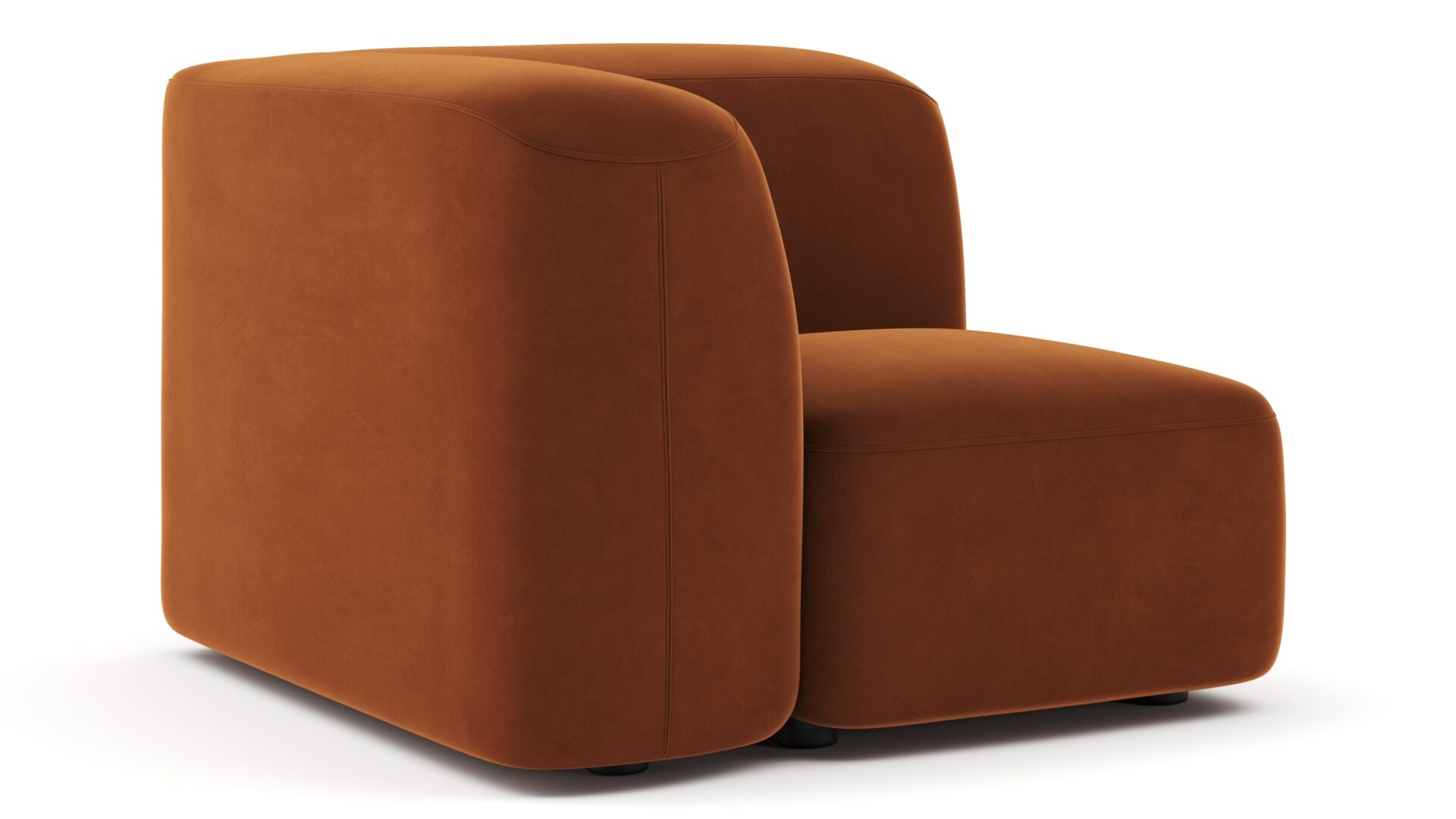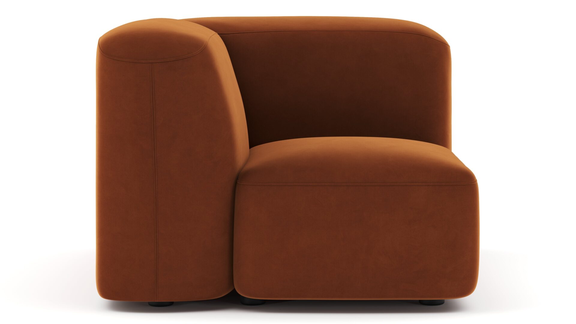 Sleek and eye-catching, the modules showcase plush velvet upholstery, sturdy arms, curved edges, and intricate stitching for both a tactile and visual allure. The burnt orange color infuses a hint of coziness and enduring elegance.