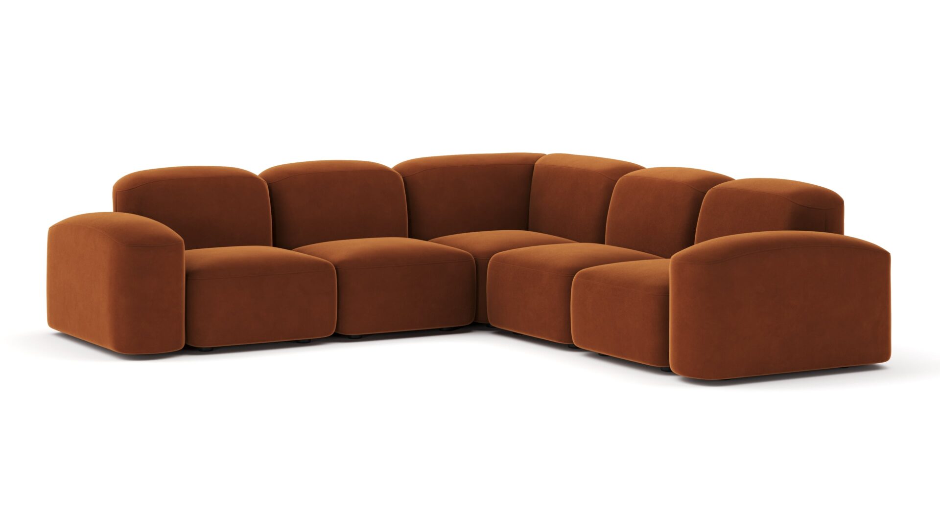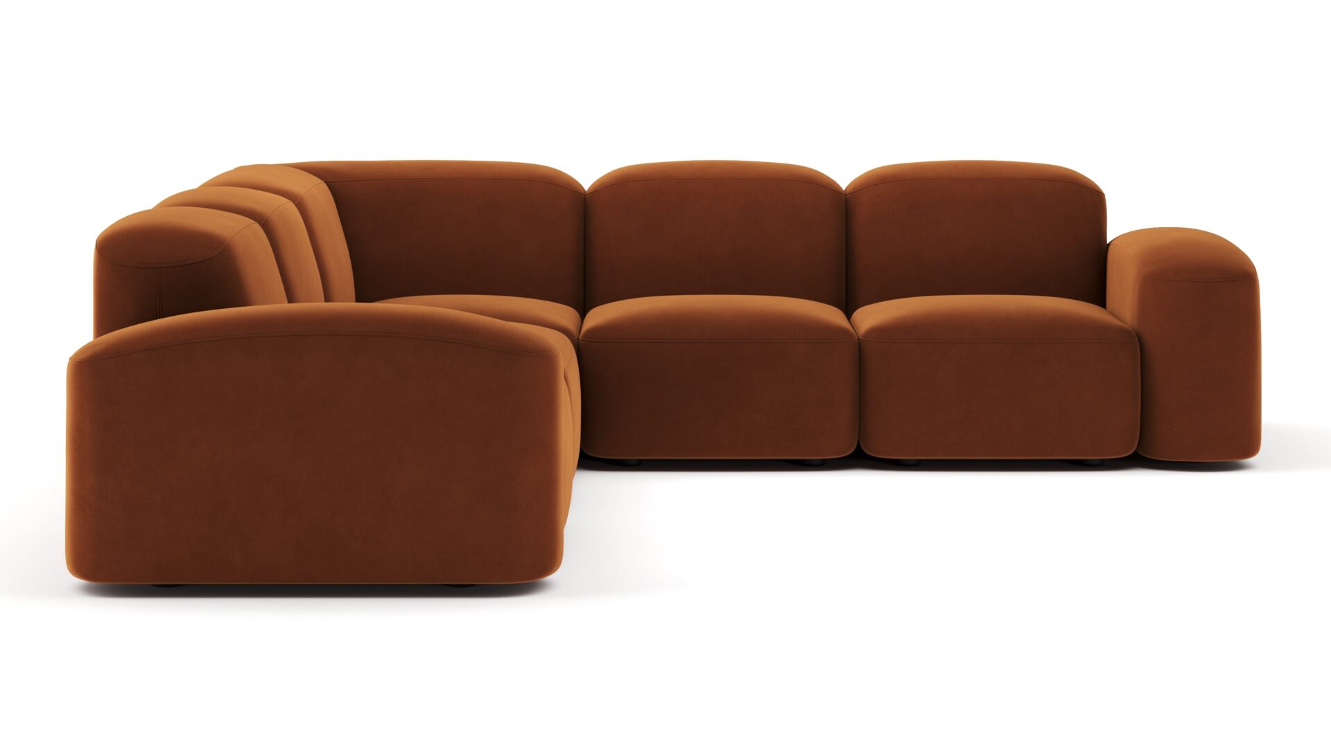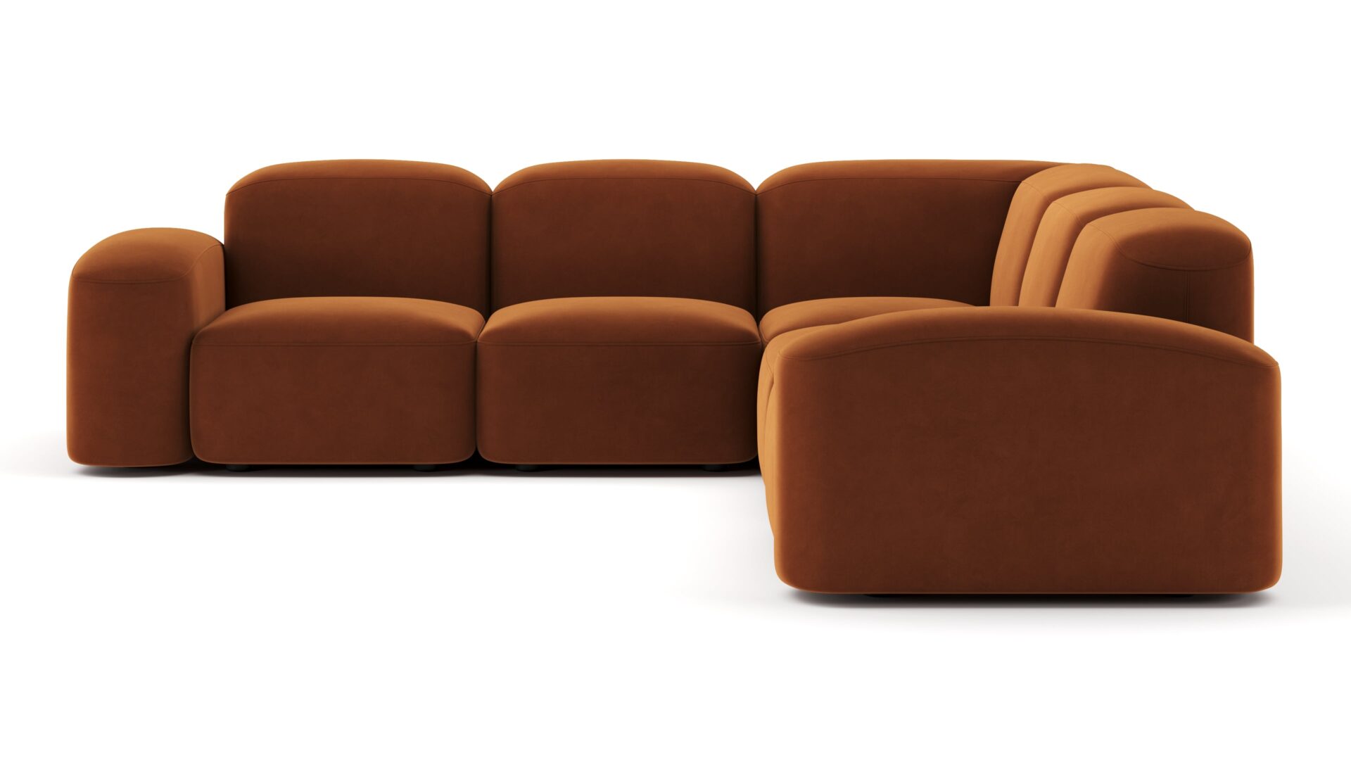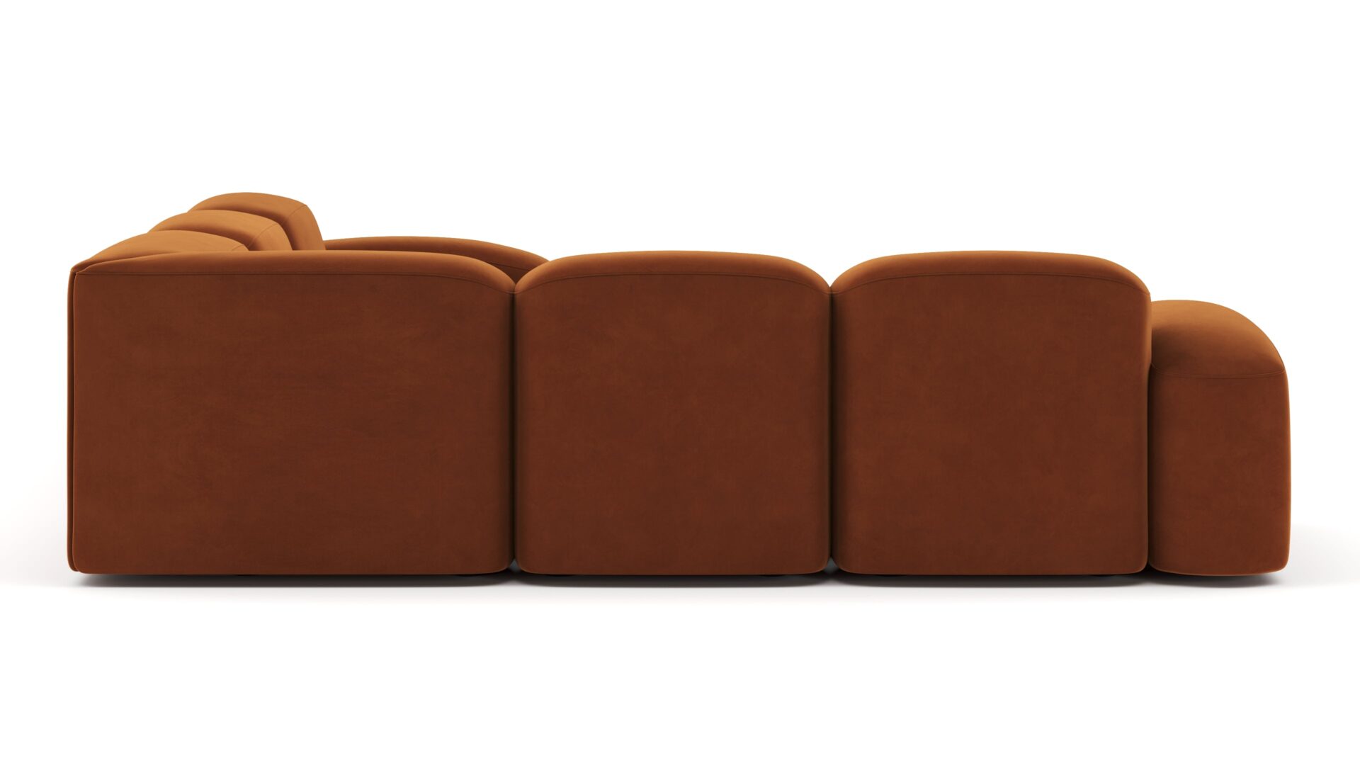 Sleek and eye-catching, the modules showcase plush velvet upholstery, sturdy arms, curved edges, and intricate stitching for both a tactile and visual allure. The burnt orange color infuses a hint of coziness and enduring elegance.