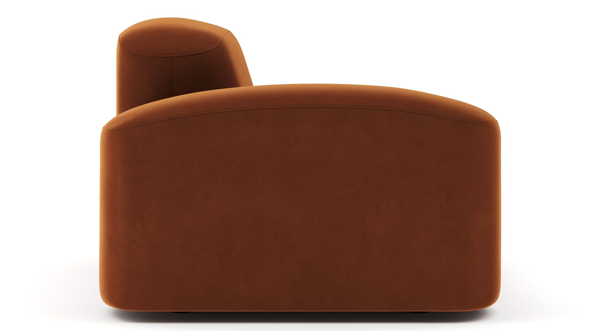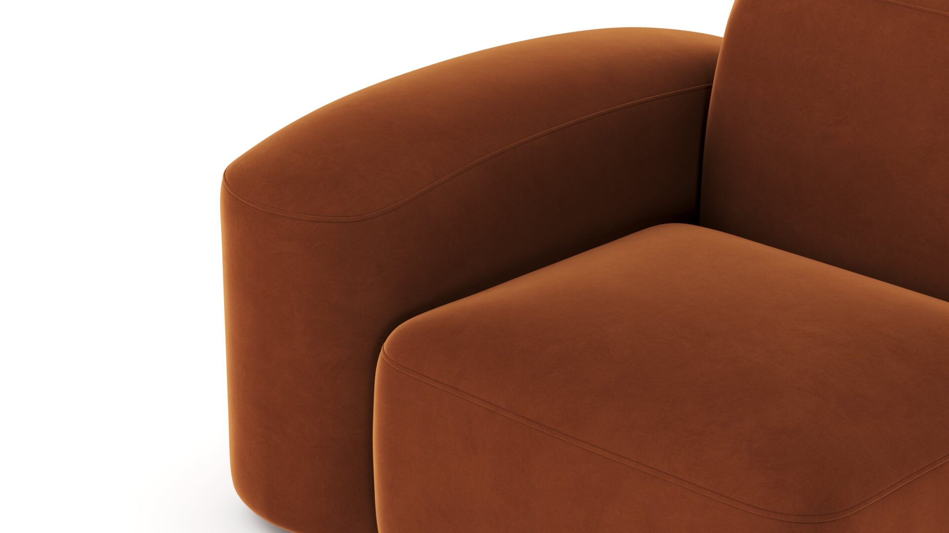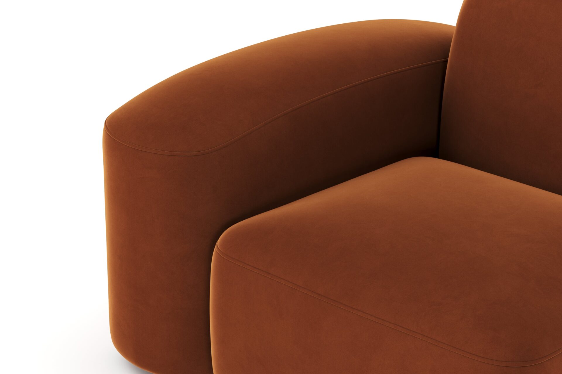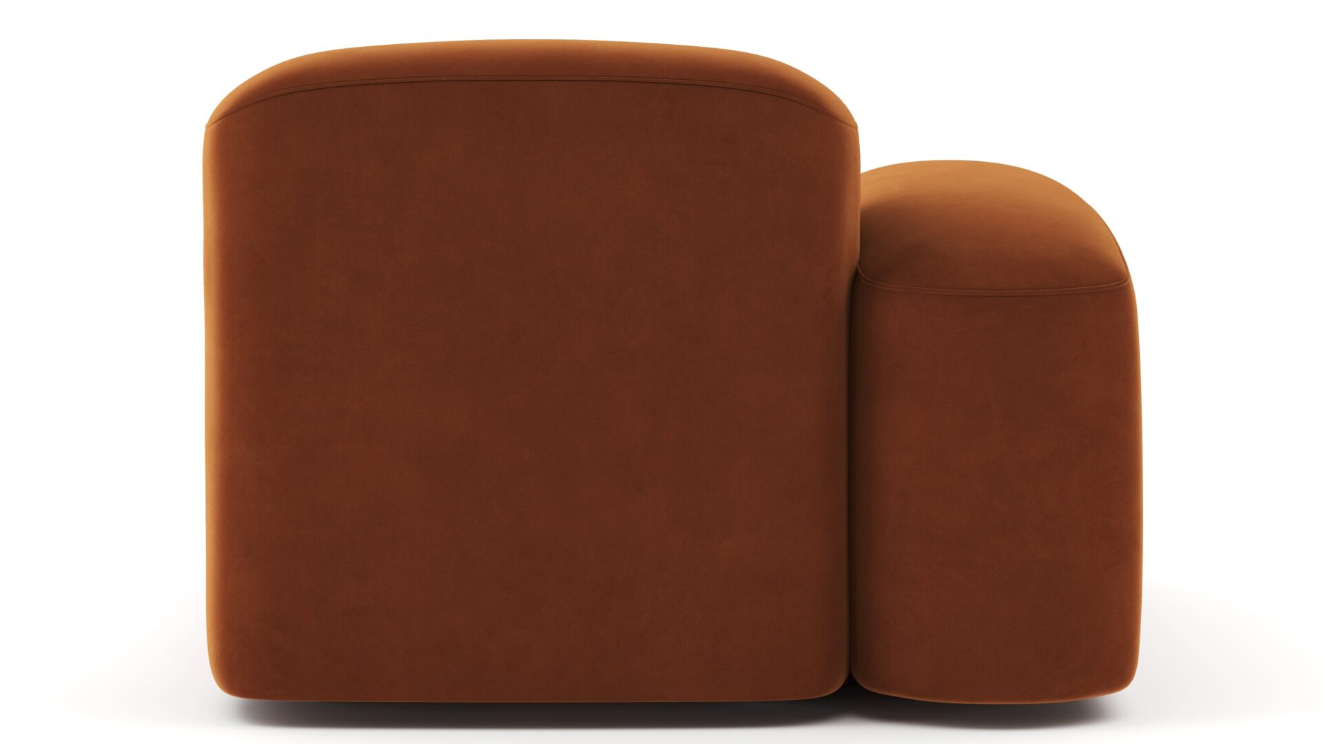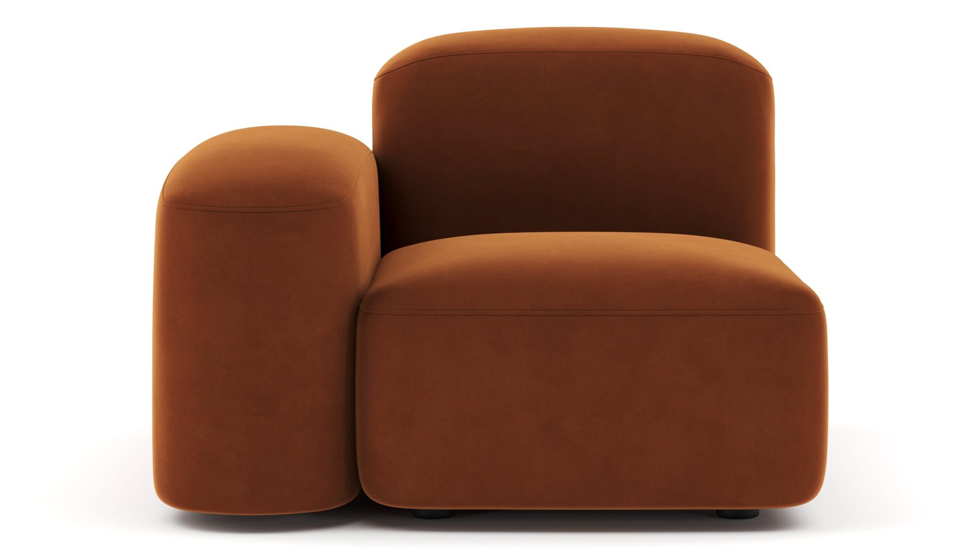 Sleek and eye-catching, the modules showcase plush velvet upholstery, sturdy arms, curved edges, and intricate stitching for both a tactile and visual allure. The burnt orange color infuses a hint of coziness and enduring elegance.