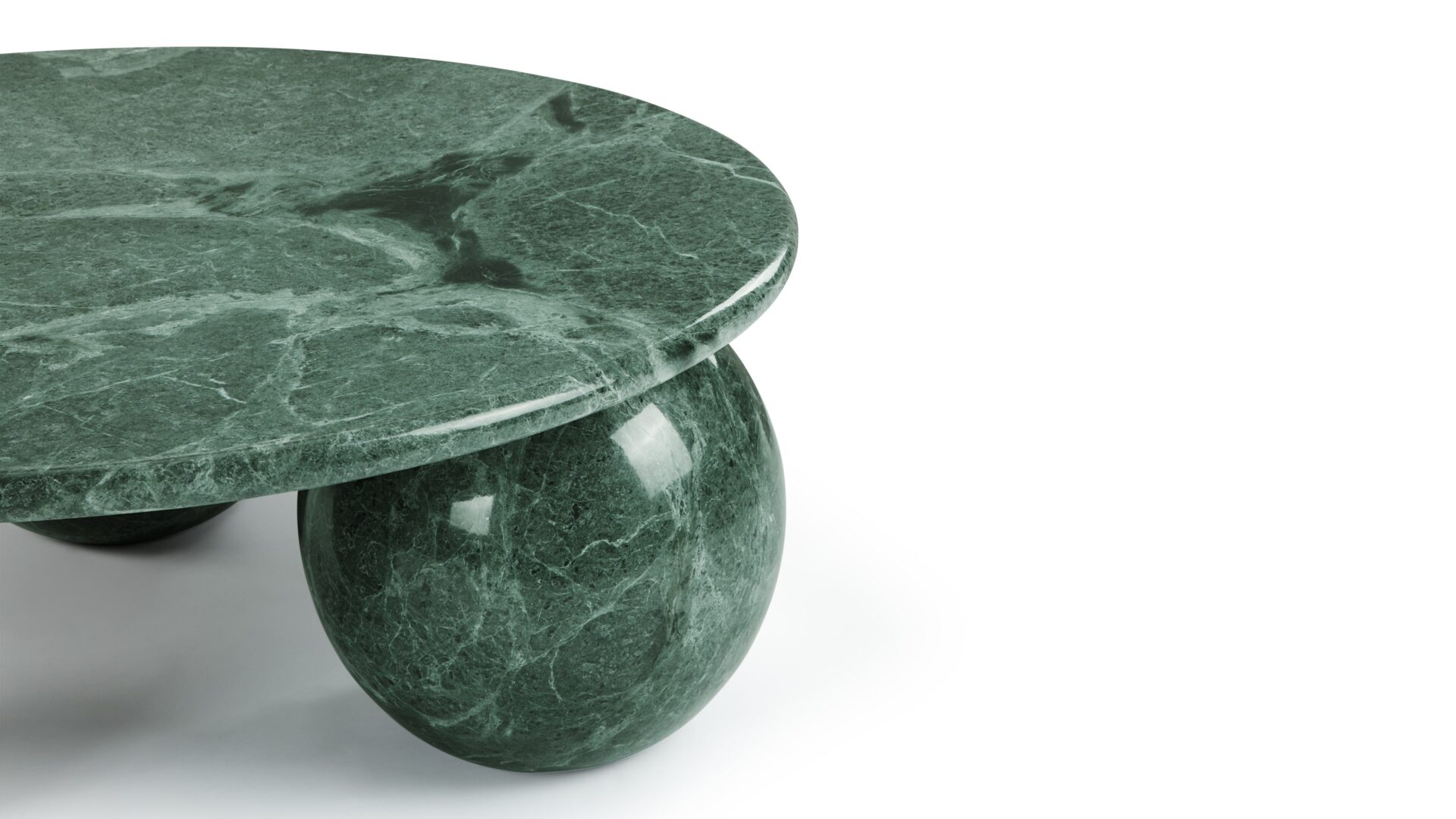 Introducing the exquisite Mya Coffee Table, a captivating fusion of contemporary design and natural beauty. Crafted from green marble, this striking piece emanates organic sophistication and elegance. Its expertly sculpted three-sphere base adds a touch of sculptural sophistication, while the round tabletop provides ample space for decor. Elevate your living space with the harmonious balance of style and functionality embodied by the Mya Coffee Table in Green Marble.