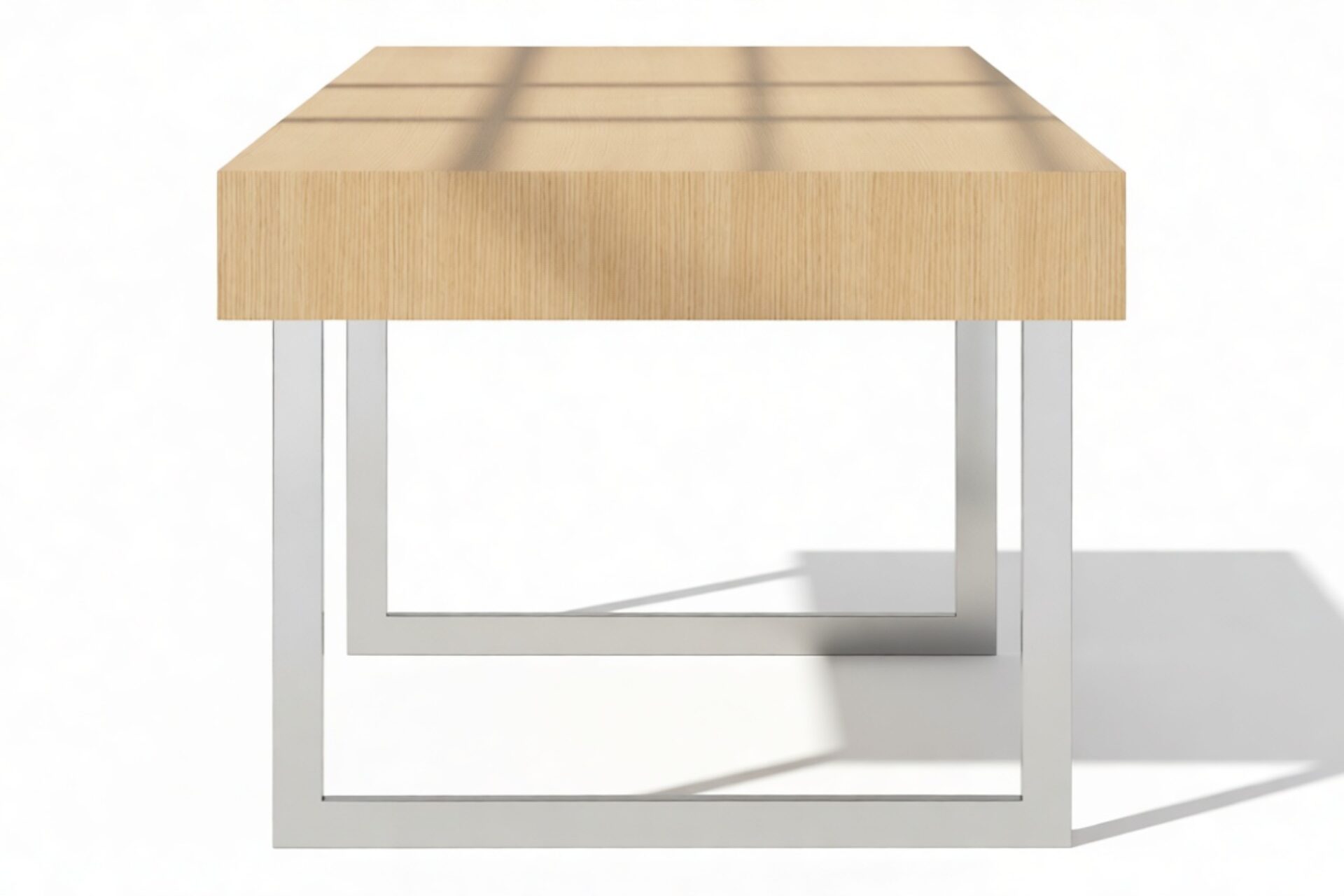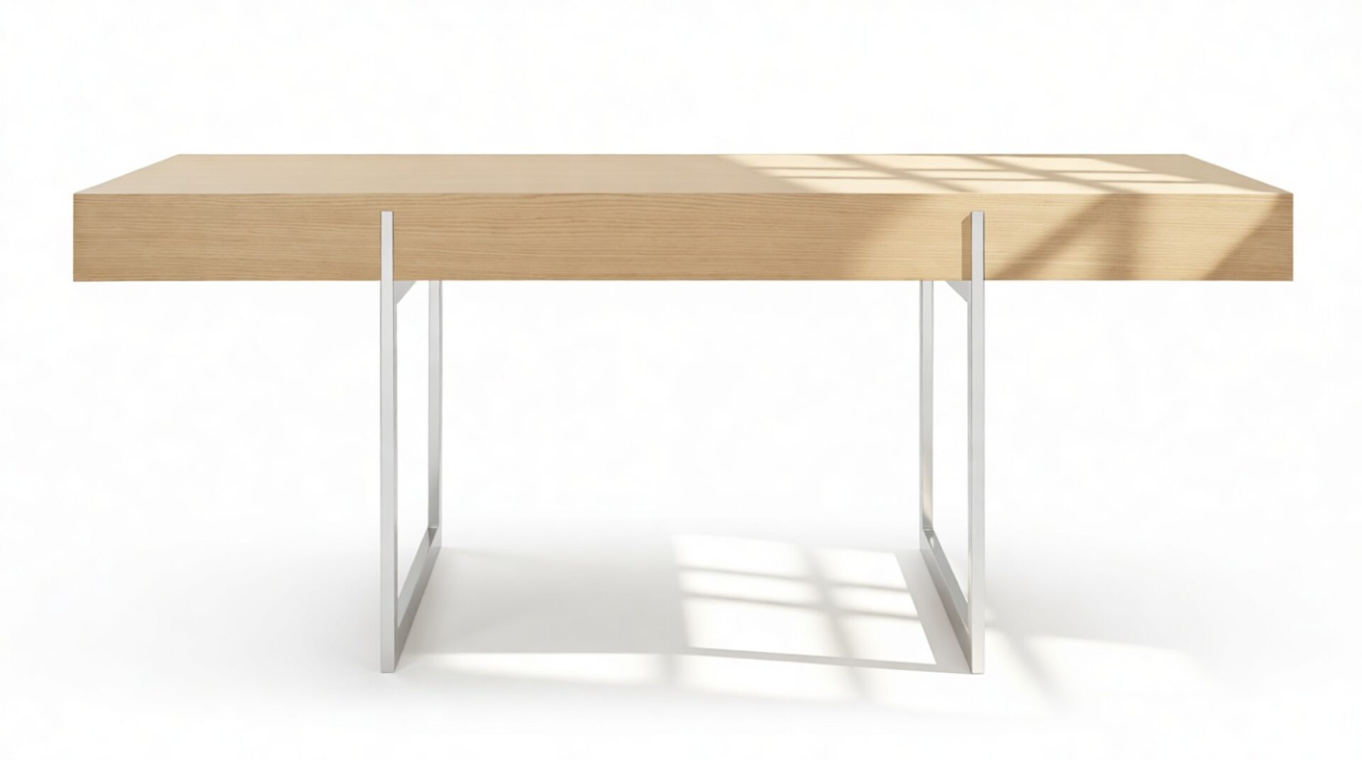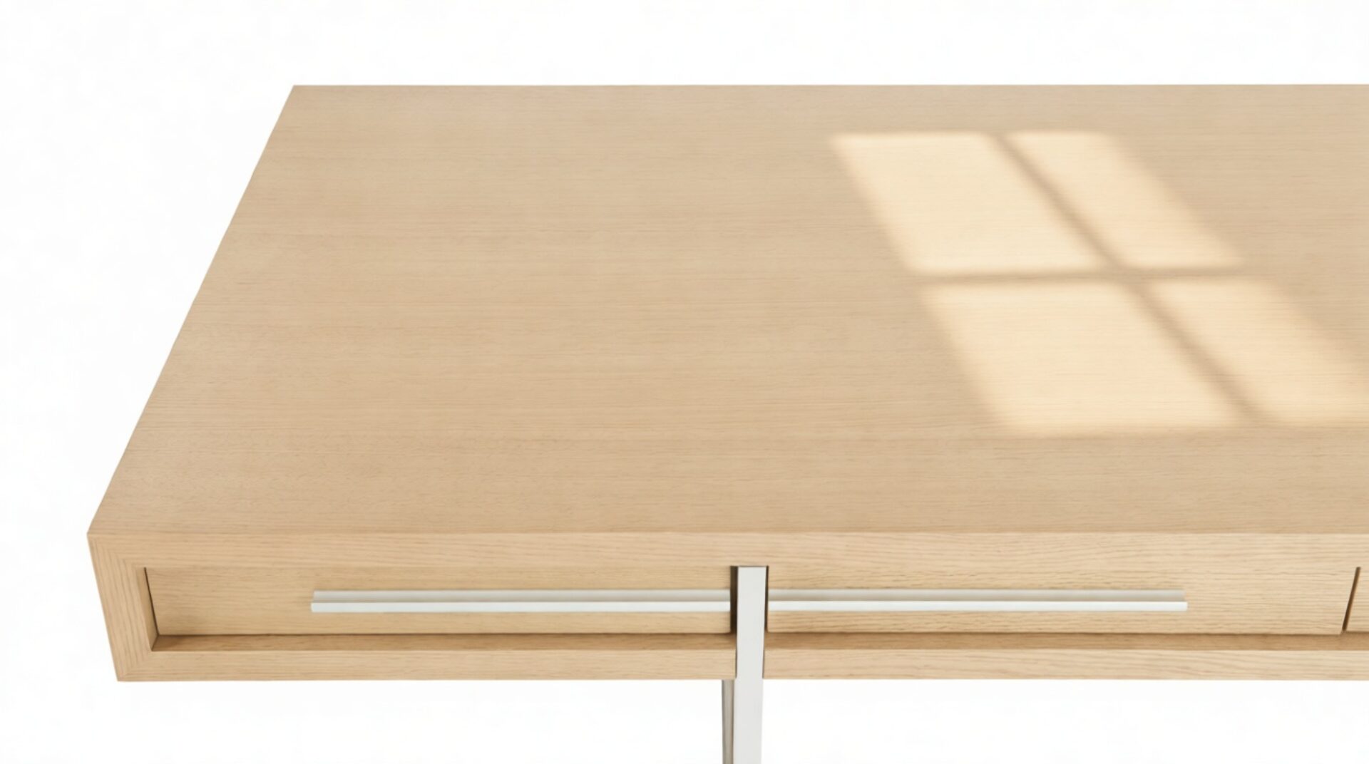 Enhance your workspace with the Naver Desk boasting a stunning natural oak veneer finish and seamlessly integrated stainless steel legs. The sleek and open design of the desk's base adds an airy touch, contributing to its light and modern aesthetic.